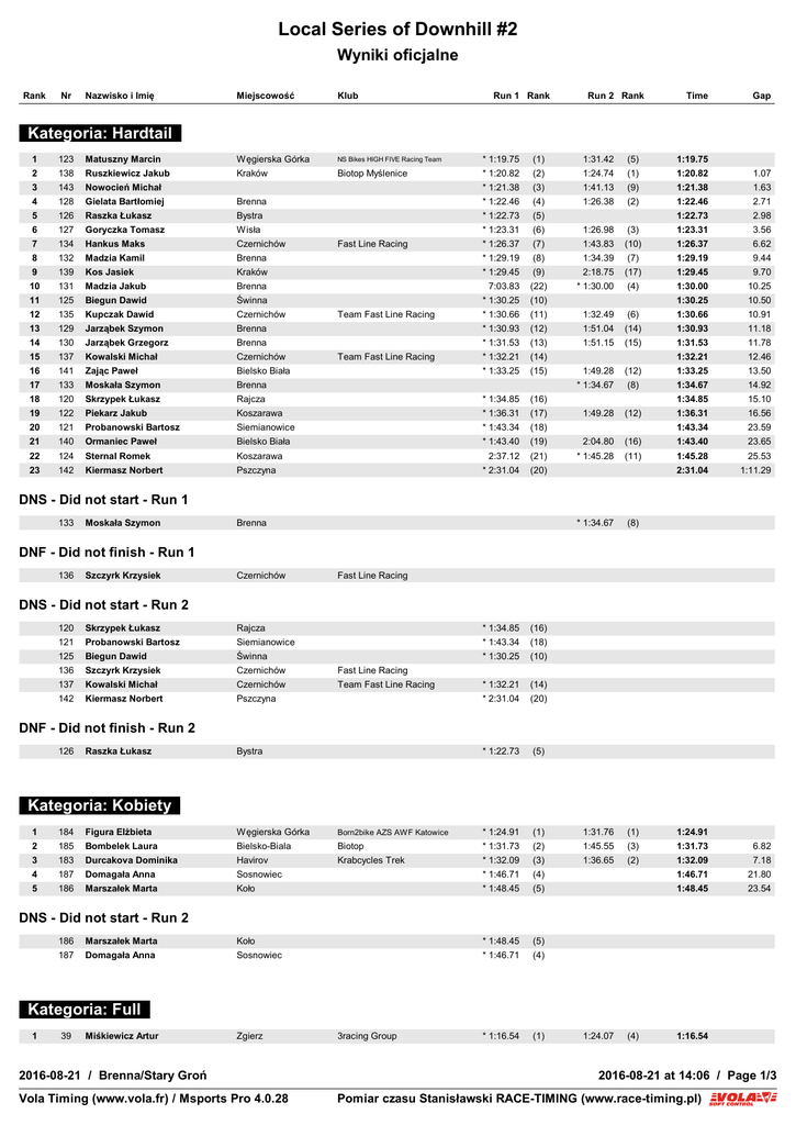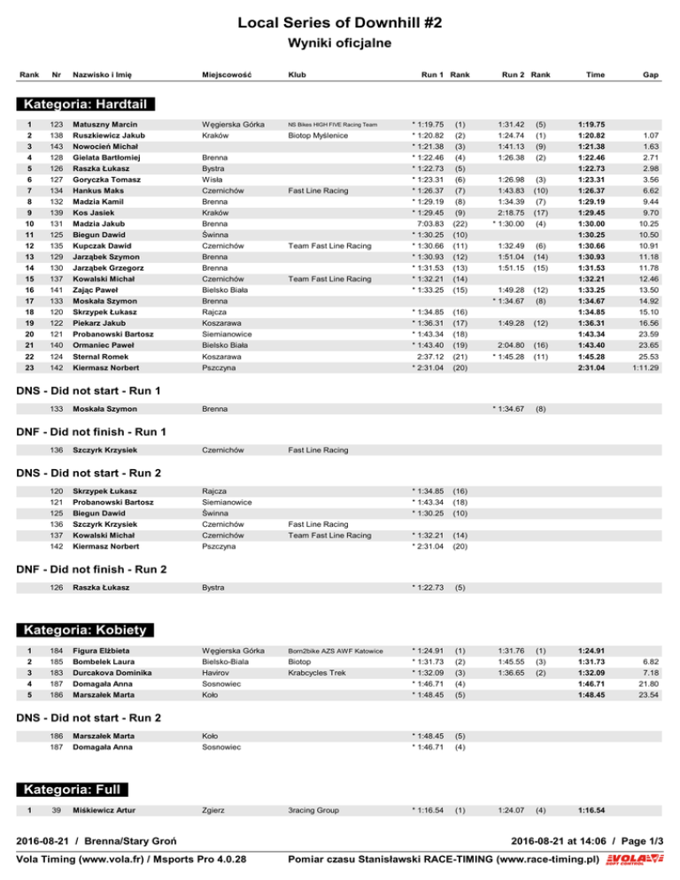Local Series of Downhill #2 Wyniki oficjalne Rank Nr Nazwisko i Imię Miejscowość Klub Run 1 Rank Run 2 Rank Time Gap Kategoria: Hardtail 1 123 Matuszny Marcin Węgierska Górka NS Bikes HIGH FIVE Racing Team * 1:19.75 (1) 1:31.42 (5) 1:19.75 2 138 Ruszkiewicz Jakub Kraków Biotop Myślenice * 1:20.82 (2) 1:24.74 (1) 1:20.82 1.07 3 143 Nowocień Michał * 1:21.38 (3) 1:41.13 (9) 1:21.38 1.63 4 128 Gielata Bartłomiej Brenna * 1:22.46 (4) 1:26.38 (2) 1:22.46 2.71 5 126 Raszka Łukasz Bystra * 1:22.73 (5) 1:22.73 2.98 6 127 Goryczka Tomasz Wisła * 1:23.31 (6) 1:26.98 (3) 1:23.31 3.56 7 134 Hankus Maks Czernichów * 1:26.37 (7) 1:43.83 (10) 1:26.37 6.62 8 132 Madzia Kamil Brenna * 1:29.19 (8) 1:34.39 (7) 1:29.19 9.44 9 139 Kos Jasiek Kraków * 1:29.45 (9) 2:18.75 (17) 1:29.45 9.70 10 131 Madzia Jakub Brenna 7:03.83 (22) * 1:30.00 (4) 1:30.00 10.25 11 125 Biegun Dawid Świnna * 1:30.25 (10) 1:30.25 10.50 12 135 Kupczak Dawid Czernichów * 1:30.66 (11) 1:32.49 (6) 1:30.66 10.91 13 129 Jarząbek Szymon Brenna * 1:30.93 (12) 1:51.04 (14) 1:30.93 11.18 14 130 Jarząbek Grzegorz Brenna * 1:31.53 (13) 1:51.15 (15) 1:31.53 11.78 15 137 Kowalski Michał Czernichów * 1:32.21 (14) 1:32.21 12.46 16 141 Zając Paweł Bielsko Biała * 1:33.25 (15) 17 133 Moskała Szymon Brenna 18 120 Skrzypek Łukasz Rajcza * 1:34.85 (16) 19 122 Piekarz Jakub Koszarawa * 1:36.31 (17) 20 121 Probanowski Bartosz Siemianowice * 1:43.34 (18) 21 140 Ormaniec Paweł Bielsko Biała * 1:43.40 (19) 2:04.80 22 124 Sternal Romek Koszarawa 2:37.12 (21) * 1:45.28 23 142 Kiermasz Norbert Pszczyna * 2:31.04 (20) Fast Line Racing Team Fast Line Racing Team Fast Line Racing 1:49.28 (12) 1:33.25 13.50 * 1:34.67 (8) 1:34.67 14.92 1:34.85 15.10 1:36.31 16.56 1:43.34 23.59 (16) 1:43.40 23.65 (11) 1:45.28 25.53 2:31.04 1:11.29 1:49.28 (12) DNS - Did not start - Run 1 133 Moskała Szymon Brenna * 1:34.67 (8) DNF - Did not finish - Run 1 136 Szczyrk Krzysiek Czernichów Fast Line Racing DNS - Did not start - Run 2 120 Skrzypek Łukasz Rajcza * 1:34.85 (16) 121 Probanowski Bartosz Siemianowice * 1:43.34 (18) 125 Biegun Dawid Świnna * 1:30.25 (10) 136 Szczyrk Krzysiek Czernichów Fast Line Racing 137 Kowalski Michał Czernichów Team Fast Line Racing * 1:32.21 (14) 142 Kiermasz Norbert Pszczyna * 2:31.04 (20) Bystra * 1:22.73 (5) DNF - Did not finish - Run 2 126 Raszka Łukasz Kategoria: Kobiety 1 184 Figura Elżbieta Węgierska Górka Born2bike AZS AWF Katowice * 1:24.91 (1) 1:31.76 (1) 1:24.91 2 185 Bombelek Laura Bielsko-Biala Biotop * 1:31.73 (2) 1:45.55 (3) 1:31.73 3 183 Durcakova Dominika Havirov Krabcycles Trek * 1:32.09 (3) 1:36.65 (2) 1:32.09 7.18 4 187 Domagała Anna Sosnowiec * 1:46.71 (4) 1:46.71 21.80 5 186 Marszałek Marta Koło * 1:48.45 (5) 1:48.45 23.54 6.82 DNS - Did not start - Run 2 186 Marszałek Marta Koło * 1:48.45 (5) 187 Domagała Anna Sosnowiec * 1:46.71 (4) * 1:16.54 (1) Kategoria: Full 1 39 Miśkiewicz Artur Zgierz 2016-08-21 / Brenna/Stary Groń Vola Timing (www.vola.fr) / Msports Pro 4.0.28 3racing Group 1:24.07 (4) 1:16.54 2016-08-21 at 14:06 / Page 1/3 VolaSoftControlPdf Pomiar czasu Stanisławski RACE-TIMING (www.race-timing.pl) Local Series of Downhill #2 Wyniki oficjalne Rank Nr Nazwisko i Imię Miejscowość Klub Time Gap 2 28 Pekar Jakub Karolinka ROCKBIKE CZ 1:17.61 (3) 3 48 Wojtas Łukasz Bielsko Biała Biotop * 1:17.53 (2) 1:17.21 0.67 1:17.53 4 7 Tlałka Tomasz Rajcza High Five Racing Team * 1:17.61 (3) 0.99 1:17.61 5 36 Kołtowski Damian Bielsko-Biała Infernal Team * 1:17.75 (5) 1.07 1:17.75 6 3 Nytra Wojtek Cieszyn * 1:18.17 (6) 1:32.28 1.21 (12) 1:18.17 7 27 Wroniak Wojciech Wołomin * 1:18.33 (7) 1.63 2:03.56 (51) 1:18.33 8 10 Sokalski Adrian Chełm Śląski * 1:18.34 1.79 (8) 1:39.88 (32) 1:18.34 9 65 Oślizło Adam Jastrzębie-Zdrój 1.80 * 1:18.36 (9) 1:22.20 (2) 1:18.36 10 22 Raszyk Tomasz 1.82 Wisła * 1:18.54 (10) 1:42.89 (36) 1:18.54 11 17 2.00 Gabzdyl Józef Simoradz * 1:18.70 (11) 1:22.71 (3) 1:18.70 12 2.16 46 Rajzer Łukasz Kraków * 1:19.11 (12) 1:19.11 2.57 13 44 Ferfecki Dominik Brenna * 1:19.19 (13) 1:31.03 (11) 1:19.19 2.65 14 26 Kuciel Leonard Trzebinia * 1:19.37 (14) 1:34.19 (19) 1:19.37 2.83 15 4 Gronkiewicz Łukasz Kobiernice * 1:19.51 (15) 1:39.48 (30) 1:19.51 2.97 16 43 Madzia Mateusz Brenna * 1:19.65 (16) 1:28.23 (6) 1:19.65 3.11 17 68 Komendera Mateusz Roczyny * 1:19.69 (17) 1:30.85 (9) 1:19.69 3.15 18 2 Bojko Mateusz Cieszyn * 1:20.34 (18) 1:38.44 (27) 1:20.34 3.80 19 5 Sitarz Konrad Kobiernice * 1:20.42 (19) 1:30.29 (8) 1:20.42 3.88 20 51 Juraszek Wiktor Bielsko - Biała * 1:21.11 (20) 1:21.11 4.57 21 31 Dubiel Wojciech Zawada * 1:21.13 (21) 2:09.01 (52) 1:21.13 4.59 22 19 Włodarski Jan Bielsko-Biała * 1:21.43 (22) 1:33.09 (14) 1:21.43 4.89 23 62 Madejczyk Borys Wisła * 1:21.66 (23) 1:28.97 (7) 1:21.66 5.12 24 14 Tlałka Marek Rajcza * 1:22.32 (24) 1:22.32 5.78 25 45 Bajor Wojciech Krzywaczka * 1:22.47 (25) 1:38.56 (28) 1:22.47 5.93 26 54 Kosek Mateusz Kalwaria Zebrzydowska Born 2 Bike * 1:23.03 (26) 1:46.34 (41) 1:23.03 6.49 27 60 Gamża Kamil Skrzyszów Mitko MTB * 1:23.29 (27) 1:35.49 (21) 1:23.29 6.75 28 30 Pęcikiewicz Mateusz Żywiec * 1:23.32 (28) 1:23.32 6.78 29 18 Klaus Grzegorz Cieszyn * 1:23.34 (29) 1:25.85 (5) 1:23.34 6.80 30 15 Barchański Adam Cieszyn * 1:23.50 (30) 1:36.39 (24) 1:23.50 6.96 31 52 Łukasik Piotr Sosnowiec * 1:23.75 (31) 1:23.75 7.21 32 33 Olejnik Krzysztof Świętochłowice * 1:23.79 (32) 2:19.55 (54) 1:23.79 7.25 33 40 Kaczmarczyk Krzysztof Kriss Kraków * 1:24.52 (33) 1:35.78 (22) 1:24.52 7.98 33 13 Szczerbowski Michał Czechowice-Dziedzice IF Infernal * 1:24.52 (33) 1:24.52 7.98 35 35 Hudaszek Patryk Krzyszkowice * 1:24.70 (35) 1:39.50 (31) 1:24.70 8.16 36 42 Ścieszka Adrian Żywiec Asphyxiated * 1:24.79 (36) 2:17.48 (53) 1:24.79 8.25 37 61 Krajcarz Łukasz Żywiec Infernal * 1:24.96 (37) 1:39.18 (29) 1:24.96 8.42 38 38 Raszka Szymon Bystra * 1:25.26 (38) 1:33.12 (15) 1:25.26 8.72 39 55 Graboń Grzegorz Międzybrodzie Bialskie * 1:2