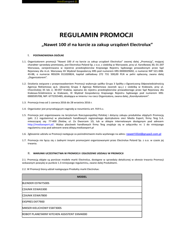 REGULAMIN PROMOCJI „Nawet 100 zł na karcie za zakup urządzeń Electrolux” I. POSTANOWIENIA OGÓLNE 1.1. Organizatorem promocji "Nawet 100 zł na karcie za zakup urządzeń Electrolux" zwanej dalej „Promocją”, mającej charakter sprzedaży premiowej, jest Electrolux Poland Sp. z o.o. z siedzibą w Warszawie, przy ul. Karolkowej 30, 01-207 Warszawa, zarejestrowana w rejestrze przedsiębiorców Krajowego Rejestru Sądowego prowadzonym przez Sąd Rejonowy dla m.st. Warszawy XII Wydział Gospodarczy KRS pod numerem KRS 0000029692, o numerze NIP 521-00843-88, o numerze REGON 011020824, kapitał zakładowy 272 731 500,00 PLN w pełni opłacony, zwana dalej „Organizatorem”. 1.2. Działania związane z przeprowadzeniem Promocji wykonuje spółka Grupa 3 Spółka z Ograniczoną Odpowiedzialnością Agencja Reklamowa sp.k. (dawniej Grupa 3 Agencja Reklamowa Jasonek sp.j.) z siedzibą w Krakowie, przy ul. Chocimskiej 35 lok. 2, 30-057 Kraków, wpisana do rejestru przedsiębiorców prowadzonego przez Sąd Rejonowy dla Krakowa-Śródmieścia w Krakowie, XI Wydział Gospodarczy Krajowego Rejestru Sądowego pod numerem KRS: 0000595708, NIP: 6772355485, działająca w imieniu i na rzecz Organizatora, zwana dalej „Koordynatorem”. 1.3. Promocja trwa od 1 czerwca 2016 do 28 września 2016 r. 1.4. Organizator jest przyrzekającym nagrodę w rozumieniu art. 919 k.c. 1.5. Promocja jest organizowana na terytorium Rzeczypospolitej Polskiej i dotyczy zakupu produktów objętych Promocją (pkt. 2.1 regulaminu) w placówkach handlowych regionalnego dystrybutora sieci Media Expert, firmy Terg S.A. mieszczącej się: 77-400 Złotów, ul. Za Dworcem 1D, lub w sklepie internetowym dostępnym pod adresem http://mediaexpert.pl/. Wykaz placówek handlowych firmy Terg znajduje się w załączniku nr. 1 do niniejszego regulaminu oraz pod adresem www.sklepy.mediaexpert.pl 1.6. Zgłoszenie udziału w Promocji następuje za pośrednictwem maila wysłanego na adres: [email protected] 1.7. Promocja nie łączy się z żadnymi innymi promocjami organizowanymi przez Electrolux Poland Sp. z o.o. w czasie jej trwania. II. WARUNKI UCZESTNICTWA W PROMOCJI I ZGŁOSZENIE UDZIAŁU W PROMOCJI 2.1. Promocją objęte są poniższe modele marki Electrolux, dostępne w sprzedaży detalicznej w okresie trwania Promocji wskazanym powyżej w punkcie 1.3 niniejszego regulaminu, zwane dalej Produktami. 2.2. W Promocji biorą udział następujące Produkty marki Electrolux: MODEL BLENDER ESTM7500S CZAJNIK EEWA5300 CZAJNIK EEWA7800 EKSPRES EKF7900 MIKSER KIELICHOWY ESB7300S ROBOT PLANETARNY KITCHEN ASSISTENT EKM4000 ROBOT PLANETARNY KITCHEN ASSISTENT EKM4200 ROBOT PLANETARNY KITCHEN ASSISTENT EKM4600 TOSTER EAT7800 ŻELAZKO EDBS3350 GENERATOR PARY EDBS7146GR ŻELAZKO EDB6146 ŻELAZKO EDB6150 2.3. Promocja jest przeznaczona wyłącznie dla osób fizycznych, które spełniają wszystkie poniższe warunki: a) ukończyły 18 rok życia; b) posiadają miejsce zamieszkania na terytorium Rzeczypospolitej Polskiej; c) posiadają pełną zdolność do czynności prawnych; d) kupią Produkt/Produkty wymieniony w punkcie 2.2 regulaminu, jako konsumenci w rozumieniu art. 221 kodeksu cywilnego (ustawa z dn. 16 kwietnia 1964 r. Kodeks cywilny, Dz.U. Nr 16, poz. 93 z późn. zm.), w terminie trwania promocji, tj. od 1 czerwca 2016 do 20 września 2016 r. e) dokonają zgłoszenia do Promocji Produktu/Produktów zakupionego/zakupionych przez siebie w czasie trwania Promocji, za pośrednictwem wiadomości e-mail wysłanej na adres: [email protected] w ciągu 7 dni od daty zakupu (data z paragonu/faktury) urządzeń objętych promocją, jednak nie później jak do 5 października 2016 roku. Zgłoszenie musi być wysłane w formie wiadomości e-mail do której będzie załączona zeskanowana Faktura VAT lub paragon oraz zeskanowany Formularz Rejestracyjny. Formularz Rejestracyjny, aby być ważnym, musi posiadać odręczny podpis uczestnika promocji, oraz zawierać wypełnione wszystkie obowiązkowe (oznaczone gwiazdką*) dane, czyli: imię, nazwisko, adres zamieszkania lub adres do korespondencji (miejscowość, ulica, numer domu lub lokalu, kod pocztowy), numer telefonu kontaktowego, adres e-mail, numer dowodu zakupu (paragonu/Faktury VAT), symbol (model) zakupionego Produktu/Produktów i numer seryjny urządzenia/urządzeń (umieszczony na tabliczce znamionowej / S. -NO.)*. Z momentem zatwierdzenia formularza rejestracyjnego, osoba spełniająca wszystkie warunki, o których mowa w niniejszym punkcie 2.3., staje się uczestnikiem Promocji (dalej jako: „Uczestnik”). f) Formularz zgłoszeniowy dostępny jest w salonach Media Expert biorących udział w promocji (zał. 1 do regulaminu) oraz pod adresem http://sklep.mediaexpert.pl/. 2.4. Organizator nie ponosi odpowiedzialności za nieprawidłowości przy wysyłaniu zgłoszenia wynikające z przyczyn od niego niezależnych, a zwłaszcza z wadliwego funkcjonowania systemu informatycznego Uczestnika lub dostawcy usługi dostępu do Internetu. 2.5. Zgłoszenia niepełne i nieprawidłowo wypełnione, w świetle regulaminu uznane będą za nieważne. 2.6. Udział w Promocji i podanie związanych z udziałem danych jest całkowicie dobrowolne. Uczestnictwo w Promocji oznacza akceptację postanowień niniejszego Regulaminu. III. NAGRODY W PROMOCJI I ZASADY ICH PRZYZNAWANIA 3.1. Promocja polega na tym, że Uczestnik, który w czasie trwania Promocji kupi Produkt/Produkty marki Electrolux objęty/objęte Promocją (pkt. 2.2.) i dokona prawidłowego zgłoszenia do Promocji, otrzyma nagrodę gwarantowaną: przedpłaconą kartę/karty Media Expert do wykorzystania tylko i wyłącznie w stacjonarnych salonach firmy Terg. S.A. regionalnego dystrybutora sieci Media Expert. Lista sklepów jest dostępna w załączniku nr. 1. do niniejszego regulaminu. 3.2. Nagrodą w Promocji są karty przedpłacone Media Expert do zrealizowania w jednym z salonów sprzedaży sieci wymienionych w załączniku nr. 1 do regulaminu.