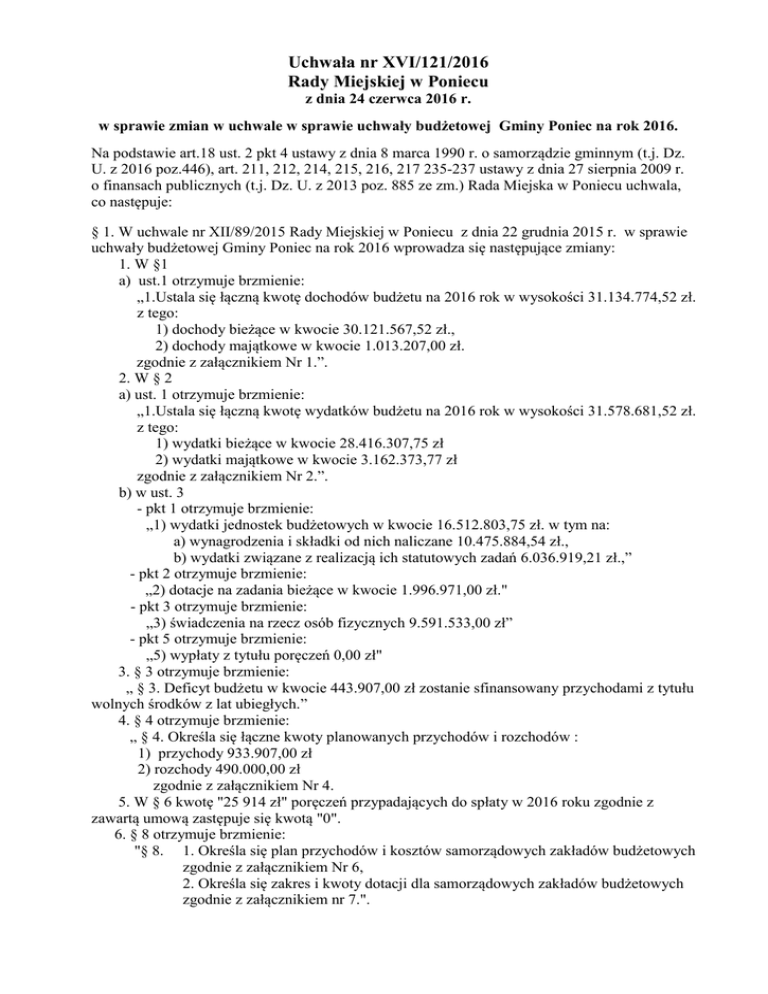 Uchwała nr XVI/121/2016 Rady Miejskiej w Poniecu z dnia 24 czerwca 2016 r. w sprawie zmian w uchwale w sprawie uchwały budżetowej Gminy Poniec na rok 2016. Na podstawie art.18 ust. 2 pkt 4 ustawy z dnia 8 marca 1990 r. o samorządzie gminnym (t.j. Dz. U. z 2016 poz.446), art. 211, 212, 214, 215, 216, 217 235-237 ustawy z dnia 27 sierpnia 2009 r. o finansach publicznych (t.j. Dz. U. z 2013 poz. 885 ze zm.) Rada Miejska w Poniecu uchwala, co następuje: § 1. W uchwale nr XII/89/2015 Rady Miejskiej w Poniecu z dnia 22 grudnia 2015 r. w sprawie uchwały budżetowej Gminy Poniec na rok 2016 wprowadza się następujące zmiany: 1. W §1 a) ust.1 otrzymuje brzmienie: „1.Ustala się łączną kwotę dochodów budżetu na 2016 rok w wysokości 31.134.774,52 zł. z tego: 1) dochody bieżące w kwocie 30.121.567,52 zł., 2) dochody majątkowe w kwocie 1.013.207,00 zł. zgodnie z załącznikiem Nr 1.”. 2. W § 2 a) ust. 1 otrzymuje brzmienie: „1.Ustala się łączną kwotę wydatków budżetu na 2016 rok w wysokości 31.578.681,52 zł. z tego: 1) wydatki bieżące w kwocie 28.416.307,75 zł 2) wydatki majątkowe w kwocie 3.162.373,77 zł zgodnie z załącznikiem Nr 2.”. b) w ust. 3 - pkt 1 otrzymuje brzmienie: „1) wydatki jednostek budżetowych w kwocie 16.512.803,75 zł. w tym na: a) wynagrodzenia i składki od nich naliczane 10.475.884,54 zł., b) wydatki związane z realizacją ich statutowych zadań 6.036.919,21 zł.,” - pkt 2 otrzymuje brzmienie: „2) dotacje na zadania bieżące w kwocie 1.996.971,00 zł." - pkt 3 otrzymuje brzmienie: „3) świadczenia na rzecz osób fizycznych 9.591.533,00 zł” - pkt 5 otrzymuje brzmienie: „5) wypłaty z tytułu poręczeń 0,00 zł" 3. § 3 otrzymuje brzmienie: „ § 3. Deficyt budżetu w kwocie 443.907,00 zł zostanie sfinansowany przychodami z tytułu wolnych środków z lat ubiegłych.” 4. § 4 otrzymuje brzmienie: „ § 4. Określa się łączne kwoty planowanych przychodów i rozchodów : 1) przychody 933.907,00 zł 2) rozchody 490.000,00 zł zgodnie z załącznikiem Nr 4. 5. W § 6 kwotę "25 914 zł" poręczeń przypadających do spłaty w 2016 roku zgodnie z zawartą umową zastępuje się kwotą "0". 6. § 8 otrzymuje brzmienie: "§ 8. 1. Określa się plan przychodów i kosztów samorządowych zakładów budżetowych zgodnie z załącznikiem Nr 6, 2. Określa się zakres i kwoty dotacji dla samorządowych zakładów budżetowych zgodnie z załącznikiem nr 7.". 7. W § 9 pkt 2 otrzymuje brzmienie: "2.Wydatki na realizację Gminnego Programu Profilaktyki i Rozwiązywania Problemów Alkoholowych i Przeciwdziałania Narkomanii na terenie gminy Poniec w roku 2016 określa się na kwotę 139.463 zł. w tym na: 1) profilaktykę i rozwiązywanie problemów alkoholowych 139.363 zł., 2) przeciwdziałanie narkomanii 100,00 zł.". zgodnie z załącznikiem Nr 8 8. 9. 10. 11. 12. 13. 14. 15. Dokonuje się zmian w zał. Nr 1 zgodnie z zał. Nr 1 do niniejszej uchwały. Dokonuje się zmian w zał. Nr 2 zgodnie z zał. Nr 2 do niniejszej uchwały. Dokonuje się zmian w zał. Nr 5 zgodnie z zał. Nr 3 do niniejszej uchwały. Dokonuje się zmian w zał. Nr 6 zgodnie z zał. Nr 4 do niniejszej uchwały. Dokonuje się zmian w zał. Nr 7 zgodnie z zał. Nr 5 do niniejszej uchwały. Dokonuje się zmian w zał. Nr 8 zgodnie z zał. Nr 6 do niniejszej uchwały. Dokonuje się zmian w zał. Nr 9 zgodnie z zał. Nr 7 do niniejszej uchwały. Dokonuje się zmian w zał. Nr 10 zgodnie z zał. Nr 8 do niniejszej uchwały. § 2. Wykonanie uchwały powierza się Burmistrzowi Ponieca. § 3. Uchwała wchodzi w życie z dniem podjęcia i ma zastosowanie do roku budżet owego 2016 UZASADNIENIE DO uchwały Nr XVI/121/2016 Rady Miejskiej w Poniecu z dnia 24 czerwca 2016 r. w sprawie zmian w uchwale w sprawie uchwały budżetowej Gminy Poniec na rok 2016. Załącznik nr 1 Zmiany w dochodach Dział 600 Na podstawie zawiadomienia Wojewody Wielkopolskiego FB-I.3111.113.2016.8 zwiększa się plan dotacji celowej na dofinansowanie w ramach programu wieloletniego pn."Program rozwoju gminnej i powiatowej infrastruktury drogowej na lata 2016-2019" na zadanie "Przebudowa ul. Janiszewskiej w Poniecu" w kwocie 475.615,00 zł. Dział 852 Na podstawie zawiadomienia Wojewody Wielkopolskiego FB - I.3111.129.2016.8 zwiększa sie plan dotacji celowej na dofinansowanie wypłat zasiłków stałych w kwocie 5.666,00 zł. Załącznik nr 2 Zmiany w wydatkach Działy 010 Zwiększa się plan wydatków na odmulenie- renowację stawu w Drzewcach w kwocie 20.000,00 zł. 400 Na wniosek Kierownika Gminnego Zakładu Wodociągów i Kanalizacji w Poniecu udziela się dotacji celowej na sfinansowanie budowy sieci wodociągowych Poniec- Wydawy oraz Poniec Zawada w kwocie 150.000,00 zł oraz dotacji celowej - wymianę rurociągów w stacji uzdatniania wody w Drzewcach kwota 40.000,00 zł. 600 Zwiększa się plan wydatków o kwotę przyznanej dotacji 475.615,00 na zadanie inwestycyjne przebudowa ulicy Janiszewskiej w Poniecu. 750 Zwiększa się wydatki na zakup materiałów w związku z planowanymi remontami w Urzędzie Miejskim w Poniecu o kwotę 20.000,00 zł oraz zakup usług pozostałych 12.000.00 zł a także zwiększenie planu wydatków na szkolenia pracowników o kwotę 5.000,00 zł. Ponadto zwiększa się wydatki na zakup towarów i usług na pozostałą działalność tj. organizację świąt narodowych i współpracę z zagranicą kwotę 6.000,00 zł . W związku z zwiększoną roczną składką członkowską na rok 2016 do Stowarzyszenia Kraina Lasów i Jezior - Lokalna Grupa Działania do której należy Gmina Poniec zwiększa się składki o kwotę 6.000,00zł 801 Wprowadza się zmiany w planie wydatków nie powodujące zwiększenia wydatków ogółem w zakresie wydatków w jednostkach : - Przedszkole w Poniecu o kwotę 60.000,- zł w związku z utworzeniem dodatkowego oddziału przedszkolnego i zakupem wyposażenia, - Zespół Szkół Szkoły Podstawowej i Gimnazjum w Żytowiecku zmi