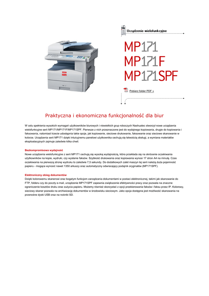 Pobierz folder PDF » Praktyczna i ekonomiczna funkcjonalność dla biur W celu spełnienia wysokich wymagań użytkowników biurowych i niewielkich grup roboczych Nashuatec stworzył nowe urządzenia wielofunkcyjne serii MP171/MP171F/MP171SPF. Pierwsze z nich przeznaczone jest do wydajnego kopiowania, drugie do kopiowania i faksowania, natomiast trzecie udostępnia takie opcje, jak kopiowanie, sieciowe drukowanie, faksowanie oraz sieciowe skanowanie w kolorze. Urządzenia serii MP171 dzięki intuicyjnemu panelowi użytkownika cechują się łatwością obsługi, a wymiana materiałów eksploatacyjnych zajmuje zaledwie kilka chwil. Bezkompromisowa wydajność Nowe urządzenia wielofunkcyjne z serii MP171 cechują się wysoką wydajnością, która przekłada się na skrócenie oczekiwania użytkowników na kopie, wydruki, czy wysłanie faksów. Szybkość drukowania oraz kopiowania wynosi 17 stron A4 na minutę. Czas oczekiwania na pierwszą stronę wydruku to zaledwie 7,5 sekundy. Do dodatkowych zalet maszyn tej serii należą duża pojemność papieru - mogąca wynosić nawet 1350 arkuszy oraz automatyczny odwracający podajnik oryginałów (MP171SPF). Elektroniczny obieg dokumentów Dzięki kolorowemu skanerowi oraz bogatym funkcjom zarządzania dokumentami w postaci elektronicznej, takimi jak skanowanie do FTP, folderu czy do poczty e-mail, urządzenie MP171SPF zapewnia zwiększenie efektywności pracy oraz pozwala na znaczne ograniczenie kosztów druku oraz zużycia papieru. Możemy również skorzystać z opcji przekierowania faksów i faksu przez IP. Kolorowy, sieciowy skaner pozwala na archiwizację dokumentów w środowisku sieciowym. Jako opcja dostępna jest możliwość skanowania na przenośne dyski USB oraz na nośniki SD. Pełne bezpieczeństwo Kiedy wymagamy pełnego bezpieczeństwa dokumentów, możemy wykorzystać funkcje szyfrowania danych transmitowanych w sieci lokalnej, co zapobiega możliwości ich przechwycenia przez osoby niepowołane. W urządzeniach serii MP171 zaimplementowano kontrolę nieuprawnionego użycia poprzez kody użytkowników, oraz autoryzację Windows, lub też z wykorzystaniem protokołu LDAP. Jeśli zdecydujesz się na korzystanie z opcjonalnego dysku twardego (MP171SPF), możesz również skorzystać z funkcjonalności druku bezpiecznego i druku zatrzymanego. Szybkie faksowanie Zastosowanie szybkiego faksu zgodnego z najnowszym standardem G3 zapewnia wygodną i wydajną obsługę wysyłanych dokumentów. Przesyłanie faksów może odbywać się bezpośrednio z komputera bez konieczności drukowania dokumentu. Dzięki wbudowanej pamięci, przychodzące dokumenty faksowe nie muszą być drukowane - zamiast tego można je przesyłać w postaci elektronicznej na zdefiniowany adres poczty elektronicznej. Zaawansowane oprogramowanie Dołączone oprogramowanie pozwala na zarządzanie oraz kontrolę urządzeń podłączonych do sieci lokalnej. WebImage Monitor udostępnia informacje dotyczące ilości papieru w kasetach oraz ilości tonera. Pozwala również na zmianę ustawień konfiguracyjnych urządzenia oraz zarządzanie książką adresową. Aplikacja ta działa poprzez interfejs przeglądarki internetowej. Oprogramowanie Web SmartDevice Monitor ułatwia pracę administratorom sieci, umożliwiając automatyczną konfigurację urządzeń w taki sposób, by odpowiadała potrzebom poszczególnych użytkowników, czy również grup roboczych. Co więcej, aplikacja ta umożliwia informowanie użytkowników o statusie urządzeń sieciowych. Proces kopiowania elektrostatyczny, suchy, dwuskładnikowy Szybkość kopiowania 17 kopii A4 na minutę Rozdzielczość 600dpi Wielokrotne kopiowanie do 99 kopii Czas nagrzewania MP171: mniej niż 10 sekund MP171F/MP171SPF: mniej niż 30 sekund Czas oczekiwania na pierws mniej niż 7,5 sekundy zą kopię Skalowanie 50 - 200% (w krokach co 1%) Pamięć MP171: 16MB MP171F: 256MB MP161SPF: 640MB + opcjonalny dysk twardy 80GB Pojemność kaset na papier kaseta na 250 arkuszy + podajnik ręczny na 100 arkuszy(1), maksymalnie 1350 arkuszy Rozmiary nośników standardowa kaseta na papier: A5 - A4 dodatkowe kasety na papier: A4 podajnik ręczny: A6 - A4(2) drukowanie dwustronne: A5 - A4 Gramatura nośników kasety na papier: 60 - 90g/m2 podajnik ręczny: 60 - 157g/m2 drukowanie dwustronne: 64 - 90g/m2 Drukowanie dwustronne standard Wymiary maksymalnie 485 x 450 x 481mm Waga mniej niż 29 kg (z podajnikiem ARDF) Źródło zasilania 220 - 240V, 50 - 60Hz Zużycie energii maksymalnie 900W (MP171SPF) Procesor drukarki RM5231 400MHz Szybkość druku 17 stron A4 na minutę Języki druku PCL5e, PCL6, opcjonalnie Adobe PostScript3 Interfejsy standardowe USB 2.0, Ethernet 10/100 Interfejsy opcjonalne Wireless LAN, LPT, Bluetooth, Gigabit Ethernet Protokoły sieciowe TCP/IP (IPv4, IPv6), IPX/SPX, SMB, Apple Talk Systemy operacyjne Windows 2000/XP/Server 2003/Vista/Server 2008 Macintosh 8.6 - 9.x (OS X Classic) Macintosh X v10.1 lub późniejszy (tryb natywny) Sun Solaris 2.6/7/8/9/10 HP-UX 10.x/11.x/11iv2/11iv3 RedHat Linux 6.x/7.x/8.x/9.x/Enterprise SCO Open Server 5.0.6/5.0.7/6.0 IBM AIX v4.3/5L, v5.1/5L, v5.2/5L, v5.3 Novell NetWare 3.12/3.2/4.1/4.11/5.0/5.1/6.0/6.5 (MP171SPF) Szybkość skanowania do 22 oryginałów A4 na minutę Rozdzielczość 100 - 600dpi Formaty oryginałów A5 - A4 Formaty wyjściowe TIFF, PDF, JPEG Sterowniki sieciowy, TWAIN Skanowanie do e-mail SMTP, TCP/IP (IPv4) Adresy docelowe maksymalnie 100 na pracę Pamięć adresów docelowych maksymalnie 150 Książka adresowa przez panel użytkownika, LDAP Skanowanie do folderu protokoły SMB, NCP lub FTP Foldery docelowe maksymalnie 32 na pracę (MP171SPF) WebImage Monitor, SmartDevice Monitor, DeskTop Binder Lite, Web SmartDevice Monitor (MP171F/MP171SPF) Typ linii PSTN, PBX Standardy ITU-T G3 Szybkość 33,6kbps Metody kompresji MH, MR, MMR, JBIG Szybkość skanowania 2 sekundy Pamięć faksu standardowo: 4MB (320 stron) Podtrzymanie pamięci faksu 12 godzin MP1