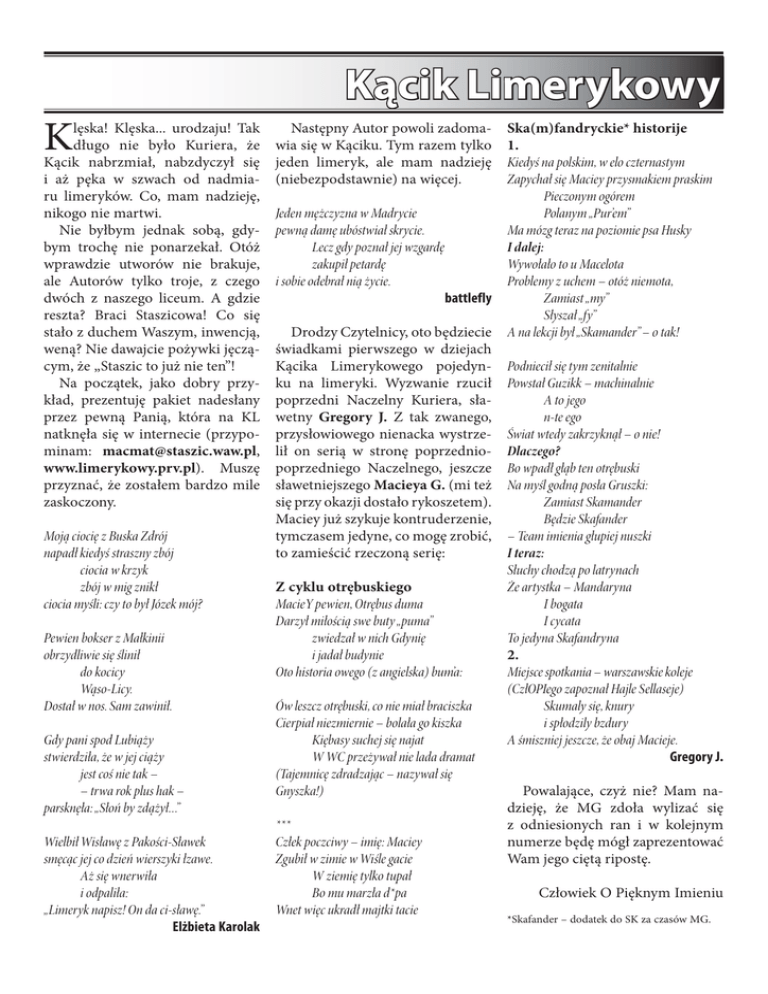 Kącik Limerykowy K lęska! Klęska... urodzaju! Tak długo nie było Kuriera, że Kącik nabrzmiał, nabzdyczył się i aż pęka w szwach od nadmiaru limeryków. Co, mam nadzieję, nikogo nie martwi. Nie byłbym jednak sobą, gdybym trochę nie ponarzekał. Otóż wprawdzie utworów nie brakuje, ale Autorów tylko troje, z czego dwóch z naszego liceum. A gdzie reszta? Braci Staszicowa! Co się stało z duchem Waszym, inwencją, weną? Nie dawajcie pożywki jęczącym, że „Staszic to już nie ten”! Na początek, jako dobry przykład, prezentuję pakiet nadesłany przez pewną Panią, która na KL natknęła się w internecie (przypominam: [email protected], www.limerykowy.prv.pl). Muszę przyznać, że zostałem bardzo mile zaskoczony. Moją ciocię z Buska Zdrój napadł kiedyś straszny zbój ciocia w krzyk zbój w mig znikł ciocia myśli: czy to był Józek mój? Pewien bokser z Małkinii obrzydliwie się ślinił do kocicy Wąso-Licy. Dostał w nos. Sam zawinił. Gdy pani spod Lubiąży stwierdziła, że w jej ciąży jest coś nie tak – – trwa rok plus hak – parsknęła: „Słoń by zdążył...” Wielbił Wisławę z Pakości-Sławek smęcąc jej co dzień wierszyki łzawe. Aż się wnerwiła i odpaliła: „Limeryk napisz! On da ci-sławę.” Elżbieta Karolak Następny Autor powoli zadomawia się w Kąciku. Tym razem tylko jeden limeryk, ale mam nadzieję (niebezpodstawnie) na więcej. Ska(m)fandryckie* historije 1. Kiedyś na polskim, w elo czternastym Zapychał się Maciey przysmakiem praskim Pieczonym ogórem Jeden mężczyzna w Madrycie Polanym „Pur’em” pewną damę ubóstwiał skrycie. Ma mózg teraz na poziomie psa Husky Lecz gdy poznał jej wzgardę I dalej: zakupił petardę Wywołało to u Macelota i sobie odebrał nią życie. Problemy z uchem – otóż niemota, battlefly Zamiast „my” Słyszał „fy” Drodzy Czytelnicy, oto będziecie A na lekcji był „Skamander” – o tak! świadkami pierwszego w dziejach Kącika Limerykowego pojedyn- Podniecił się tym zenitalnie ku na limeryki. Wyzwanie rzucił Powstał Guzikk – machinalnie poprzedni Naczelny Kuriera, słaA to jego wetny Gregory J. Z tak zwanego, n-te ego przysłowiowego nienacka wystrze- Świat wtedy zakrzyknął – o nie! lił on serią w stronę poprzednio- Dlaczego? poprzedniego Naczelnego, jeszcze Bo wpadł głąb ten otrębuski sławetniejszego Macieya G. (mi też Na myśl godną posła Gruszki: się przy okazji dostało rykoszetem). Zamiast Skamander Maciey już szykuje kontruderzenie, Będzie Skafander tymczasem jedyne, co mogę zrobić, – Team imienia głupiej nuszki to zamieścić rzeczoną serię: I teraz: Słuchy chodzą po latrynach Z cyklu otrębuskiego Że artystka – Mandaryna MacieY pewien, Otrębus duma I bogata Darzył miłością swe buty „puma” I cycata zwiedzał w nich Gdynię To jedyna Skafandryna i jadał budynie 2. Oto historia owego (z angielska) bum’a: Miejsce spotkania – warszawskie koleje (CzłOPIego zapoznał Hajle Sellaseje) Ów leszcz otrębuski, co nie miał braciszka Skumaly się, knury Cierpiał niezmiernie – bolała go kiszka i spłodzily bzdury Kiębasy suchej się najat A śmiszniej jeszcze, że obaj Macieje. W WC przeżywał nie lada dramat Gregory J. (Tajemnicę zdradzając – nazywał się Gnyszka!) Powalające, czyż nie? Mam nadzieję, że MG zdoła wylizać się *** z odniesionych ran i w kolejnym Człek poczciwy – imię: Maciey numerze będę mógł zaprezentować Zgubił w zimie w Wiśle gacie Wam jego ciętą ripostę. W ziemię tylko tupał Bo mu marzła d*pa Człowiek O Pięknym Imieniu Wnet więc ukradł majtki tacie *Skafander – dodatek do SK za czasów MG.