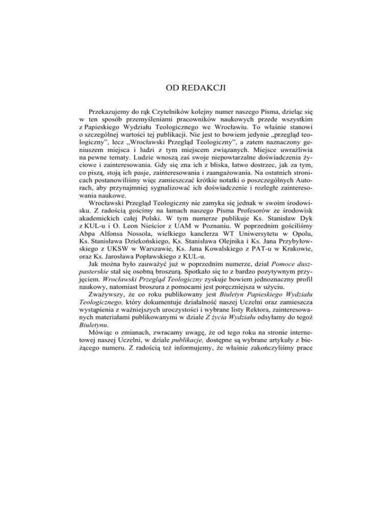 OD REDAKCJI Przekazujemy do rąk Czytelników kolejny numer naszego Pisma, dzieląc się w ten sposób przemyśleniami pracowników naukowych przede wszystkim z Papieskiego Wydziału Teologicznego we Wrocławiu. To właśnie stanowi o szczególnej wartości tej publikacji. Nie jest to bowiem jedynie „przegląd teologiczny”, lecz „Wrocławski Przegląd Teologiczny”, a zatem naznaczony geniuszem miejsca i ludzi z tym miejscem związanych. Miejsce uwrażliwia na pewne tematy. Ludzie wnoszą zaś swoje niepowtarzalne doświadczenia życiowe i zainteresowania. Gdy się zna ich z bliska, łatwo dostrzec, jak za tym, co piszą, stoją ich pasje, zainteresowania i zaangażowania. Na ostatnich stronicach postanowiliśmy więc zamieszczać krótkie notatki o poszczególnych Autorach, aby przynajmniej sygnalizować ich doświadczenie i rozległe zainteresowania naukowe. Wrocławski Przegląd Teologiczny nie zamyka się jednak w swoim środowisku. Z radością gościmy na łamach naszego Pisma Profesorów ze środowisk akademickich całej Polski. W tym numerze publikuje Ks. Stanisław Dyk z KUL-u i O. Leon Nieścior z UAM w Poznaniu. W poprzednim gościliśmy Abpa Alfonsa Nossola, wielkiego kanclerza WT Uniwersytetu w Opolu, Ks. Stanisława Dziekońskiego, Ks. Stanisława Olejnika i Ks. Jana Przybyłowskiego z UKSW w Warszawie, Ks. Jana Kowalskiego z PAT-u w Krakowie, oraz Ks. Jarosława Popławskiego z KUL-u. Jak można było zauważyć już w poprzednim numerze, dział Pomoce duszpasterskie stał się osobną broszurą. Spotkało się to z bardzo pozytywnym przyjęciem. Wrocławski Przegląd Teologiczny zyskuje bowiem jednoznaczny profil naukowy, natomiast broszura z pomocami jest poręczniejsza w użyciu. Zważywszy, że co roku publikowany jest Biuletyn Papieskiego Wydziału Teologicznego, który dokumentuje działalność naszej Uczelni oraz zamieszcza wystąpienia z ważniejszych uroczystości i wybrane listy Rektora, zainteresowanych materiałami publikowanymi w dziale Z życia Wydziału odsyłamy do tegoż Biuletynu. Mówiąc o zmianach, zwracamy uwagę, że od tego roku na stronie internetowej naszej Uczelni, w dziale publikacje, dostępne są wybrane artykuły z bieżącego numeru. Z radością też informujemy, że właśnie zakończyliśmy prace 6 OD REDAKCJI nad wersją elektroniczną wszystkich numerów archiwalnych naszego Pisma, które w najbliższym czasie zostaną udostępnione na naszej stronie internetowej. Chcemy też zakomunikować, że wprowadzamy nowy dział pt. Dziedzictwo św. Edyty Stein. Można powiedzieć, że jest to skromna próba odpowiedzi na życzenie Ks. Arcybiskupa Mariana Gołębiewskiego, Wielkiego Kanclerza naszej Uczelni, który już podczas ingresu do katedry wrocławskiej dzielił się swoim pragnieniem, by rozwinąć i pogłębić refleksję nad przesłaniem tej świętej wrocławianki. Nieraz podejmowano na naszych łamach tę problematykę. Postanowiliśmy jednak wyodrębnić i zgromadzić w jednym miejscu teksty związane ze św. Edytą Stein. Dział ten inauguruje artykuł Pani Profesor Hanny Barbary Gerl-Falkovitz z Drezna, naukowego doradcy 24tomowego Wydania Dzieł Wszystkich Edyty Stein oraz wiceprezesa Niemieckiego Towarzystwa Jej imienia. Mamy świadomość, że ta urodzona we Wrocławiu Żydówka, uczennica światowej sławy filozofów, która przyjęła chrzest w Kościele Katolickim i stała się uczennicą wielkich Mistrzów karmelitańskiej szkoły duchowości, to osobowość wieloaspektowa. Żydówka i Katoliczka. Filozof i Karmelitanka. Wrocławianka i Święta Patronka Europy. Pozostawiła po sobie nie tylko prace filozoficzne, ale również teksty z duchowości. Żadnego z aspektów Jej życia i przesłania nie wolno zaniedbać ani minimalizować, gdyż dopiero kompleksowe podejście pozwoli Jej pełnym głosem mówić do sumienia Europy. Oczekujemy zatem nie tylko na studia nad filozofią Św. Edyty. Zachęcamy do publikacji na Jej temat teologów duchowości, liturgistów, pastoralistów, historyków. Wiele bardzo aktualnych zagadnień czeka na opracowanie. O. Kazimierz Lubowicki OMI Redaktor naczelny