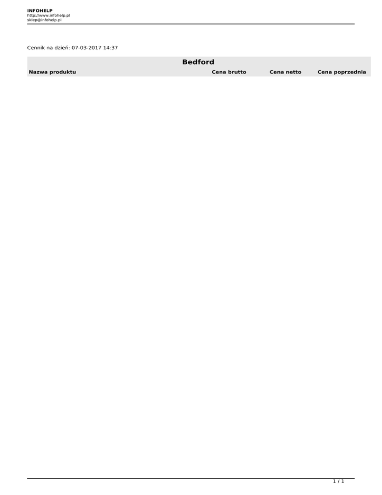 INFOHELP http://www.infohelp.pl [email protected] Cennik na dzień: 07-03-2017 14:37 Bedford Nazwa produktu Cena brutto Cena netto Cena poprzednia 1/1 Powered by TCPDF (www.tcpdf.org)