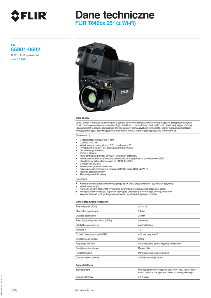 Dane techniczne FLIR T640bx 25° (z Wi-Fi) P/N: 55901-0602 © 2011, FLIR Systems, Inc. June 17, 2011 Opis ogólny FLIR T640bx to najwyższej skuteczności system do kontroli termowizyjnych wśród urządzeń dostępnych na rynku. Dzięki zastosowaniu najnowszej technologii, detektora o rozdzielczości 640 x 480 oraz unikatowej, ergonomicznej konstrukcji jest to idealne rozwiązanie dla specjalistów zajmujących się termografią, którzy wymagają najbardziej wydajnych narzędzi zapewniających profesjonalne wyniki. Kamera jest wyposażona w obiektyw 25°. Główne cechy: • • • • • • • • • • • • • • Rozdzielczość obrazu: 640 x 480 Czułość: <40 mK Wbudowany czytelny ekran LCD o przekątnej 4.3” Powiększenie ciągłe 1-8× z funkcją panoramowania Optymalizacja kontrastu Obraz w obrazie Fuzja termiczna: poniżej, powyżej i w ramach przedziału Wbudowana kamera cyfrowa o rozdzielczości 5 megapikseli z doświetleniem LED Standardowy zakres temperatur: od -40°C do 650°C Dokładność 2%, 2°C Komentarze głosowe i tekstowe Przesyłanie strumieniowe w formacie MPEG4 przez USB lub Wi-Fi Przycisk programowalny Alarm wilgotności i izolacji Ergonomia: • • • • • Kamera termowizyjna z możliwością regulacji w wielu płaszczyznach i duży ekran dotykowy Wbudowany wizjer Niewielki ciężar i doskonałe wyważenie gwarantują wygodną pracę przez cały dzień Intuicyjna i łatwa obsługa, najnowocześniejsze urządzenie z technologią obsługi dotykowej Większa łatwość obsługi dzięki zastosowaniu joysticka i dużych przycisków Dane obrazowania i optyczne Pole widzenia (FOV) 25° × 19° Minimalna ogniskowa 0,25 m Długość ogniskowej 25 mm Rozdzielczość przestrzenna (IFOV) 0,68 mrad Identyfikacja obiektywu Automatyczna Wartość F 1.0 Czułość temperaturowa/NETD <40 mK przy +30°C Częstotliwość obrazu 30 Hz Regulacja ostrości Automatycznie (jedno zdjęcie) lub ręcznie Powiększenie cyfrowe Ciągłe 1-8× Panoramowanie Panoramowanie na stopklatce Cyfrowa korekta obrazu Cyfrowa redukcja szumu 55901-0602_pl_51.xml, ver. 1.07 Dane detektora 1 (28) Typ detektora Mikrobolometr niechłodzony typu FPA (ang. Focal Plane Array, matryca pracująca w płaszczyźnie ogniskowej) Zakres widmowy 7,5-14 µm http://www.flir.com FLIR T640bx 25° (z Wi-Fi) © 2011, FLIR Systems, Inc. Dane detektora June 17, 2011 Rozdzielczość obrazu termowizyjnego 640 × 480 pikseli Piksel detektora 17 µm Prezentacja obrazu Ekran Wbudowany duży ekran dotykowy LCD o przekątnej 4,3 cala, 800 × 480 pikseli Wizjer Wbudowany, 800 × 480 pikseli Automatyczna regulacja obrazu Tryb ciągły/ręczny; liniowy lub oparty na histogramie; możliwość zablokowania temperatury najwyższej, najniższej lub zakresu Typ automatycznej regulacji obrazu Standardowa lub histogram w oparciu o treść obrazu Ręczna regulacja obrazu Poziom/zakres/maks./min. Tryby prezentacji obrazu Obraz termowizyjny Pełnobarwny obraz termowizyjny Obraz w świetle widzialnym Pełnobarwny obraz w świetle widzialnym Fuzja termiczna Obraz termowizyjny pokazywany w granicach przedziału temperatur, powyżej lub poniżej tego przedziału na obrazie widzialnym Obraz w obrazie Obszar obrazu termowizyjnego na obrazie widzialnym Pomiar Zakres temperatur -40°C do +150°C +100°C do +650°C Dokładność ±2°C lub ±2% odczytu Funkcje pomiarowe Punkt pomiarowy 10 Obszar 5 prostokątnych lub okrągłych obszarów z wartością maks./min./średnią Automatyczne wykrywanie miejsc gorących/zimnych Maks./min. wartość temperatury oraz położenie pokazywane w obszarze prostokątnym, okrągłym lub na linii Izoterma Powyżej/poniżej/przedział Profil 1 kanał na żywo Ustawienia programowane pomiaru Tak Temperatura różnicowa Różnica temperatur między funkcjami pomiarowymi lub temperaturą odniesienia Temperatura odniesienia Ustawienie ręczne Korekcja transmisji atmosferycznej Automatyczna, na podstawie odległości, temperatury powietrza i wilgotności względnej Korekcja transmisji układu optycznego Automatyczna, na podstawie sygnałów z czujników wewnętrznych Korekcja emisyjności Zmienna od 0,01 do 1,0 lub wybierana z listy materiałów Tabela emisyjności Tabela emisyjności zdefiniowanych materiałów Korekcja odbitej temperatury pozornej Automatyczna, na podstawie odbitej temperatury Korekcja zewnętrznego układu optycznego/okna Automatyczna, na podstawie transmisji okna i temperatury Alarm Alarm wilgotności Jeden alarm wilgotności, w tym alarm punktu rosy Alarm izolacji Jeden alarm izolacji 55901-0602_pl_51.xml, ver. 1.07 Konfiguracja 2 (28) Palety kolorów Żelaza, Szarości, Tęczy, Arktyczna, Lawa, Tęczy HC Polecenia konfiguracji Konfiguracja informacji prezentowanych na obrazie; przycisk programowalny; używanie lokalnych jednostek, język, formaty daty i godziny, aktualizacja oprogramowania kamery Aktualizacja oprogramowania kamery Przy pomocy programu FLIR Tools http://www.flir.com FLIR T640bx 25° (z Wi-Fi) © 2011, FLIR Systems, Inc. Przechowywanie obrazów June 17, 2011 Nośnik danych Wymienna karta pamięci SD Tryb rejestracji danych Obraz termowizyjny/w świetle widzialnym; równoczesne zapisywanie obrazów termowizyjnych i obrazów widzialnych. Automatyczne grupowanie obrazów termowizyjnych i obrazów w świetle widzialnym. Formaty plików Standardowy JPEG, dołączone dane pomiaru Formaty plików, światło widzialne Standardowy JPEG, automatycznie skojarzony z odpowiednim obrazem termowizyjnym Komentarze do obrazów Głosowe 60 sekund (przez Bluetooth) zapisywany razem z obrazem Tekstowe Tekst wprowadzany z uprzednio zdefiniowanej listy, edytowany w kamerze lub wpisywany bezpośrednio z klawiatury na ekranie dotykowym Szkic Z ekranu dotykowego Meterlink Połączenie bezprzewodowe (Bluetooth®) z następującymi urządzeniami: Wilgotnościomierz Extech MO297 Miernik cęgowy Extech EX845 Generowanie raportów • • Raport poglądowy (plik *.pdf) w kamerze Niezależne oprogram