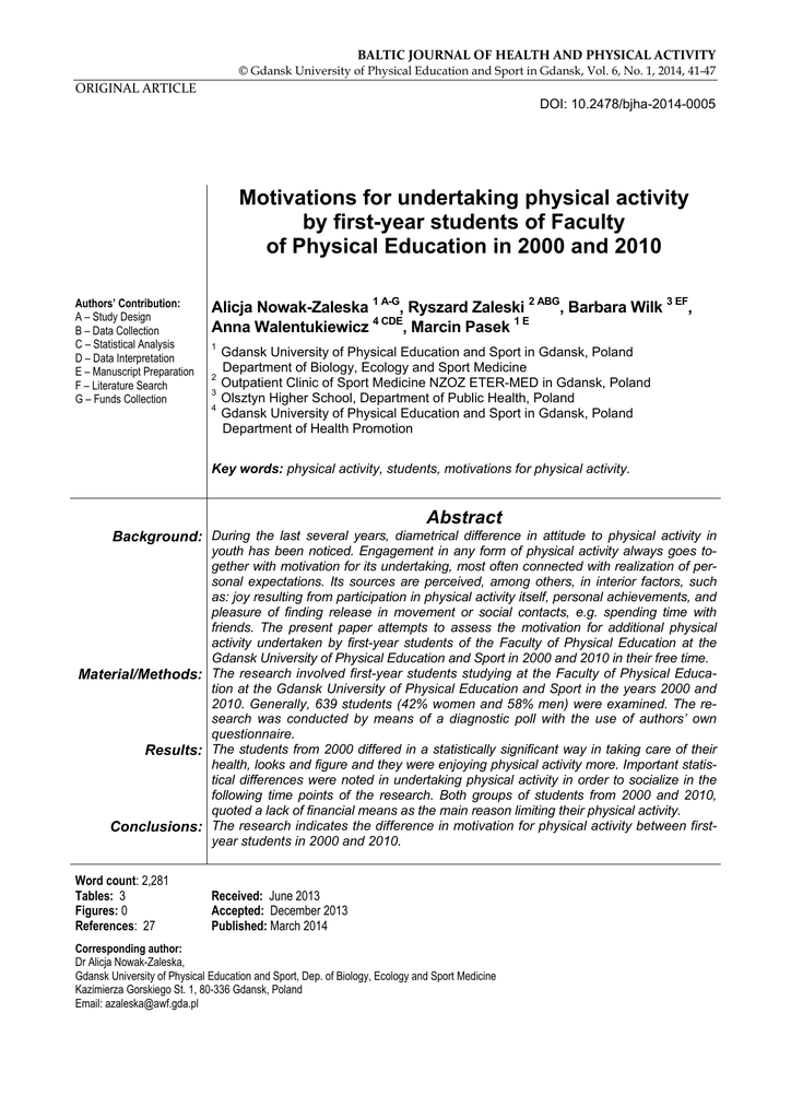 BALTIC JOURNAL OF HEALTH AND PHYSICAL ACTIVITY © Gdansk University of Physical Education and Sport in Gdansk, Vol. 6, No. 1, 2014, 41-47 ORIGINAL ARTICLE DOI: 10.2478/bjha-2014-0005 Motivations for undertaking physical activity by first-year students of Faculty of Physical Education in 2000 and 2010 Authors’ Contribution: A – Study Design B – Data Collection C – Statistical Analysis D – Data Interpretation E – Manuscript Preparation F – Literature Search G – Funds Collection Alicja Nowak-Zaleska 1 A-G, Ryszard Zaleski 2 ABG, Barbara Wilk 3 EF, Anna Walentukiewicz 4 CDE, Marcin Pasek 1 E 1 2 3 4 Gdansk University of Physical Education and Sport in Gdansk, Poland Department of Biology, Ecology and Sport Medicine Outpatient Clinic of Sport Medicine NZOZ ETER-MED in Gdansk, Poland Olsztyn Higher School, Department of Public Health, Poland Gdansk University of Physical Education and Sport in Gdansk, Poland Department of Health Promotion Key words: physical activity, students, motivations for physical activity. Abstract Background: During the last several years, diametrical difference in attitude to physical activity in youth has been noticed. Engagement in any form of physical activity always goes together with motivation for its undertaking, most often connected with realization of personal expectations. Its sources are perceived, among others, in interior factors, such as: joy resulting from participation in physical activity itself, personal achievements, and pleasure of finding release in movement or social contacts, e.g. spending time with friends. The present paper attempts to assess the motivation for additional physical activity undertaken by first-year students of the Faculty of Physical Education at the Gdansk University of Physical Education and Sport in 2000 and 2010 in their free time. Material/Methods: The research involved first-year students studying at the Faculty of Physical Education at the Gdansk University of Physical Education and Sport in the years 2000 and 2010. Generally, 639 students (42% women and 58% men) were examined. The research was conducted by means of a diagnostic poll with the use of authors’ own questionnaire. Results: The students from 2000 differed in a statistically significant way in taking care of their health, looks and figure and they were enjoying physical activity more. Important statistical differences were noted in undertaking physical activity in order to socialize in the following time points of the research. Both groups of students from 2000 and 2010, quoted a lack of financial means as the main reason limiting their physical activity. Conclusions: The research indicates the difference in motivation for physical activity between firstyear students in 2000 and 2010. Word count: 2,281 Tables: 3 Figures: 0 References: 27 Received: June 2013 Accepted: December 2013 Published: March 2014 Corresponding author: Dr Alicja Nowak-Zaleska, Gdansk University of Physical Education and Sport, Dep. of Biology, Ecology and Sport Medicine Kazimierza Gorskiego St. 1, 80-336 Gdansk, Poland Email: [email protected] A. Nowak-Zaleska, R. Zaleski, B. Wilk, A. Walentukiewicz, M. Pasek, Motivations for undertaking physical activity by first-year PE students Introduction Physical activity (PA) is not only one of the forms of spending free time, but also an opportunity of important health-preventive meaning, given a man in the process of self-realization [1, 2]. Within the last few years a diametrical difference in the approach of youth towards physical activity has been noticed. The period of adolescence is a stage in which an individual forms his/her own identity and sets goals and values that give meaning to his/her life. Under certain circumstances they can also choose their own attitude towards activity, which in effect is manifested in their behaviour [3]. No doubt that the popularity of various forms of this activity increases, which is connected with increasingly growing offer of programmes and recreational and sport events and better infrastructure. Unquestionably, however, there are certain factors which on the one hand motivate to participate in motor activity, but on the other hand, constitute barriers limiting participation [4]. Getting engaged in any form of physical activity is always accompanied by motivation to undertake it, most often connected with realization of personal expectations. Its sources are seen, among others, in inner factors, such as enjoyment from participation itself in the physical activity, personal achievements, pleasure of experiencing activity through movement or social activity, e.g. spending time with friends. When young people take up physical activity they will be physically active their whole adult life. The specificity of physical activity in various groups is determined, among others, by forms of motor exercises and motives of undertaking them. “Equally important as recognizing motives for participation in motor activity is also an analysis of reasons for resignation from this pro-health form of spending free time” [5]. Taking into consideration the results of GUS (Central Statistical Office) research [4], active Poles are characterized by ludic attitudes (entertaining), in which 51.3% are motivated by pleasure and enjoyment, and 36.7% of respondents by preserving health, keeping fit and maintaining their physical condition. Achieving the desired figure is mentioned in a lot of research as an important motivating factor of physical activity. Health is on a high position in the system of values of an individual - usually it is appreciated more by the elderly than by the young ones. As the report Participation of Poles in Sports shows, care for physical fitness and health frequently comes with age, but among the surveyed part of the society this motivation only takes the first place after approx. the 45th year of life and is more pronounced in the elder age brackets. The authors attempted to assess the 