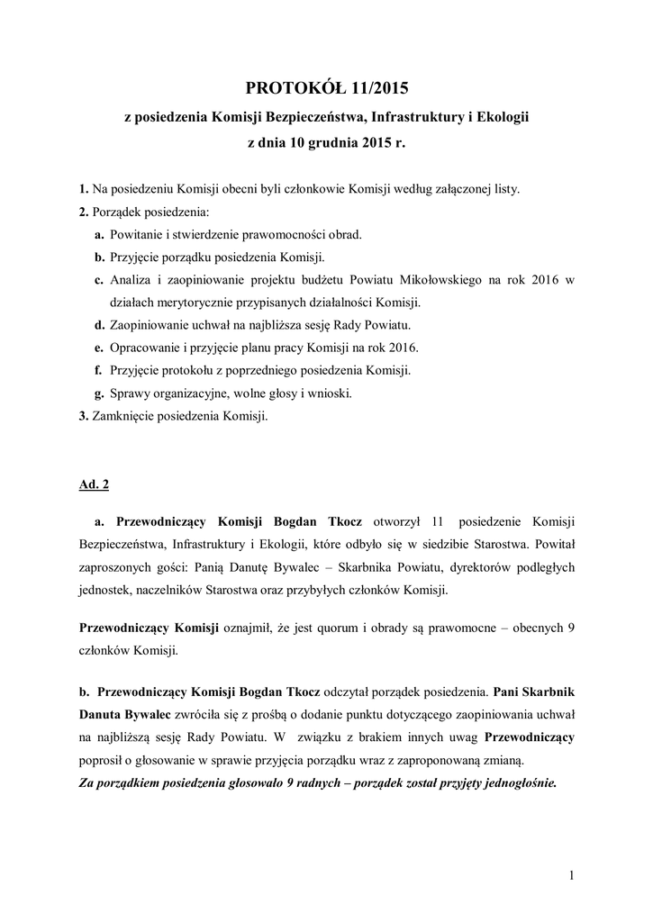 PROTOKÓŁ 11/2015 z posiedzenia Komisji Bezpieczeństwa, Infrastruktury i Ekologii z dnia 10 grudnia 2015 r. 1. Na posiedzeniu Komisji obecni byli członkowie Komisji według załączonej listy. 2. Porządek posiedzenia: a. Powitanie i stwierdzenie prawomocności obrad. b. Przyjęcie porządku posiedzenia Komisji. c. Analiza i zaopiniowanie projektu budżetu Powiatu Mikołowskiego na rok 2016 w działach merytorycznie przypisanych działalności Komisji. d. Zaopiniowanie uchwał na najbliższa sesję Rady Powiatu. e. Opracowanie i przyjęcie planu pracy Komisji na rok 2016. f. Przyjęcie protokołu z poprzedniego posiedzenia Komisji. g. Sprawy organizacyjne, wolne głosy i wnioski. 3. Zamknięcie posiedzenia Komisji. Ad. 2 a. Przewodniczący Komisji Bogdan Tkocz otworzył 11 posiedzenie Komisji Bezpieczeństwa, Infrastruktury i Ekologii, które odbyło się w siedzibie Starostwa. Powitał zaproszonych gości: Panią Danutę Bywalec – Skarbnika Powiatu, dyrektorów podległych jednostek, naczelników Starostwa oraz przybyłych członków Komisji. Przewodniczący Komisji oznajmił, że jest quorum i obrady są prawomocne – obecnych 9 członków Komisji. b. Przewodniczący Komisji Bogdan Tkocz odczytał porządek posiedzenia. Pani Skarbnik Danuta Bywalec zwróciła się z prośbą o dodanie punktu dotyczącego zaopiniowania uchwał na najbliższą sesję Rady Powiatu. W związku z brakiem innych uwag Przewodniczący poprosił o głosowanie w sprawie przyjęcia porządku wraz z zaproponowaną zmianą. Za porządkiem posiedzenia głosowało 9 radnych – porządek został przyjęty jednogłośnie. 1 c. Przewodniczący Komisji oddał głos Pani Danucie Bywalec – Skarbnikowi Powiatu w celu przedstawienia projektu budżetu Powiatu Mikołowskiego na rok 2016 w działach merytorycznie przypisanych działalności Komisji. Pani Danuta Bywalec w pierwszej kolejności przybliżyła ogólne informacje dotyczące projektu uchwały budżetowej na rok 2016. Przekazała, iż łączna kwota dochodów została ustalona na poziomie 82.847.567 zł (w tym 77.877.523 zł - dochody bieżące, 4.970.044 zł dochody majątkowe) natomiast wydatków na poziomie 83.737.185 zł (wydatki bieżące 74.754.473 zł, wydatki majątkowe 8.982.712 zł). Deficyt budżetu w kwocie 889.618 zł zostanie sfinansowany przychodem bieżącym z pożyczki w Wojewódzkim Funduszu Ochrony Środowiska i Gospodarki Wodnej na przedsięwzięcie termomodernizacyjne. Limit zobowiązań do zaciągnięcia na sfinansowanie przejściowego deficytu został określony na kwotę 4.000.000 zł. Ustalono rezerwy ogólne w wysokości 196.317zł oraz rezerwy celowe w wysokości 718.000 zł, w tym na realizację zadań własnych z zakresu zarządzania kryzysowego w wysokości 168.000 zł, na cele oświatowe w wysokości 300.000 zł, na odprawy emerytalne i rentowe w wysokości 250.000 zł. Następnie Pani Bywalec przekazała informacje o dochodach i wydatkach w działach związanych z działalnością Komisji. Wśród dochodów wymieniła następujące dotacje i dochody własne: - dotacja w rozdz. 60014 - „Drogi publiczne powiatowe” w kwocie 305 342 zł z Gminy Orzesze na remont ciągu drogowego drogi nr S 5302 ul. Wawrzyńca w Orzeszu oraz w kwocie 1 119 651 zł z Gminy Ornontowice na przebudowę ul. Zamkowej w Ornontowicach, - dotacja w rozdz. 60053 - „Infrastruktura telekomunikacyjna”- od 5 gmin powiatu mikołowskiego na utrzymanie sieci światłowodowej pn. „SilesiaNet”- w kwocie 194 000 zł, - w rozdz. 75421- „Zarządzanie kryzysowe”- dotacja z gmin powiatu mikołowskiego na utrzymanie Powiatowego Centrum Zarządzania Kryzysowego na terenie powiatu w kwocie180 535 zł, - w rozdz. 75495 - „Pozostała działalność”- dotacja na pokrycie kosztów utrzymania monitoringu wizyjnego na terenie powiatu – od Gminy Mikołów – 15 000 zł, - w rozdz. 85158 - „Izby wytrzeźwień”- dotacja z gmin powiatu mikołowskiego tj. Mikołów, Ornontowice i Łaziska Górne na pokrycie kosztów pobytu mieszkańców powiatu w izbie wytrzeźwień 100 000 zł, - dotacja z Wojewódzkiego Funduszu Ochrony Środowiska i Gospodarki wodnej w kwocie 2 300 000 zł, - dotacje z Programu Rozwoju Gminnych i Powiatowych Inwestycji Drogowych w ogólnej kwocie 2 794 102 zł. dochody z tytułu opłaty komunikacyjnej zaplanowano w wysokości 2 350 000 zł (dział 750), dochody powiatu związane z realizacją zadań z zakresu administracji rządowej w wysokości 1 000 000 zł, szacowane na podstawie prognozowanych realnych wpływów z tytułu 25 % udziału Powiatu Mikołowskiego w dochodach z realizacji zadań z zakresu administracji rządowej z tytułu opłat za wieczyste użytkowanie gruntów Skarbu Państwa (dział 700), - dochody uzyskane na podstawie przepisów ustawy Prawo Geodezyjne i Kartograficzne pobierane są opłaty za usługi geodezyjne (wyrysy, wypisy, mapy) świadczone przez Powiatowy Zasób Geodezyjny oraz Wydział Geodezji, Kartografii i Katastru- w kwocie 888 000 zł (dział 710), - dochody z opłat i kar za korzystanie ze środowiska planuje się pozyskać w wysokości 870 000 zł (dział 900), - dochody z tytułu opłat za wycinkę drzew – w kwocie 500 000 zł (dział 900,) - wpływy z opłat za holowanie i parkowanie pojazdów usuniętych z dróg publicznych – 50 500 zł (dział 754), - wpływy z opłat za zajęcie pasa drogowego- 150 140 zł (dział 756), - pozostałe dochody uzyskiwane przez jednostki budżetowe-305 083 zł (darowizny, zwroty wydatków roku ubiegłego, odsetki bankowe, opłaty na rzecz Centralnej Ewidencji Pojazdów i Kierowców, opłaty za wydanie duplikatów dokumentów i in.). W dalszej kolejności Pani Skarbnik przedstawiła wydatki związane z działalnością Komisji planowanych na rok 2016 z podziałem, na poszczególne działy. W dziale 010- „Rolnictwo i łowiectwo” ze środków z opłat wnoszonych przez obwody łowickie dokonuje się wydatków dla nadleśnictw w kwocie 5 000 zł. W dziale 020 - „Le