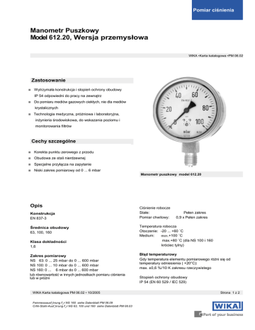 Pomiar ciśnienia Manometr Puszkowy Model 612.20, Wersja przemysłowa WIKA •Karta katalogowa •PM 06.02 Zastosowanie Wytrzymała konstrukcja i stopień ochrony obudowy IP 54 odpowiedni do pracy na zewnątrz Do pomiaru mediów gazowych ciekłych, nie dla mediów krystalicznych Technologia medyczna, próżniowa i laboratoryjna, inżynieria środowiskowa, do wskazania poziomu i monitorowania filtrów Cechy szczególne Korekta punktu zerowego z przodu Obudowa ze stali nierdzewnej Specjalne przyłącza na zapytanie Niski zakres pomiarowy od 0 ... 6 mbar Manometr puszkowy model 612.20 Opis Konstrukcja EN 837-3 Średnica obudowy 63, 100, 160 Klasa dokładności 1,6 Zakres pomiarowy NS 63: 0 ... 25 mbar do 0 ... 600 mbar NS 100: 0 ... 10 mbar do 0 ... 600 mbar NS 160: 0 ... 6 mbar do 0 ... 600 mbar lub równowartość w innych jednostkach pomiaru ciśnienia lub w próżni WIKA Karta katalogowa PM 06.02 • 10/2005 Feinmessausf¸hrung f¸r NG 160 siehe Datenblatt PM 06.09 CrNi-Stahl-Ausf¸hrung f¸r NG 63, 100 und 160 siehe Datenblatt PM 06.03 Ciśnienie robocze Stałe: Pomiar chwilowy: Pełen zakres 0,9 x Pełen zakres Temperatura robocza Otoczenie: -20 ... +60 ˚C Medium: max.+100 ˚C max.+80 ˚C (dla NS 100 i 160 króciec tylny) Błąd temperaturowy Gdy temperatura elementu pomiarowego różni się od temperatury odniesienia ( +20°C): max. ±0,6 %/10 K zakresu rzeczywistego Stopień ochrony obudowy IP 54 (EN 60 529 / lEC 529) Strona 1 z 2 Cechy strandardowe Opcjonalnie Inne przyłącza procesowe Przyłącze Stop miedzi, gwint dolny i tylny NS 63: G ¼B, SW 14 NS 100, 160: G ½B, SW 22 Dopuszczalne przeciążenie lub bezpieczne podciśnienie dla: zakresu > 25 mbar: 10 x pełen zakres zakresu ≤ 25 mbar: 3 x pełen zakres Element pomiarowy Stop miedzi NS 100 i 160: Kołnierz przedni lub tylny NS 100 i 160: Obejma do montażu panelowego Uszczelka NBR Wymiary w mm Mechanizm Stop miedzi Wersja standardowa Króciec radialny dolny Korekta punktu zerowego z przodu Tarcza Białe aluminium z czarnym oznaczenie Wskazówka Czarne aluminium Obudowa Stal nierdzewna Szyba Szkło przemysłowe Króciec tylny ekscentryczny Pokrywa Typu Twist , stal nierdzewna NS Wymiary in mm Waga w kg a b b1 b2 D1 D2 e f G h±1 SW 63 100 9,5 15,5 33 49,5 42 49,5 63 83 64 101 62 99 22 17,5 1) 30 GºB GøB 53 87 14 22 0,19 0,60 160 15,5 49,5 49,5 83 161 159 17,5 50 GøB 118 22 1,10 Standardowe przyłacze procesowe wg EN 837-3 / 7.3 1) króciec tylny centryczny Dane do zamówienia Typ / Przyłącze procesowe / Zakres / Rozmiar przyłącza / Zakres ciśnienia / Dodatkowe opcje Zastrzegamy sobie prawo do zmian i podmiany materiałów. Opisane przyrządy odpowiadają pod względem konstrukcji, wymiarów i materiałów obecnemu stanowi techniki. Strona 2 z 2 WIKA• Karta katalogowa PM 06.02 • 10/2005 Kujawska Fabryka Manometrów KFM S.A. ul. Łęgska 29/35 87-800 Włocławek Tel. 054 230 11 00 Fax 054 230 11 01 E-Mail [email protected] www.kfm.pl