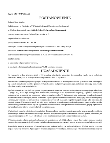 Sygn. akt VII U 1691/15 POSTANOWIENIE Dnia 19 lipca 2016 r. Sąd Okręgowy w Gdańsku w VII Wydziale Pracy i Ubezpieczeń Społecznych w składzie: Przewodniczący: SSR del. do SO Jarosław Matuszczak po rozpoznaniu sprawy w dniu 19 lipca 2016 r. w G. na posiedzeniu niejawnym sprawy z odwołania B. M. i W. M. od decyzji Zakładu Ubezpieczeń Społecznych Oddział w G. z dnia 10.07.2015 r. przeciwko Zakładowi Ubezpieczeń Społecznych Oddział w G. o stwierdzenie braku odpowiedzialności B. M. za zobowiązania składkowe W. M. postanawia: 1. umorzyć postępowanie w sprawie, 2. odstąpić od obciążania ubezpieczonego W. M. kosztami procesu. UZASADNIENIE Na rozprawie w dniu 17 marca 2016 r. W. M. cofnął odwołanie, wskazując, że w zasadzie chodzi mu o rozłożenie należności na raty. B. M. cofnęła odwołanie pismem z dnia 11.05.2016 r. Pełnomocnik pozwanego wyraził zgodę na cofnięcie odwołania W. M. na rozprawie w dniu 17 marca 2016 r., domagając się jednak zasądzenia kosztów procesu w tym kosztów zastępstwa procesowego, natomiast nie zajął stanowiska odnośnie cofnięcia odwołania B. M.. Zgodnie z treścią art. 203§1 k.p.c. pozew (w postępowaniu z zakresu ubezpieczeń społecznych zastępuje go odwołanie – przyp. SO) może być cofnięty bez zezwolenia pozwanego aż do rozpoczęcia rozprawy, a jeżeli z cofnięciem połączone jest zrzeczenie się roszczenia - aż do wydania wyroku. W §3 tego artykułu wskazano, że sąd może uznać za niedopuszczalne cofnięcie pozwu, zrzeczenie się lub ograniczenie roszczenia tylko wtedy, gdy okoliczności sprawy wskazują, że wymienione czynności są sprzeczne z prawem lub zasadami współżycia społecznego albo zmierzają do obejścia prawa. Natomiast w myśl art. 469 k.p.c. sąd uzna zawarcie ugody, cofnięcie pozwu, sprzeciwu lub środka odwoławczego oraz zrzeczenie się lub ograniczenie roszczenia za niedopuszczalne także wówczas, gdyby czynność ta naruszała słuszny interes pracownika lub ubezpieczonego. W niniejszej sprawie cofnięcie odwołania jest dopuszczalne z punktu widzenia przepisów prawa, zasad współżycia społecznego, a także nie narusza słusznego interesu ubezpieczonego i nie zmierza do obejścia prawa, albowiem jak wyjaśnił na rozprawie W. M., w odwołaniu w istocie chodziło im o rozłożenie świadczenia na raty. W konsekwencji postępowanie należało umorzyć na podstawie art. 355§1 zdanie 1 k.p.c. (Sąd wydaje postanowienie o umorzeniu postępowania, jeżeli powód cofnął ze skutkiem prawnym pozew) o czym orzeczono w punkcie 1 sentencji. Rozważając kwestię orzeczenia o kosztach procesu, wskazać należy, że sąd w niniejszym składzie uważa za trafny pogląd wyrażony przez Sąd Apelacyjny w Szczecinie (postanowienie Sądu Apelacyjnego w Szczecinie z dnia 22 sierpnia 2012 r., III AUz 78/12, za: LEX nr 1216410 i z dnia 15 kwietnia 2014 r. III AUa 822/13, za: LEX nr 1451799), zgodnie z którym uregulowanie w przepisie art. 203 k.p.c. w zakresie kosztów stanowi lex specialis w stosunku do art. 109 k.p.c. Oznacza to, że bez względu na to, czy pozwany jest reprezentowany przez pełnomocnika, czy też występuje osobiście w sprawie, sąd zasądzi na jego rzecz koszty tylko wtedy, kiedy żądanie takie pozwany zgłosi. Jeżeli zaś po powzięciu wiadomości o cofnięciu pozwu, pozwany takiego żądania nie zgłosi, sąd nie ma podstaw do zasądzenia kosztów na rzecz strony pozwanej. Powyższe należałoby uzupełnić o stwierdzenie, że tak daleka zmiana sytuacji procesowej jaka następuje na skutek skutecznego cofnięcia pozwu wymaga oddzielnej reakcji pozwanego, także w zakresie kosztów procesu, nawet mimo uprzedniego złożenia wniosku o zasądzenie tychże kosztów np. w odpowiedzi na pozew (odwołanie). Pierwotny wniosek o zwrot kosztów związany jest bowiem ze stanowiskiem strony pozwanej, które zostało zajęte wobec sformułowanego w pozwie roszczenia (żądania odwołania) a nie wobec jego cofnięcia. W sprawie powyższe oznacza, że rozpoznaniu i rozstrzygnięciu w myśl art. 108§1 k.p.c. podlegało jedynie żądanie zwrotu kosztów procesu od W. M., gdyż tylko co do niego pozwany je sformułował. Należy jednak zauważyć, że argumenty dotyczące kosztów procesu związanych z jego osobą byłby identyczne odnośnie B. M.. W razie cofnięcia pozwu (odwołania), pozwany, co do zasady jest traktowany jak wygrywający proces, dlatego należy mu się zwrot kosztów procesu, o ile złoży taki wniosek. Istnieją oczywiście liczne wyjątki od tej zasady, wynikające z konieczności dokonania oceny przyczyn cofnięcia pozwu. Przykładowo, jeżeli cofnięcie pozwu nastąpiło wskutek dokonania zapłaty przez pozwanego po wytoczeniu powództwa, to pozwany jest traktowany w takim przypadku jako przegrywający proces i obowiązany jest w związku z tym do zwrotu kosztów procesu powodowi. Stanowisko to wynika z faktu, że zaspokojenie przez pozwanego roszczenia powoda po wytoczeniu pozwu jest równoznaczne z przegraniem przez niego procesu (por. postanowienie Sądu Apelacyjnego w Białymstoku z dnia 30.11.1995r., I ACz 366/05, Lex 25504). W niniejszej sprawie ubezpieczeni zrezygnowali w całości z ochrony prawnej bez zmiany stanowiska pozwanego, a zatem należy potraktować ich jako przegranych w myśl ogólnej zasady wyrażonej w art. 98§1 k.p.c. Od tej zasady odpowiedzialności za wynik procesu, występują jednak pewne wyjątki. Wśród nich znajduje się w szczególności zasada słuszności, obowiązująca na gruncie art. 102 k.p.c. W myśl przywołanego przepisu, w wypadkach szczególnie uzasadnionych sąd może zasądzić od strony przegrywającej tylko część kosztów albo nie obciążać jej w ogólne kosztami. Kwestia przyjęcia przez Sąd, że w sprawie wystąpiły określone w tymże przepisie „szczególne okoliczności”, należy do swobodnego, choć oczywiście nie dowolnego uznania Sądu. A zatem do jego dyskrecjonalnej władzy należy rozstrz