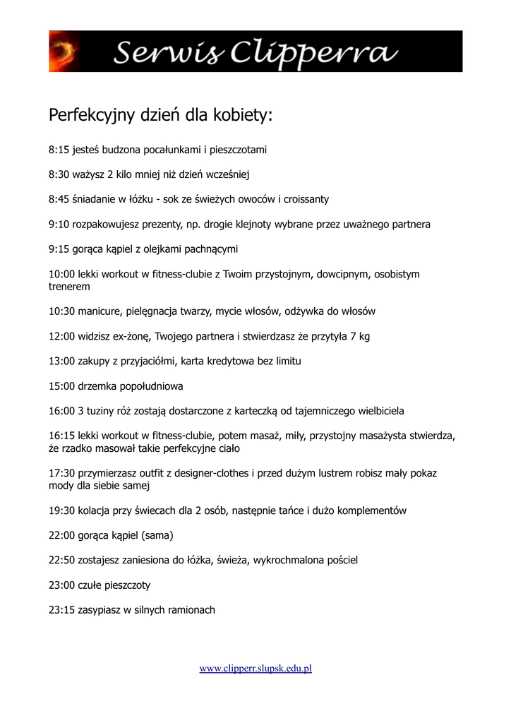 Perfekcyjny dzień dla kobiety: 8:15 jesteś budzona pocałunkami i pieszczotami 8:30 ważysz 2 kilo mniej niż dzień wcześniej 8:45 śniadanie w łóżku - sok ze świeżych owoców i croissanty 9:10 rozpakowujesz prezenty, np. drogie klejnoty wybrane przez uważnego partnera 9:15 gorąca kąpiel z olejkami pachnącymi 10:00 lekki workout w fitness-clubie z Twoim przystojnym, dowcipnym, osobistym trenerem 10:30 manicure, pielęgnacja twarzy, mycie włosów, odżywka do włosów 12:00 widzisz ex-żonę, Twojego partnera i stwierdzasz że przytyła 7 kg 13:00 zakupy z przyjaciółmi, karta kredytowa bez limitu 15:00 drzemka popołudniowa 16:00 3 tuziny róż zostają dostarczone z karteczką od tajemniczego wielbiciela 16:15 lekki workout w fitness-clubie, potem masaż, miły, przystojny masażysta stwierdza, że rzadko masował takie perfekcyjne ciało 17:30 przymierzasz outfit z designer-clothes i przed dużym lustrem robisz mały pokaz mody dla siebie samej 19:30 kolacja przy świecach dla 2 osób, następnie tańce i dużo komplementów 22:00 gorąca kąpiel (sama) 22:50 zostajesz zaniesiona do łóżka, świeża, wykrochmalona pościel 23:00 czułe pieszczoty 23:15 zasypiasz w silnych ramionach www.clipperr.slupsk.edu.pl