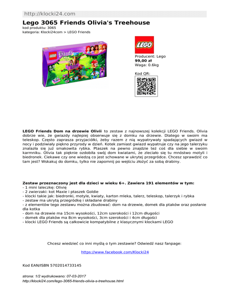 http://klocki24.com Lego 3065 Friends Olivia's Treehouse kod produktu: 3065 kategoria: Klocki24com > LEGO Friends Producent: Lego 99,00 zł Waga: 0.6kg Kod QR: LEGO Friends Dom na drzewie Olivii to zestaw z najnowszej kolekcji LEGO Friends. Olivia dobrze wie, że gwiazdy najlepiej obserwuje się z domku na drzewie. Dlatego w swoim ma teleskop. Często zaprasza przyjaciółki, żeby razem z nią wypatrywały spadających gwiazd w nocy i podziwiały piękno przyrody w dzień. Kotek zamiast gwiazd wypatruje czy na jego talerzyku znalazła się już smakowita rybka. Ptaszek na pewno znajdzie też coś dla siebie w swoim karmniku. Olivia tak pięknie ozdobiła swój dom kwiatami, że zleciało się tu mnóstwo motyli i biedronek. Ciekawe czy one wiedzą co jest schowane w ukrytej przegródce. Chcesz sprawdzić co tam jest? Wskakuj do domku, tylko nie zapomnij po wejściu złożyć za sobą drabiny. Zestaw przeznaczony jest dla dzieci w wieku 6+. Zawiera 191 elementów w tym: - 1 mini laleczkę: Olivię - 2 zwierzaki: kot Maxie i ptaszek Goldie - klocki takie jak: biedronki, motyle, kwiaty, karton mleka, talerz, teleskop, talerzyk i rybka - zestaw ma ukrytą przegródkę i składane drabiny - z elementów tego zestawu można zbudować: dom na drzewie, domek dla ptaków oraz posłanie dla kotka - dom na drzewie ma 15cm wysokości, 12cm szerokości i 12cm długości - domek dla ptaków ma 8cm wysokości, 3cm szerokości i 4cm długości - klocki LEGO Friends są całkowicie kompatybilne z klasycznymi klockami LEGO Chcesz wiedzieć co inni myślą o tym zestawie? Odwiedź nasz fanpage: https://www.facebook.com/Klocki24 Kod EAN/ISBN 5702014733145 strona: 1/2 wydrukowano: 07-03-2017 http://klocki24.com/lego-3065-friends-olivia-s-treehouse.html