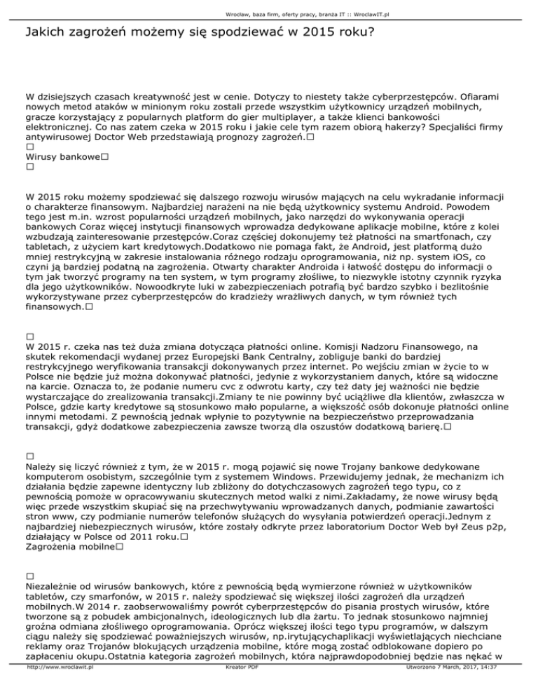 Wrocław, baza firm, oferty pracy, branża IT :: WroclawIT.pl Jakich zagrożeń możemy się spodziewać w 2015 roku? W dzisiejszych czasach kreatywność jest w cenie. Dotyczy to niestety także cyberprzestępców. Ofiarami nowych metod ataków w minionym roku zostali przede wszystkim użytkownicy urządzeń mobilnych, gracze korzystający z popularnych platform do gier multiplayer, a także klienci bankowości elektronicznej. Co nas zatem czeka w 2015 roku i jakie cele tym razem obiorą hakerzy? Specjaliści firmy antywirusowej Doctor Web przedstawiają prognozy zagrożeń. Wirusy bankowe W 2015 roku możemy spodziewać się dalszego rozwoju wirusów mających na celu wykradanie informacji o charakterze finansowym. Najbardziej narażeni na nie będą użytkownicy systemu Android. Powodem tego jest m.in. wzrost popularności urządzeń mobilnych, jako narzędzi do wykonywania operacji bankowych Coraz więcej instytucji finansowych wprowadza dedykowane aplikacje mobilne, które z kolei wzbudzają zainteresowanie przestępców.Coraz częściej dokonujemy też płatności na smartfonach, czy tabletach, z użyciem kart kredytowych.Dodatkowo nie pomaga fakt, że Android, jest platformą dużo mniej restrykcyjną w zakresie instalowania różnego rodzaju oprogramowania, niż np. system iOS, co czyni ją bardziej podatną na zagrożenia. Otwarty charakter Androida i łatwość dostępu do informacji o tym jak tworzyć programy na ten system, w tym programy złośliwe, to niezwykle istotny czynnik ryzyka dla jego użytkowników. Nowoodkryte luki w zabezpieczeniach potrafią być bardzo szybko i bezlitośnie wykorzystywane przez cyberprzestępców do kradzieży wrażliwych danych, w tym również tych finansowych. W 2015 r. czeka nas też duża zmiana dotycząca płatności online. Komisji Nadzoru Finansowego, na skutek rekomendacji wydanej przez Europejski Bank Centralny, zobliguje banki do bardziej restrykcyjnego weryfikowania transakcji dokonywanych przez internet. Po wejściu zmian w życie to w Polsce nie będzie już można dokonywać płatności, jedynie z wykorzystaniem danych, które są widoczne na karcie. Oznacza to, że podanie numeru cvc z odwrotu karty, czy też daty jej ważności nie będzie wystarczające do zrealizowania transakcji.Zmiany te nie powinny być uciążliwe dla klientów, zwłaszcza w Polsce, gdzie karty kredytowe są stosunkowo mało popularne, a większość osób dokonuje płatności online innymi metodami. Z pewnością jednak wpłynie to pozytywnie na bezpieczeństwo przeprowadzania transakcji, gdyż dodatkowe zabezpieczenia zawsze tworzą dla oszustów dodatkową barierę. Należy się liczyć również z tym, że w 2015 r. mogą pojawić się nowe Trojany bankowe dedykowane komputerom osobistym, szczególnie tym z systemem Windows. Przewidujemy jednak, że mechanizm ich działania będzie zapewne identyczny lub zbliżony do dotychczasowych zagrożeń tego typu, co z pewnością pomoże w opracowywaniu skutecznych metod walki z nimi.Zakładamy, że nowe wirusy będą więc przede wszystkim skupiać się na przechwytywaniu wprowadzanych danych, podmianie zawartości stron www, czy podmianie numerów telefonów służących do wysyłania potwierdzeń operacji.Jednym z najbardziej niebezpiecznych wirusów, które zostały odkryte przez laboratorium Doctor Web był Zeus p2p, działający w Polsce od 2011 roku. Zagrożenia mobilne Niezależnie od wirusów bankowych, które z pewnością będą wymierzone również w użytkowników tabletów, czy smarfonów, w 2015 r. należy spodziewać się większej ilości zagrożeń dla urządzeń mobilnych.W 2014 r. zaobserwowaliśmy powrót cyberprzestępców do pisania prostych wirusów, które tworzone są z pobudek ambicjonalnych, ideologicznych lub dla żartu. To jednak stosunkowo najmniej groźna odmiana złośliwego oprogramowania. Oprócz większej ilości tego typu programów, w dalszym ciągu należy się spodziewać poważniejszych wirusów, np.irytującychaplikacji wyświetlających niechciane reklamy oraz Trojanów blokujących urządzenia mobilne, które mogą zostać odblokowane dopiero po zapłaceniu okupu.Ostatnia kategoria zagrożeń mobilnych, która najprawdopodobniej będzie nas nękać w http://www.wroclawit.pl Kreator PDF Utworzono 7 March, 2017, 14:37 Wrocław, baza firm, oferty pracy, branża IT :: WroclawIT.pl 2015 r. to wirusy mające na celu nieautoryzowane wysyłanie kosztownych SMS-ów Premium, a także malware przeznaczone do instalowania innych złośliwych programów. Jako przykład można podać Android.Warmle.1.origin., który masowo wysyła wiadomości SMS, zawierające linki ze szkodliwą zawartością. Program został wykryty w listopadzie 2014 roku. Szacujemy, że w tym okresie zainfekował on ponad 14 tysięcy komputerów w 20 krajach na całym świecie. Nowy cel ataków gracze W świecie komputerów osobistych w 2014 roku pojawiło się kilka wirusów wymierzonych w nowe, nieatakowane dotychczas wirusami obszary.Przykładem są platformy onlinedla gier w trybie multiplayer. Jak dotąd sami tylko użytkownicy platformy Steam spotkali się z dwoma wirusami wykradającymi wartościoweelementy gier,posiadające realną wartość rynkową również poza wirtualnym światem.Oba Trojany (Trojana SteamBurglar.1 oraz Trojan.SteamLogger.1), które odkryli analitycy Doctor Web, nie muszą być ostatnimi, gdyż rynek gier wideo jest coraz atrakcyjniejszym celem dla cyberprzestępców.Kolejną po Steam-ie zagrożoną platformą może być jej konkurent rynkowy platformaOrigin. Nie tylko Microsoft Windows Podobnie jak miało to miejsce w minionych 12 miesiącach, tak również w 2015 użytkowników komputerów nadal będą atakować Trojany w formie wtyczek do przeglądarek www, odpowiedzialne za wyświetlanie niechcianych reklam i za klikanie w nie bez wiedzy i zgody użytkownika. Z całą pewnością przestępcy nie zrezygnują też z prób atakowania alternatywnych systemów operacyjnych dla PC i