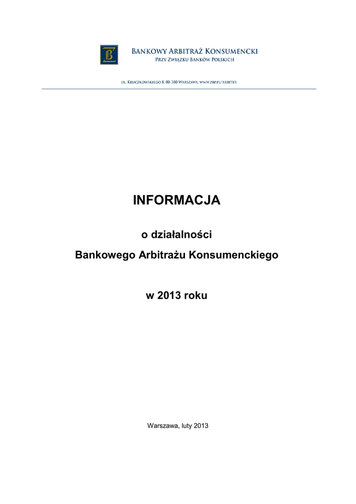 INFORMACJA o działalności Bankowego Arbitrażu Konsumenckiego w 2013 roku Warszawa, luty 2013 A. Informacje ogólne Bankowy Arbitraż Konsumencki (BAK) rozpoczął swoją działalność w dniu 1 marca 2002 roku. W marcu 2010 roku skończyła się druga kadencja Arbitra, w związku z czym Zarząd Związku Banków Polskich powołał ponownie Katarzynę Marczyńską na stanowisko Arbitra Bankowego na okres kolejnej, trzeciej kadencji. Do Bankowego Arbitrażu Konsumenckiego należą obecnie wszystkie bankiczłonkowie ZBP oraz te banki spółdzielcze nie zrzeszone w Związku, które wyraziły wolę współpracy z BAK. Bankowy Arbitraż Konsumencki współpracuje w ramach Biura Związku Banków Polskich z Zespołem Bankowości Detalicznej i Rynków Finansowych. Koszty funkcjonowania Bankowego Arbitrażu Konsumenckiego pokrywane są całości przez banki-członków Związku Banków Polskich. w B. Podstawowe informacje statystyczne dotyczące wniosków W okresie od 1 stycznia do 31 grudnia 2013 roku wpłynęły do Bankowego Arbitrażu Konsumenckiego 1253 wnioski. Do dnia 31 grudnia 2013 roku wydano orzeczenia w 1164 sprawach, z tego: • • • • na korzyść klienta – 182, zakończonych ugodą pomiędzy stronami sporu – 53, na korzyść banku –366, zakończonych zwrotem lub odrzuceniem wniosku –563. Zakres merytoryczny następujący: • • • • • wpływających wniosków przedstawiał się w sposób rachunki i lokaty bankowe –363, kredyty bankowe – 636, obrót płatniczy, w tym różnego rodzaju karty bankowe –189, papiery wartościowe -0, inne – 65. Średnia wartość przedmiotu sporu w roku 2013 wyniosła 4438,40 zł, natomiast średni czas rozpatrywania wniosku przez Arbitra w ubiegłym roku to 56 dni. C. Wnioski przekazywane do rozstrzygnięcia przez Arbitra Bankowego W 2013 roku nadal zmieniał się zakres merytoryczny spraw skierowanych do Arbitra, gdyż do połowy spadła liczba skarg dotyczących kredytów. Trzy czwarte z tych skarg obejmowała kredyty hipoteczne. Najczęstszymi przyczynami sporów w tym zakresie były występujące w umowach klauzule niedozwolone oraz zasady ustanawiania 2 zabezpieczeń, w szczególności ubezpieczeń. Wnioskodawcy podnosili niedopuszczalność konstrukcji ubezpieczenia, w szczególności ubezpieczenia niskiego wkładu własnego, a także niejasne zapisy umowne dotyczące sposobu wyliczania składki i podmiotu ubezpieczającego. Nieznacznie wzrosła liczba konsumentów, którzy złożyli skargi dotyczące umów o kredyt konsumencki, zaś większość tych wniosków dotyczyła nieprawidłowego postepowania banku po złożeniu przez kredytobiorcę oświadczenia o odstąpieniu od umowy. Na stałym poziomie utrzymuje się liczba wniosków wnoszonych przez spadkobierców kredytobiorców, w których żądają zwolnienia ich z obowiązku spłaty długu i podnoszą zarzut udzielenia kredytu mimo braku zdolności kredytowej oraz zarzut nieskorzystania przez bank z ubezpieczenia spłaty kredytu. Część skarg dotyczyła niezasadnej odmowy wypłaty przez ubezpieczyciela świadczenia z tytułu śmierci ubezpieczonego, skutkującej obowiązkiem spłaty należności przez spadkobierców. Liczba próśb o zobowiązanie banku do przeprowadzenia restrukturyzacji kredytu nie uległa zwiększeniu i nadal większość z nich kończy się ugodą. W 2013 roku odnotowano skargi konsumentów dotyczące naruszania przez banki obowiązków informacyjnych w zakresie grupowych ubezpieczeń na życie powiązanych z umowami kredytu oraz niesprawdzania warunków objęcia kredytobiorcy ubezpieczeniem na wypadek utraty pracy. W 2013 roku wzrosła liczba spraw dotyczących lokat i rachunków, a większość skarg z tego zakresu dotyczyła produktów powiązanych z ubezpieczeniowym funduszem kapitałowym. Najczęstsze zarzuty to: brak należytej informacji o stronach umowy i produkcie, a wręcz prezentowanie go jako typowej lokaty bankowej, brak informacji o ryzyku i skutkach przedterminowej rezygnacji z produktu, niedostarczanie OWU albo ich przesyłanie po upływie terminu na odstąpienie od umowy, sprzedaż telefoniczna uniemożliwiająca zapoznanie się z warunkami przyszłej umowy, brak pomocy banku przy odzyskiwaniu wpłaconych kwot, brak współpracy na linii bank – ubezpieczyciel. Na poziomie podobnym do lat ubiegłych utrzymuje się liczba wniosków związanych z transakcjami oszukańczymi dokonywanymi za pomocą kart płatniczych oraz liczba kwestionowanych przez klientów transakcji bankomatowych. Poza normalną procedurą rozstrzygania sporów, wiele osób pragnie zasięgnąć porady u Arbitra w konkretnych sprawach lub też przedstawić swój pogląd dotyczący działalności banków w formie rozmowy telefonicznej. Ilość takich kontaktów nadal znacząco przewyższa liczbę składanych formalnych wniosków. D. Rada Arbitra Bankowego Rada Arbitra Bankowego jest gremium, w skład którego wchodzą przedstawiciele instytucji rządowych i nadzorczych, organizacji konsumenckich największych banków komercyjnych oraz Związku Banków Polskich. Do zadań Rady należy wymiana 3 doświadczeń z zakresu ochrony praw konsumenta usług bankowych, a w tym w szczególności: • • • • analiza głównych przyczyn sporów między bankami a konsumentami, omawianie praktycznych aspektów funkcjonowania regulacji prawnych dotyczących ochrony konsumenta usług bankowych, analiza struktury merytorycznej oraz statystycznej wniosków składanych do Bankowego Arbitrażu Konsumenckiego oraz wydawanych orzeczeń, konsultacja projektów nowych przedsięwzięć z tego zakresu podejmowanych przez różne instytucje. Rada Arbitra III kadencji została powołana przez Radę Związku w styczniu 2011 roku. Po uzupełnieniach składu Rady, w jej pracach biorą udział obecnie następujące osoby reprezentujące następujące instytucje: 1. 2. 3. 4. 5. 6. 7. 8. 9. 10. 11. 12. 13. 14. 15. 16. 17. 18. 19. Jerzy Bańka – Wiceprezes Związku Banków Polskich Izabela Dą