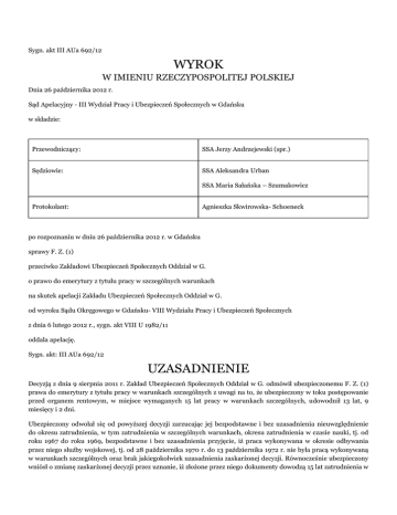 Sygn. akt III AUa 692/12 WYROK W IMIENIU RZECZYPOSPOLITEJ POLSKIEJ Dnia 26 października 2012 r. Sąd Apelacyjny - III Wydział Pracy i Ubezpieczeń Społecznych w Gdańsku w składzie: Przewodniczący: SSA Jerzy Andrzejewski (spr.) Sędziowie: SSA Aleksandra Urban SSA Maria Sałańska – Szumakowicz Protokolant: Agnieszka Skwirowska- Schoeneck po rozpoznaniu w dniu 26 października 2012 r. w Gdańsku sprawy F. Z. (1) przeciwko Zakładowi Ubezpieczeń Społecznych Oddział w G. o prawo do emerytury z tytułu pracy w szczególnych warunkach na skutek apelacji Zakładu Ubezpieczeń Społecznych Oddział w G. od wyroku Sądu Okręgowego w Gdańsku- VIII Wydziału Pracy i Ubezpieczeń Społecznych z dnia 6 lutego 2012 r., sygn. akt VIII U 1982/11 oddala apelację. Sygn. akt: III AUa 692/12 UZASADNIENIE Decyzją z dnia 9 sierpnia 2011 r. Zakład Ubezpieczeń Społecznych Oddział w G. odmówił ubezpieczonemu F. Z. (1) prawa do emerytury z tytułu pracy w warunkach szczególnych z uwagi na to, że ubezpieczony w toku postępowanie przed organem rentowym, w miejsce wymaganych 15 lat pracy w warunkach szczególnych, udowodnił 13 lat, 9 miesięcy i 2 dni. Ubezpieczony odwołał się od powyższej decyzji zarzucając jej bezpodstawne i bez uzasadnienia nieuwzględnienie do okresu zatrudnienia, w tym zatrudnienia w szczególnych warunkach, okresu zatrudnienia w czasie nauki, tj. od roku 1967 do roku 1969, bezpodstawne i bez uzasadnienia przyjęcie, iż praca wykonywana w okresie odbywania przez niego służby wojskowej, tj. od 28 października 1970 r. do 13 października 1972 r. nie była pracą wykonywaną w warunkach szczególnych oraz brak jakiegokolwiek uzasadnienia zaskarżonej decyzji. Równocześnie ubezpieczony wniósł o zmianę zaskarżonej decyzji przez uznanie, iż złożone przez niego dokumenty dowodzą 15 lat zatrudnienia w szczególnych warunkach. Ubezpieczony wniósł nadto o dopuszczenie dowodu z jego akt osobowych, które zobowiązał się przedłożyć w momencie uzyskania ich z odpowiedniego archiwum. W uzasadnieniu ubezpieczony wskazał, że w złożonych przez niego dokumentach zawarta została informacja, iż wykonywał prace w warunkach szczególnych już w czasie zatrudnienia w okresie nauki a następnie w okresie odbywania służby wojskowej. W odpowiedzi na odwołanie organ rentowy wniósł o jego oddalenie. Wyrokiem z dnia 6 lutego 2012 r. Sąd Okręgowy w Gdańsku - VIII Wydział Pracy i Ubezpieczeń Społecznych w pkt 1. zmienił zaskarżoną decyzję i przyznał F. Z. (1) prawo do emerytury, poczynając od dnia 11 lipca 2011 roku, w pkt 2. stwierdził odpowiedzialność organu rentowego za nie ustalenie ostatniej okoliczności niezbędnej do wydania decyzji i w pkt 3. oddalił odwołanie w przedmiocie doliczenia do stażu pracy wykonywanej w warunkach szczególnych okres nauki, w szkole zawodowej w latach od 1967-1969r. Powyższe rozstrzygnięcie Sąd Okręgowy oparł następujące ustalenia i rozważania. F. Z. (1), ur. dnia (...), w dniu 11 lipca 2011 r. złożył w Zakładzie Ubezpieczeń Społecznych Oddział w G. wniosek o emeryturę. Ubezpieczony nie jest członkiem OFE i na dzień 1 stycznia 1999 r. i rozwiązał stosunek pracy. Nadto, udowodnił wymagany okres składkowy i nieskładkowy w wymiarze 28 lat, 11 miesięcy i 19 dni oraz 13 lat, 9 miesięcy i 2 dni okresu pracy w warunkach szczególnych. Z uwagi na powyższe, zaskarżoną w niniejszym postępowaniu decyzją z dnia 9 sierpnia 2011 r. Zakład Ubezpieczeń Społecznych Oddział w G. odmówił ubezpieczonemu F. Z. (1) prawa do emerytury z tytułu pracy w warunkach szczególnych. Organ nie zaliczył ubezpieczonemu do pracy w warunkach szczególnych okresu pracy w czasie odbywania zasadniczej służby wojskowej oraz w trakcie praktycznej nauki zawodu od 1967 do 1969, kiedy to ubezpieczony był uczniem szkoły zawodowej. W okresie od 30 czerwca 1969 r. ubezpieczony został zatrudniony w Stoczni Marynarki Wojennej S.A. w G. na stanowisku galwanizera. Praca ta wykonywana była w warunkach szczególnych. W okresie od 28 października 1970 r. do 22 października 1972 r. F. Z. (1) odbywał zasadniczą służbę wojskową. Po jej zakończeniu ponownie, w dniu 23 października 1972 r., podjął prace w w/w zakładzie pracy, gdzie był zatrudniony na tym samym stanowisku do dnia 31 marca 1985 r. Na tle tak ustalonego stanu faktycznego, w ocenie Sądu Okręgowego, odwołanie ubezpieczonego F. Z. (2) zasługuje na uwzględnienie. Sąd ten przywołał i omówił znajdujące zastosowanie przepisy prawa i wskazał, że w sprawie bezspornym jest, że na dzień wydania zaskarżonej decyzji ubezpieczony rozwiązał stosunek pracy, osiągnął wymagany wiek 60 lat w dniu 10 lipca 2011 r., nie przystąpił do otwartego funduszu emerytalnego i wykazał łączny okres składkowy i nieskładkowy przekraczający 25 lat. Przedmiotem sporu pozostawało, czy za okres zatrudnienia w szczególnych warunkach może zostać uznany okres odbywania zasadniczej służby wojskowej od 28 października 1970 r. do 22 października 1972 r. Sam okres zatrudnienia nie był sporny pomiędzy stronami, gdyż został on uwzględniony przez pozwanego jako składkowy. Jednakże, organ rentowy kwestionował zasadność zaliczenia powyższego okresu do pracy w warunkach szczególnych, z uwagi na sam fakt odbywania służby wojskowej. Sąd Okręgowy przytoczył treść wyroku Sądu Najwyższego z dnia 25 lutego 2010 r. w sprawie o sygn. akt: II UK 219/09, w którym stwierdzono, że okres zasadniczej służby wojskowej odbytej w czasie trwania stosunku pracy w szczególnych warunkach lub w szczególnym charakterze zalicza się do stażu pracy wymaganego do nabycia prawa do emerytury w niższym wieku emerytalnym (art. 32 ust. 1 ustawy z 1998 r. o emeryturach i rentach z FUS) jeżeli pracownik w ustawowym terminie zgłosił swój powrót do tego zatrudnienia. Nadto, zgodnie z treścią wyroku Sądu Najwyższego z dnia 25 lutego 2010 r. w sprawie o sygn.