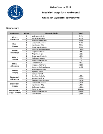 Dzień Sportu 2012 Medaliści wszystkich konkurencji wraz z ich wynikami sportowymi Gimnazjum Konkurencja 60 m – dziewczęta 60m – chłopcy 400 m dziewczęta 400m – chłopcy 800 m dziewczęta 1000m – chłopcy Skok w dal dziewczęta Skok w dal chłopcy Pchnięcie kulą [4kg] – chłopcy Miejsce 1 2 3 1 2 3 1 2 3 1 2 3 1 2 3 1 2 3 1 2 3 1 2 3 1 2 3 Nazwisko i Imię Majewska Maria Roszkowska Zofia Ronaldowska Karina Mazurczak Adrian Sypniewski Filip Chrzanowski Maciej Skurczyńska Magdalena Majewska Maria Wujków Alicja Chrzanowski Maciej Karłowski Bartosz Ronaldowski Kacper Teresa Bakuła Smoczyńska Marta Skurczyńska Magdalena Butkiewicz Mikołaj Bryliński Jakub Jędryka Paweł Roszkowska Zofia Bogacz Karolina Świdurska Magdalena Mazurczak Adrian Sypniewski Filip Karłowski Bartosz Obderko Jan Ronaldowski Kacper Ciara Michał Wynik 9,19s 9,33s 9,46s 7,49s 7,53s 7,90s 1:12,8 1:18,7 1:21,3 1:04,6 1:06,1 1:07,7 3:10,2 3:39,5 4:06 4,00m 3,60m 3,30m 5,70m 5,40m 5,25m 11,04m 9,84m 7,68m Liceum Konkurencja 60 m – dziewczęta 60m – chłopcy 400 m dziewczęta 400m – chłopcy 800 m dziewczęta 1000m – chłopcy Skok w dal dziewczęta Skok w dal chłopcy Pchnięcie kulą [7,26kg] – chłopcy Nazwisko i Imię Miejsce Wynik 1 2 3 1 2 3 1 2 3 1 2 Walasek Kamila Chocimska Agata Marek Julia Radzimiński Mikołaj Pławski Piotr Basałaj Jan Walasek Kamila Cieślak Paulina Raczkowska Katarzyna Kolasa Gracjan Pławski Piotr 9,11s 9,84s 10,36s 7,41s 7,94s 7,96s 1:19,2 1:32,9 1:42,6 1:04,0 1:09,8 1 Jaśniak Joanna 3:30,5 1 Kulka Jan 3:08,8 1 2 3 1 2 1 Walasek Kamila Chocimska Agata Zawiszewska Kamila Basałaj Jan Pławski Piotr Zmudziński Paweł 4,2m 3,43m 2,85m 4,9m 4,8m 9,27m 2 Masłowski Mateusz REKORD SZKOŁY 7,49m