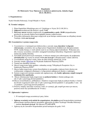 Regulamin IX Mistrzostw Nysy Mężczyzn w siatkówce plażowej im. Jakuba Zagai 20-21. 08.2011r. I. Organizatorzy: Nyski Ośrodek Rekreacji, Urząd Miejski w Nysie. II. Termin i miejsce: 1. Plaża Kąpieliska Miejskiego przy ul. Ujejskiego w Nysie 20-21.08.2011r. 2. Odprawa techniczna dla drużyn o godz. 9:45 3. Pierwszy mecze turnieju rozpoczyna się punktualnie o godz. 10:00 (niepunktualne przybycie na zawody będzie bezwzględnie karane walkowerem). 4. Wszystkie informacje dotyczące rozgrywek są na bieżąco umieszczane na oficjalnej stronie Turnieju: www.nor.nysa.pl III. Uczestnictwo i system rozgrywek: 1. Uczestnictwo w turniejach jest dobrowolne a zawody mają charakter wyłącznie rekreacyjny, uczestnicy nie są objęci przez Organizatora dodatkowym ubezpieczeniem NNW, każdy biorący w nich udział czyni to na własną odpowiedzialność. Wskazane jest, aby wszyscy uczestnicy zawodów zasięgnęli konsultacji lekarskiej. Organizator zapewnia medyczną opiekę lekarską. 2. Zawodnik przed pierwszym turniejem, w którym startuje jest zobowiązany do podpisania oświadczenia wg wzoru na stronie www.nor.nysa.pl o ubezpieczeniu i stanie zdrowia. 3. Uczestnikami mogą być osoby, które do dnia turnieju ukończyły 16 lat 4. Zawody zostały zgłoszone do Wydziału Siatkówki Plażowej OZPS. 5. Turniej ma charakter otwarty. 6. Mecze rozgrywane będą zgodnie z aktualną wersją "Oficjalnych Przepisów Gry w Siatkówkę Plażową PZPS". 7. Mecze będą rozgrywane system brazylijskim (w przypadku większej ilości drużyn nie wykluczamy wstępnych eliminacji z wyłączeniem najlepszych drużyn z rankingu). 8. System rozgrywek turnieju zostanie tak zaplanowany, aby każdy zgłoszony zespół rozegrał minimum dwa spotkania. 9. Mecze eliminacyjne będą rozgrywane na jednym boisku w formie jednego seta (do 21 pkt z przewagą dwóch punktów). 10.Mecze ćwierćfinałowe, półfinałowe i finałowe rozgrywane będą na jednym boisku w formie do dwóch wygranych setów (do 21 pkt z przewagą dwóch punktów w przypadku 3 seta – do 15 punktów z przewagą dwóch punktów). 11.Przerwy między meczami wynoszą 5 min. (w sytuacji, gdy zespół gra mecz po meczu, przerwa może być przedłużona do 10 min.) IV. Zgłoszenia i wpisowe: 1. W turniejach mogą uczestniczyć pary, które: • Zgłoszą wcześniej swój udział do organizatora, do piątku przed bezpośrednim terminem planowanego turnieju poprzez przesłanie zgłoszenia na adres Nyskiego Ośrodka Rekreacji – mailem [email protected] lub faksem (77) 433 4279. • Zgłoszą się do zawodów bezpośrednio przed turniejem do godz. 9:45. 2. Wpisowe do turnieju wynosi: 25 zł od pary. W ramach wpisowego wszyscy startujący zawodnicy otrzymają od organizatorów talony żywieniowe. V. Nagrody 1. Zawodnicy drużyn, którzy zajmą miejsca I-VIII otrzymają nagrody rzeczowe. VI. Prawa i obowiązki drużyn: 1. Każda drużyna przystępując do rozgrywek wyraża zgodę na warunki uczestnictwa określone niniejszym regulaminem. 2. Zawody będą prowadzić sędziowie OZPS, przeszkoleni z zakresu siatkówki plażowej. Ich rolą będzie przede wszystkim pomoc zawodnikom w obiektywnym i sprawnym rozgrywaniu meczów. Zawodnicy proszeni są o zachowanie fair-play oraz wsparcie swoją wiedzą i postawą sędziów w ich działaniach. 3. W wyjątkowych przypadkach (np.: nie stawienie się sędziego) mecz sędziowany będzie przez osobę wytypowaną przez kapitanów drużyn w porozumieniu z przedstawicielem organizatora. 4. Drużyny muszą występować w jednolitych koszulkach. Zespół nie spełniający tego wymogu przegrywa spotkanie walkowerem. 5. Za zniszczenia obiektu lub jego wyposażenia wszelkie koszty związane z jego naprawą ponoszą zawodnicy zespołu. 6. Drużyny w trakcie trwania zawodów odpowiedzialne są za osoby towarzyszące im oraz zobowiązane są do niesienia czynnej pomocy w jawnych przypadkach naruszenia porządku publicznego. 7. W przypadku, gdy turniej będzie rozgrywany w ciągu dwóch dni, to zespół który po pierwszym dniu będzie zajmował miejsce upoważniające go do gry drugiego dnia nie stawi się na zawody, zostanie automatycznie zdyskwalifikowany i przesunięty na ostatnie miejsce w danym turnieju, bez prawa do nagrody. VII. Postanowienia końcowe: 1. Organizator zastrzega sobie prawo wprowadzenia zmian w powyższym regulaminie. 2. Wpisowe do rozgrywek nie podlega zwrotowi. 3. Organizator nie ponosi odpowiedzialności za zmianę terminu z przyczyn od niego niezależnych. 4. Organizator nie ponosi odpowiedzialności za rzeczy pozostawione lub zagubione. 5. W sprawach spornych lub nie objętych regulaminem decyduje obecny na turnieju Przedstawiciel organizatora. Dyrektor NOR Mirosław Aranowicz