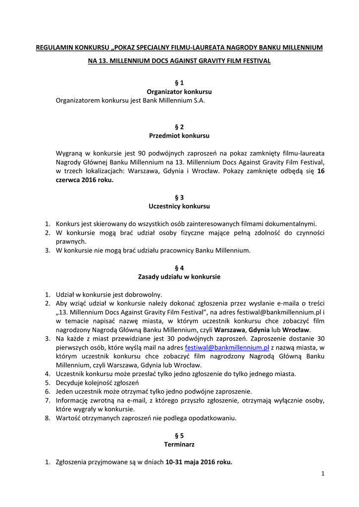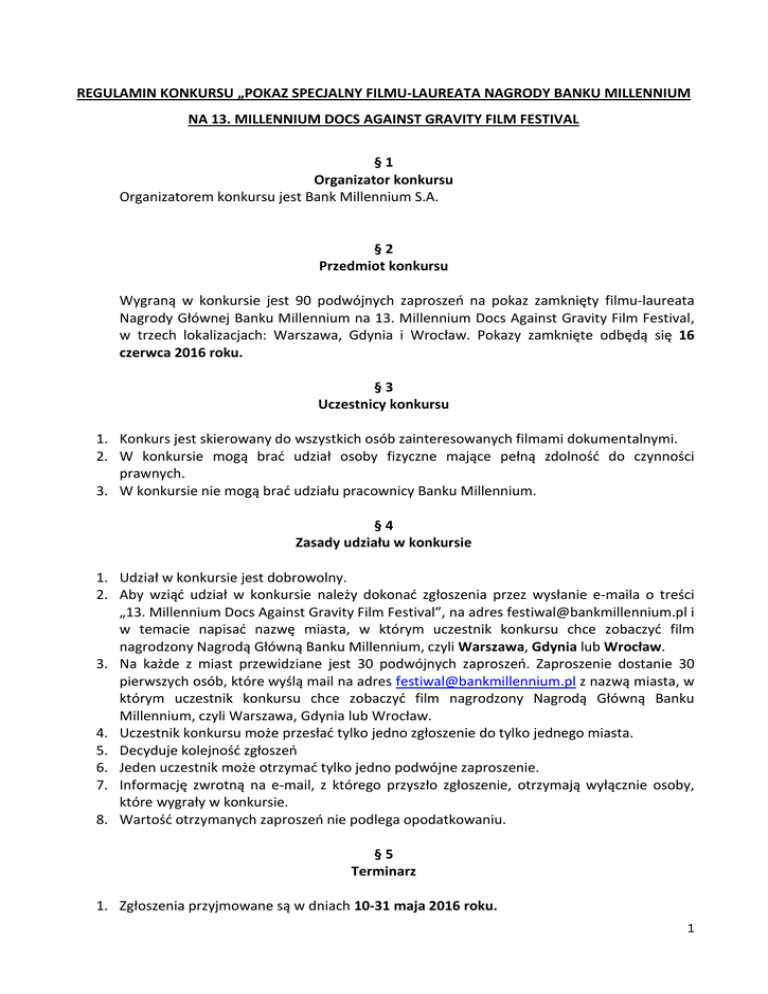 REGULAMIN KONKURSU „POKAZ SPECJALNY FILMU-LAUREATA NAGRODY BANKU MILLENNIUM NA 13. MILLENNIUM DOCS AGAINST GRAVITY FILM FESTIVAL §1 Organizator konkursu Organizatorem konkursu jest Bank Millennium S.A. §2 Przedmiot konkursu Wygraną w konkursie jest 90 podwójnych zaproszeń na pokaz zamknięty filmu-laureata Nagrody Głównej Banku Millennium na 13. Millennium Docs Against Gravity Film Festival, w trzech lokalizacjach: Warszawa, Gdynia i Wrocław. Pokazy zamknięte odbędą się 16 czerwca 2016 roku. §3 Uczestnicy konkursu 1. Konkurs jest skierowany do wszystkich osób zainteresowanych filmami dokumentalnymi. 2. W konkursie mogą brać udział osoby fizyczne mające pełną zdolność do czynności prawnych. 3. W konkursie nie mogą brać udziału pracownicy Banku Millennium. §4 Zasady udziału w konkursie 1. Udział w konkursie jest dobrowolny. 2. Aby wziąć udział w konkursie należy dokonać zgłoszenia przez wysłanie e-maila o treści „13. Millennium Docs Against Gravity Film Festival”, na adres [email protected] i w temacie napisać nazwę miasta, w którym uczestnik konkursu chce zobaczyć film nagrodzony Nagrodą Główną Banku Millennium, czyli Warszawa, Gdynia lub Wrocław. 3. Na każde z miast przewidziane jest 30 podwójnych zaproszeń. Zaproszenie dostanie 30 pierwszych osób, które wyślą mail na adres [email protected] z nazwą miasta, w którym uczestnik konkursu chce zobaczyć film nagrodzony Nagrodą Główną Banku Millennium, czyli Warszawa, Gdynia lub Wrocław. 4. Uczestnik konkursu może przesłać tylko jedno zgłoszenie do tylko jednego miasta. 5. Decyduje kolejność zgłoszeń 6. Jeden uczestnik może otrzymać tylko jedno podwójne zaproszenie. 7. Informację zwrotną na e-mail, z którego przyszło zgłoszenie, otrzymają wyłącznie osoby, które wygrały w konkursie. 8. Wartość otrzymanych zaproszeń nie podlega opodatkowaniu. §5 Terminarz 1. Zgłoszenia przyjmowane są w dniach 10-31 maja 2016 roku. 1 2. Organizator skontaktuje się ze zwycięzcami 1 czerwca 2016 roku drogą elektroniczną przesyłając zawiadomienie na adres e-mail, z którego dokonano zgłoszenia. 3. Organizator przekaże zwycięzcom szczegóły pokazu specjalnego po 1 czerwca 2016 roku w sposób wskazany w ust.2. 2