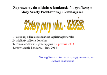 Zapraszamy do udziału w konkursie fotograficznym Klasy Szkoły Podstawowej i Gimnazjum: 1- wykonaj zdjęcie związane z ta piękną pora roku 2- wielkość zdjęcia dowolna 3- termin oddawania prac upływa 15 grudnia 2013 4. rozwiązanie konkursu – luty 2014 Szczegółowe informacje i przyjmowanie prac: Barbara Jankowska W związku z nadchodzącym ŚWIETEM NASZEJ PATRONKI TERESY CIEPŁY Zapraszamy do udziału w konkursie fotograficznym Klasy Szkoły Podstawowej i Gimnazjum: 1- wykonaj zdjęcie związane z ulubioną dyscypliną sportu naszej patronki 2- wielkość zdjęcia dowolna 3- termin oddawania prac upływa 8 października 4. rozwiązanie konkursu- 19 października Szczegółowe informacje i przyjmowanie prac: Barbara Jankowska Konkurs fotograficzny Dla uczniów Szkoły Podstawowej i Gimnazjum „ Przyroda nocą” Organizowany przez : Kujawsko- Pomorskie Centrum Edukacji Ekologicznej Konkurs „Przyroda nocą” adresowany jest do uczniów szkół podstawowych, gimnazjów i szkół ponadgimnazjalnych województwa kujawsko - pomorskiego, którego celem jest ukazanie piękna otaczającej nas przyrody w scenerii nocnej. Warunki uczestnictwa: Przedmiotem konkursu są fotografie barwne lub czarno – białe, o wymiarach min. 15x21 cm, fotogramy nie mogą być podklejane, oprawione lub umieszczone w albumach. Każdy uczestnik ma prawo zgłosić 2 prace. W kopercie załączonej do pracy, należy umieścić swoje dane: imię i nazwisko, wiek, nazwę szkoły, adres oraz nr telefonu. Prace nie będą zwracane – stają się własnością organizatora, mogą być wystawiane i publikowane. Uczestnik konkursu wypełnia oświadczenie, że przysłana praca jest wynikiem własnej twórczości i nie narusza praw autorskich oraz jakichkolwiek innych praw osób trzecich. Prace na konkurs zbiera pani Barbara Jankowska do 20 października 2013 Konkurs fotograficzny i nie tylko...– Dla uczniów Szkoły Podstawowej i Gimnazjum „Moje spotkania z przyrodą” Organizowany przez Kujawsko- Pomorskie Centrum Edukacji Ekologicznej Konkurs adresowany jest do dzieci i młodzieży z przedszkoli, szkół podstawowych, gimnazjów i szkół ponadgimnazjalnych oraz placówek kulturalno-wychowawczych Polski. Tematem kolejnej edycji konkursu jest otaczająca nas przyroda. Każdego dnia mamy z nią do czynienia – słyszymy śpiew ptaków, podziwiamy kwitnące rośliny i kolorowe owady. Niezależnie od pory roku i pogody żyjemy wśród przyrody! Uczestniku konkursu przekaż nam swoje wrażenia, emocje, spostrzeżenia z takich spotkań! REGULAMIN KONKURSU: - każdy uczestnik ma prawo zgłosić jedną pracę. Praca musi być opisana na odwrocie: imię i nazwisko, nazwa placówki, opiekun, adres oraz telefon! - prace zbiorowe nie będą przyjmowane !!! - prace można przygotować w 5 kategoriach: fotografia (barwna lub czarno-biała o wymiarach min. 15x21 cm bez nadruków na zdjęciu), malarstwo (dłuższy bok – max. 1 m, preferowany format A3) poezja - 1utwór praca plastyczna w technice dowolnej (dłuższy bok – max. 1 m, preferowany format A3) forma przestrzenna (instalacja lub rzeźba max wysokość 0,5 m; max powierzchnia 1 m2) - nadesłane prace zostaną ocenione przez jury, które składać się będzie ze znanych bydgoskich artystów plastyków, fotografików i filologów. - Jury zastrzega sobie prawo dowolnego podziału nagród, w tym nie przyznanie nagród głównych-statuetek. Przewiduje się nagrody specjalne przyznawane przez K-PCEE. Prace na konkurs zbiera pani Barbara Jankowska do 10 października 2013 Zbiórka baterii Zaangażuj się w zbiórkę baterii !!! To Cię nic nie kosztuje!!!!!! Wykonaj pojemnik , do którego domownicy będą wrzucać zużyte baterie. Może być to pojemnik po lodach , karton po butach . Ustaw go w umówionym miejscu w domu i stań się domowym koordynatorem akcji. Baterie dostarczaj do nauczycieli biologii i przyrody. Akcja trwa cały rok!!! Uczniowie najaktywniejsi otrzymają nagrody. Pamiętaj możesz tą akcję rozpropagować wśród dalszej rodziny , sąsiadów, znajomych!!!!. Nie musisz dać z siebie wiele jednak dla naszej Ziemi to bardzo dużo… Zbiórka płyt CD lub DVD Od września rozpoczynamy zbiórkę zużytych płyt CD lub DVD. Uczniowie oddają płyty do nauczycieli biologii i przyrody . Zaangażuj w akcję całą rodzinę w trosce o nasze środowisko!!!