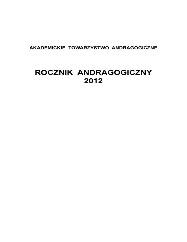 AKADEMICKIE TOWARZYSTWO ANDRAGOGICZNE ROCZNIK ANDRAGOGICZNY 2012 AKADEMICKIE TOWARZYSTWO ANDRAGOGICZNE ROCZNIK ANDRAGOGICZNY 2012 SZKOŁA WYŻSZA im. PAWŁA WŁODKOWICA W PŁOCKU WYDZIAŁ NAUK PEDAGOGICZNYCH UNIWERSYTETU MIKOŁAJA KOPERNIKA WYDZIAŁ PEDAGOGICZNY UNIWERSYTETU WARSZAWSKIEGO AKADEMICKIE TOWARZYSTWO ANDRAGOGICZNE ROCZNIK ANDRAGOGICZNY 2012 Rada Naukowa prof. dr hab. Tadeusz ALEKSANDER prof. dr hab. Olga CZERNIAWSKA prof. dr hab. Wiltrud GIESEKE dr Norbert F. GREGER prof. dr hab. Eleonora SAPIA-DREWNIAK (przewodnicząca) dr hab. Jerzy SEMKÓW dr hab. Ewa SKIBIŃSKA dr hab. Agnieszka STOPIŃSKA-PAJĄK Rada Redakcyjna Prof. dr hab. Józef PÓŁTURZYCKI – redaktor naczelny Dr hab. Hanna SOLARCZYK – zastępca redaktora naczelnego i redaktor tematyczny Dr hab. Danuta KOWALEWSKA – redaktor językowy Mgr Agnieszka PERDUTA – redaktor statystyczny Dr Anna FRĄCKOWIAK – zastępca redaktora naczelnego, sekretarz Rady Redakcyjnej Dr Alina MATLAKIEWICZ – sekretarz Dr Krzysztof PIERŚCIENIAK – sekretarz Dr Artur FABIŚ – redaktor Dr Elżbieta WOŹNICKA – redaktor Tłumaczenie spisu treści i konsultacje językowe (język angielski) – Anna Frąckowiak Tłumaczenie spisu treści i konsultacje językowe (język niemiecki) – Hanna Solarczyk © Copyright by Akademickie Towarzystwo Andragogiczne, Uniwersytet Warszawski Warszawa – Toruń 2012 ISBN 978-83-7789-185-8 Lista recenzentów oraz pełne teksty wszystkich artykułów znajdują się na: www.ata.edu.pl Rocznik Andragogiczny jest rejestrowany w systemie The Central European Journal of Social Sciences and Humanities: www.cejsh.icm.edu.pl Wersja drukowana Rocznika jest pierwotna. Współpraca wydawnicza: Instytut Technologii Eksploatacji – Państwowy Instytut Badawczy, Radom 2374 Wydawnictwo Naukowe Instytutu Technologii Eksploatacji – Państwowego Instytutu Badawczego ul. K. Pułaskiego 6/10, 26-600 Radom, tel. (48) 364-42-41, fax (48) 3644765 e-mail: [email protected] http://www.itee.radom.pl Rada Naukowa i Zespół Redakcji „Rocznika Andragogicznego” serdecznie witają II Zjazd Andragogiczny i życzą owocnych obrad SPIS TREŚCI Rocznik Andragogiczny 2012 Wprowadzenie ........................................................................................ I. W oczekiwaniu na II Zjazd Andragogiczny Józef Półturzycki: Edukacja dorosłych jako działalność społeczno-oświatowa............................................................................................... Agnieszka Stopińska-Pająk: Powrót do źródła – o pierwszym polskim podręczniku andragogiki . ....................................................................... Ewa Skibińska: Akademickie Towarzystwo Andragogiczne – 20 lat działalności................................................................................. II. 2012 – Międzynarodowy Rok Edukacji Międzypokoleniowej Ludmiła Zając-Lamparska: Psychologiczne koncepcje pomyślnego starzenia się człowieka . .......................................................................... Alicja Kozubska, Przemysław Ziółkowski: Potrzeba sensu życia czynnikiem spajającym pokolenia........................................................... Piotr Błajet: Aktywność prozdrowotna seniorów w świetle modelu Aktywnej Strategii Umacniania Zdrowia ............................................... Beata Stachowiak: Seniorzy w społeczeństwie informacyjnym. Konteksty andragogiczne i geragogiczne................................................ 19 23 63 79 89 106 116 128 III. Analizy i badania edukacji dorosłych 1. Teoretyczne podstawy Anna Frąckowiak: Zmiana jako kategoria edukacji dorosłych............... 141 Renata Góralska: „Praktyczny charakter” kompetencji emocjonalnej dorosłych.................................................................................................. 154 Monika Staszewicz, Katarzyna Jurzysta: Innowacyjność jako postulat całożyciowego uczenia się . .................................................................... 170 Violetta Kopińska: Edukacja prawna z perspektywy humanistyczno-krytycznej............................................................................................... 188 Michał Szykut: Elementy szacowania ryzyka w pracy kuratorów dla dorosłych w Polsce – pedagogiczne kontrowersje............................. 197 2. Z historii oświaty dorosłych Iwona Alechnowicz-Skrzypek: Filozoficzne podstawy kształcenia w przedwojennym Wrocławskim Uniwersytecie Powszechnym (Volkshochschule zu Breslau).................................................................. Eleonora Sapia-Drewniak: Problemy szkolnictwa przywięziennego na łamach „Oświaty Dorosłych” (1957–1990)........................................ Artur Łacina-Łanowski: Idea oświaty dorosłych według Franciszka Urbańczyka. Zarys problemu................................................................... 207 218 232 Tomasz Maliszewski: Narcyz Kozłowski (1913–2000) – pomorski społecznik i oświatowiec......................................................................... 245 Agata Szwech: Obszary uczenia się przez całe życie w dziennikach Haliny Semenowicz................................................................................. 264 3. Edukacja dorosłych za granicą Ewa Kula, Marzena Pękowska: Rola szkolnictwa wyższego w rozwoju kształcenia ustawicznego w Europie i w Polsce. Próba porównania.................................................................................... 272 Natalia J. Olechnowicz: Rozwój podejścia etycznego i kompetencyjnego w kształceniu urzędników na przykładzie Rosyjskiej Akademii Gospodarki Narodowej i Służby Państwowej ...... 286 Piotr Konieczny: Narodowy Uniwersytet Kształcenia na Odległość (UNED) w Hiszpanii – 40 lat w służbie edukacji ustawicznej................ 292 Beata Pietkiewicz-Pareek: Education for Promoting Gender Equality and Empowering Women in India......................