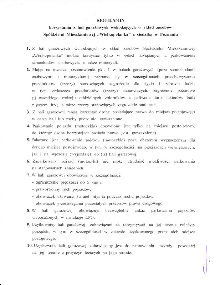 REGULAMIN korzystania z ha| garażowych wchodzących w skład zasobów Spółdzielni Mieszkaniowej ,,Wielkopolanka'' 1. Z hal z siedzibą w Poznaniu w skład zasobów Społdzielni Mieszkaniowej moŻna korzystać tylko w celach zwt4zanych z parkowaniem garażowych wchodz4cych ,,Wielkopo1anka'' samochodorv osobowych, a takŻe motocykli. f. Maj4c na uwadze postanowienia pkt. 1 osobowymi i motocyklami) zabrania w halach garażowych (poza samochodami się w przedmiotów (tzeczy) stanowiących zagroŻenie w tym zwłaszcza przedmiotów (tzeczy) gazem, itp.), a dla zycia i zdrowia |udzi, stanowi4cych: zagroŻenle pozarowe (tj. wszelkiego rodzaju oddzielnych zbiorników Z szczególnoŚci: przechowywania z paliwem, farb, lakierów, butli takŻę rzeczy stanowi4cych zagroŻenie sanitarne. 3. Z ha|i garażowej mogą korzystać osoby posiadaj4ce prawo do miejsca postojowego w danej hali lub osoby prZęZ nie upowaznione. 4. Parkowanie pojazdu (motocykla) dozwolone jest tylko na miejscu postojowym, do którego osoba korzystaj4ca posiada plawo (jest upowazniona). 5. Zakazane jest parkowanie pojazdu (motocykla) poza obszarem danego miejsca postojowego. jak i na .vq .uznaczonym dla w tym w szczegolności: na przejazdach wewnętrznych' wyeż'dzle (vqljeż'dzie) do ( 6. Zaparkowany pojazd (motocykl) z) ha|l garaŻowej. nie moŻe utrudniać moŹliwości parkowania na stanowiskach s4siednich. 7. W hali garażowej obowi4zuje w - szczegolności: ogranlczenie prędkości do 5 km/h, - prawostronny ruch pojazdów, - obowi4zek uzywania światełmijania podczas ruchu pojazdów, - obowi4zek przestrzegania pozostatych przepisów prawa drogowego. 8. W hali garazowej obowi4zuje bezwzględny zakaz parkowania pojazdow wyposazonych w instalację LPG' 9. Uży.tkownicy hali garuŻowej zobowi4zani SQ utrzymywaÓ na jej terenie na\eŻyty porządek, w tym w szczególności w zakresie użytkowanego przęZ nich miejsca postojowego. 10. Uży.tkownik hali garazowej zobowiązany jest do naprawienia szkody powstałej na jej terenie Z przyczyn |ezqcych po jego stronie' ,l U Uż1.tkownik 11. hali garaŻowe1 ma obowiązek udostępnienia zajmowanego miejsca postojowego w szczególnoŚci: w celu Społdzielni usunięcia awarii, przeprowadzenia remontów lub innych czynnoŚci technicznych w ha|l garaiowej, |2. Pojazdy (motocykle) zaparkowane z w hali garaŻowej w sposób nieuprawniony będ4 nlej odholowywane na koszt wtaściciela pojazdu lub na ich kołach będq za|<ładane blokady. 13. Użytkownicy hali garaiowej zobowlązani S4 do bezwzględnego przestrzeganta przepisów przeciwpoŻarowych' W przypadku ich naruszenia uzytkownik ha|t garaŻowej ponosi pełn4 odpowiedzialnoŚć za powstałe szkody. ftv,J F (,"-v s't Av