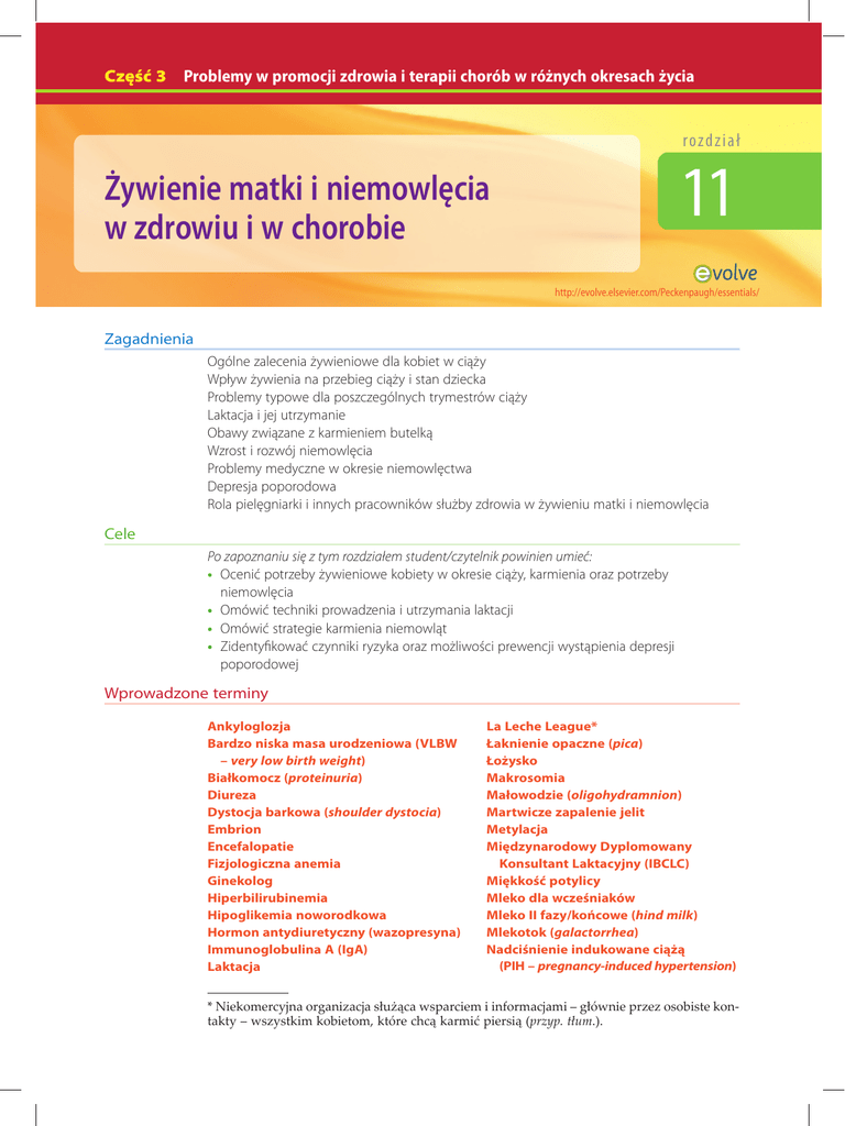 Część 3 Problemy w promocji zdrowia i terapii chorób w różnych okresach życia rozd z i ał 11 Żywienie matki i niemowlęcia w zdrowiu i w chorobie http://evolve.elsevier.com/Peckenpaugh/essentials/ Zagadnienia Ogólne zalecenia żywieniowe dla kobiet w ciąży Wpływ żywienia na przebieg ciąży i stan dziecka Problemy typowe dla poszczególnych trymestrów ciąży Laktacja i jej utrzymanie Obawy związane z karmieniem butelką Wzrost i rozwój niemowlęcia Problemy medyczne w okresie niemowlęctwa Depresja poporodowa Rola pielęgniarki i innych pracowników służby zdrowia w żywieniu matki i niemowlęcia Cele Po zapoznaniu się z tym rozdziałem student/czytelnik powinien umieć: • Ocenić potrzeby żywieniowe kobiety w okresie ciąży, karmienia oraz potrzeby niemowlęcia • Omówić techniki prowadzenia i utrzymania laktacji • Omówić strategie karmienia niemowląt • Zidentyfikować czynniki ryzyka oraz możliwości prewencji wystąpienia depresji poporodowej Wprowadzone terminy Ankyloglozja Bardzo niska masa urodzeniowa (VLBW – very low birth weight) Białkomocz (proteinuria) Diureza Dystocja barkowa (shoulder dystocia) Embrion Encefalopatie Fizjologiczna anemia Ginekolog Hiperbilirubinemia Hipoglikemia noworodkowa Hormon antydiuretyczny (wazopresyna) Immunoglobulina A (IgA) Laktacja La Leche League* Łaknienie opaczne (pica) Łożysko Makrosomia Małowodzie (oligohydramnion) Martwicze zapalenie jelit Metylacja Międzynarodowy Dyplomowany Konsultant Laktacyjny (IBCLC) Miękkość potylicy Mleko dla wcześniaków Mleko II fazy/końcowe (hind milk) Mlekotok (galactorrhea) Nadciśnienie indukowane ciążą (PIH – pregnancy-induced hypertension) * Niekomercyjna organizacja służąca wsparciem i informacjami – głównie przez osobiste kontakty – wszystkim kobietom, które chcą karmić piersią (przyp. tłum.).