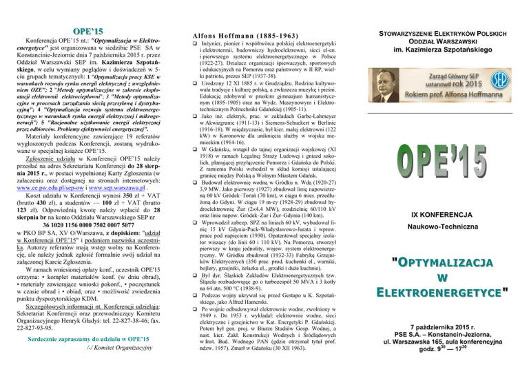 O OPPE E’’1155 Konferencja OPE’15 nt.: "Optymalizacja w Elektroenergetyce" jest organizowana w siedzibie PSE SA w Konstancinie-Jeziornie dnia 7 października 2015 r. przez Oddział Warszawski SEP im. Kazimierza Szpotańskiego, w celu wymiany poglądów i doświadczeń w 5ciu grupach tematycznych: 1 "Optymalizacja pracy KSE w warunkach rozwoju rynku energii elektrycznej z uwzględnieniem OZE"; 2 "Metody optymalizacyjne w zakresie eksploatacji elektrownii elektrociepłowni"; 3 "Metody optymalizacyjne w procesach zarządzania siecią przesyłową i dystrybucyjną"; 4 "Optymalizacja rozwoju systemu elektroenergetycznego w warunkach rynku energii elektrycznej i mikrogeneracji”; 5 "Racjonalne użytkowanie energii elektrycznej przez odbiorców. Problemy efektywności energetycznej". Materiały konferencyjne zawierające 19 referatów wygłoszonych podczas Konferencji, zostaną wydrukowane w specjalnej książce OPE’15. Zgłoszenie udziału w Konferencji OPE’15 należy przesłać na adres Sekretariatu Konferencji do 28 sierpnia 2015 r., w postaci wypełnionej Karty Zgłoszenia (w załaczeniu oraz dostępnej na stronach internetowych: www.ee.pw.edu.pl/sep-ow i www.sep.warszawa.pl . Koszt udziału w Konferencji wynosi 350 zł + VAT (brutto 430 zł), a studentów — 100 zł + VAT (brutto 123 zł). Odpowiednią kwotę należy wpłacić do 28 sierpnia br na konto Oddziału Warszawskiego SEP nr 36 1020 1156 0000 7502 0007 5077 w PKO BP SA, XV O/Warszawa, z dopiskiem: "udział w Konferencji OPE’15" i podaniem nazwiska uczestnika. Autorzy referatów mają wstęp wolny na Konferencję, ale należy jednak zgłosić formalnie swój udział na załączonej Karcie Zgłoszenia. W ramach wniesionej opłaty konf., uczestnik OPE'15 otrzyma: ▪ komplet materiałów konf. (w dniu obrad), ▪ materiały zawierające wnioski pokonf., ▪ poczęstunek w czasie obrad i ▪ obiad, oraz ▪ możliwość zwiedzenia punktu dyspozytorskiego KDM. Szczegółowych informacji nt. Konferencji udzielają: Sekretariat Konferencji oraz przewodniczący Komitetu Organizacyjnego Henryk Gładyś: tel. 22-827-38-46; fax. 22-827-93-95. Serdecznie zapraszamy do udziału w OPE’15 /-/ Komitet Organizacyjny A l f o n s H o f f ma n n ( 1 8 8 5 - 1 9 6 3 ) Inżynier, pionier i współtwórca polskiej elektroenergetyki i elektrotermii, budowniczy hydroelektrowni, sieci el-en. i pierwszego systemu elektroenergetycznego w Polsce (1922-27). Działacz organizacji śpiewaczych, sportowych i edukacyjnych na Pomorzu oraz państwowy w II RP, wielki patriota, prezes SEP (1937-38). Urodzony 12 XI 1885 r. w Grudziądzu. Rodzina kultywowała tradycje i kulturę polską, a zwłaszcza muzykę i pieśni. Edukację zdobywał w pruskim gimnazjum humanistycznym (1895-1905) oraz na Wydz. Maszynowym i Elektrotechnicznym Politechniki Gdańskiej (1905-11). Jako inż. elektryk, prac. w zakładach Garbe-Lahmeyer w Akwizgranie (1911-13) i Siemens-Schuckert w Berlinie (1916-18). W międzyczasie, był kier. małej elektrowni (122 kW) w Koronowie dla uniknięcia służby w wojsku niemieckim (1914-16). W Gdańsku, wstąpił do tajnej organizacji wojskowej (XI 1918) w ramach Legalnej Straży Ludowej i gniazd sokolich, planującej przyłączenie Pomorza i Gdańska do Polski. Z ramienia Polski wchodził w skład komisji ustalającej granicę między Polską a Wolnym Miastem Gdańsk. Budował elektrownię wodną w Gródku n. Wdą (1920-27) 3,9 MW. Jako pierwszy (1927) zbudował linię napowietrzną 60 kV Gródek–Toruń (70 km), w ciągu 6 mies. przedłużoną do Gdyni. W ciągu 19 m-cy (1928-29) zbudował hydroelektrownię Żur (2×4,4 MW), rozdzielnię 60/110 kV oraz linie napow. Gródek–Żur i Żur–Gdynia (140 km). Wprowadził zabezp. SPZ na liniach 60 kV, wybudował linię 15 kV Gdynia-Puck-Władysławowo-Jurata i wprow. prace pod napięciem (1930). Opatentował specjalny izolator wiszący (do linii 60 i 110 kV). Na Pomorzu, stworzył pierwszy w kraju jednolity, wojew. system elektroenergetyczny. W Gródku zbudował (1932-33) Fabrykę Grzejników Elektrycznych (350 prac. prod. kuchenki el., warniki, bojlery, grzejniki, żelazka el., grzałki i duże kuchnie). Był dyr. Śląskich Zakładów Elektroenergetycznych tzw. Ślązelu rozbudowując go o turbozespół 50 MVA i 3 kotły na 64 atn. 500 °C (1938-9). Podczas wojny ukrywał się przed Gestapo u K. Szpotańskiego, jako Alfred Hamerski. Po wojnie odbudowywał elektrownie wodne, zwolniony w 1949 r. Do 1953 r. wykładał: elektrownie wodne, sieci elektryczne i grzejnictwo w Kat. Energetyki P. Gdańskiej. Potem był gen. proj. w Biurze Studiów Gosp. Wodnej, a nast. kier. Zakł. Konstrukcji Wodnych i Śródlądowych w Inst. Bud. Wodnego PAN (gdzie otrzymał tytuł prof. ndzw. 1957). Zmarł w Gdańsku (30 XII 1963). STOWARZYSZENIE ELEKTRYKÓW POLSKICH ODDZIAŁ WARSZAWSKI im. Kazimierza Szpotańskiego IX KONFERENCJA Naukowo-Techniczna "O OPPTTYYM MA ALLIIZZA AC CJJA A W W E ELLEEKKTTRRO OEEN NEER RG GEETTY YC CEE " 7 października 2015 r. PSE S.A. – Konstancin-Jeziorna, ul. Warszawska 165, aula konferencyjna godz. 930 — 1730 P PR RO OG GR RA AM M "Optymalizacja w Elektroenergetyce" 7 X 2015 w siedzibie PSE S.A. Konstancin-Jeziorna, ul. Warszawska 165, aula konferencyjna godz. 9:30 – 17:30 9 3 0 -10 0 0 Otwarcie Konferencji, słowo wstępne Prezesa OW SEP, wybór Komisji Wnioskowej SESJA 1 OPTYMALIZACJA PROWADZENIA RUCHU I EKSPLOATACJI KSE (referaty grup tematycznych nr 1, 2 i 3) 10 0 0 -10 1 5 ,,Wykorzystanie możliwości ekonomicznego KOMITET HONOROWY Piotr Szymczak, dr inż. Prezes SEP Henryk Majchrzak, dr inż. Prezes Zarządu PSE S.A. Lech Grzesiak, prof. dr hab. inż. Dziekan Wydziału Elektrycznego PW KOMITET ORGANIZACYJNY Przewodniczący — Henryk Gładyś, dr inż. Członkowie: Miłosława Bożentowicz, mgr inż. Grzegorz Błajszczak, dr inż. Krzysztof Falkowski. mgr inż. Konrad Krupa, mgr inż. Andrzej Marusak, dr inż. Mariusz Radwański, mgr inż. SEKRETARIAT KONFERENCJI Biuro OW S