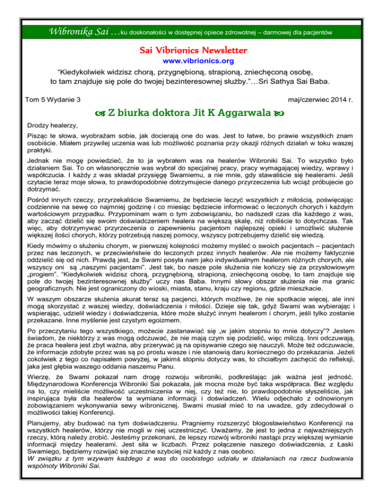 Wibronika Sai …ku doskonałości w dostępnej opiece zdrowotnej – darmowej dla pacjentów Sai Vibrionics Newsletter www.vibrionics.org “Kiedykolwiek widzisz chorą, przygnębioną, strapioną, zniechęconą osobę, to tam znajduje się pole do twojej bezinteresownej służby.”…Sri Sathya Sai Baba. Tom 5 Wydanie 3 maj/czerwiec 2014 r. Z biurka doktora Jit K Aggarwala Drodzy healerzy, Pisząc te słowa, wyobrażam sobie, jak docierają one do was. Jest to łatwe, bo prawie wszystkich znam osobiście. Miałem przywilej uczenia was lub możliwość poznania przy okazji różnych działań w toku waszej praktyki. Jednak nie mogę powiedzieć, że to ja wybrałem was na healerów Wibroniki Sai. To wszystko było działaniem Sai. To on własnoręcznie was wybrał do specjalnej pracy, pracy wymagającej wiedzy, wprawy i współczucia. I każdy z was składał przysięgę Swamiemu, a nie mnie, gdy stawaliście się healerami. Jeśli czytacie teraz moje słowa, to prawdopodobnie dotrzymujecie danego przyrzeczenia lub wciąż próbujecie go dotrzymać. Pośród innych rzeczy, przyrzekaliście Swamiemu, że będziecie leczyć wszystkich z miłością, poświęcając codziennie na sewę co najmniej godzinę i co miesiąc będziecie informować o leczonych chorych i każdym wartościowym przypadku. Przypominam wam o tym zobowiązaniu, bo nadszedł czas dla każdego z was, aby zacząć dzielić się swoim doświadczeniem healera na większą skalę, niż robiliście to dotychczas. Tak więc, aby dotrzymywać przyrzeczenia o zapewnieniu pacjentom najlepszej opieki i umożliwić służenie większej ilości chorych, którzy potrzebują naszej pomocy, wszyscy potrzebujemy dzielić się wiedzą. Kiedy mówimy o służeniu chorym, w pierwszej kolejności możemy myśleć o swoich pacjentach – pacjentach przez nas leczonych, w przeciwieństwie do leczonych przez innych healerów. Ale nie możemy faktycznie oddzielić się od nich. Prawdą jest, że Swami posyła nam jako indywidualnym healerom różnych chorych, ale wszyscy oni są „naszymi pacjentami”. Jest tak, bo nasze pole służenia nie kończy się za przysłowiowym „progiem”. “Kiedykolwiek widzisz chorą, przygnębioną, strapioną, zniechęconą osobę, to tam znajduje się pole do twojej bezinteresownej służby” uczy nas Baba. Innymi słowy obszar służenia nie ma granic geograficznych. Nie jest ograniczony do wioski, miasta, stanu, kraju czy regionu, gdzie mieszkacie. W waszym obszarze służenia akurat teraz są pacjenci, których możliwe, że nie spotkacie więcej, ale inni mogą skorzystać z waszej wiedzy, doświadczenia i miłości. Dzieje się tak, gdyż Swami was wybierając i wspierając, udzielił wiedzy i doświadczenia, które może służyć innym healerom i chorym, jeśli tylko zostanie przekazane. Inne myślenie jest czystym egoizmem. Po przeczytaniu tego wszystkiego, możecie zastanawiać się „w jakim stopniu to mnie dotyczy”? Jestem świadom, że niektórzy z was mogą odczuwać, że nie mają czym się podzielić, więc milczą. Inni odczuwają, że praca healera jest zbyt ważna, aby przerywać ją na opisywanie czego się nauczyli. Może też odczuwacie, że informacje zdobyte przez was są po prostu wasze i nie stanowią daru koniecznego do przekazania. Jeżeli cokolwiek z tego co napisałem powyżej, w jakimś stopniu dotyczy was, to chciałbym zachęcić do refleksji, jaka jest głębia waszego oddania naszemu Panu. Wierzę, że Swami pokazał nam drogę rozwoju wibroniki, podkreślając jak ważna jest jedność. Międzynarodowa Konferencja Wibroniki Sai pokazała, jak mocna może być taka współpraca. Bez względu na to, czy mieliście możliwość uczestniczenia w niej, czy też nie, to prawdopodobnie słyszeliście, jak inspirująca była dla healerów ta wymiana informacji i doświadczeń. Wielu odjechało z odnowionym zobowiązaniem wykonywania sewy wibronicznej. Swami musiał mieć to na uwadze, gdy zdecydował o możliwości takiej Konferencji. Planujemy, aby budować na tym doświadczeniu. Pragniemy rozszerzyć błogosławieństwo Konferencji na wszystkich healerów, którzy nie mogli w niej uczestniczyć. Uważamy, że jest to jedna z najważniejszych rzeczy, którą należy zrobić. Jesteśmy przekonani, że lepszy rozwój wibroniki nastąpi przy większej wymianie informacji między healerami. Jest siła w liczbach. Przez połączenie naszego doświadczenia, z Łaski Swamiego, będziemy rozwijać się znaczne szybciej niż każdy z nas osobno. W związku z tym wzywam każdego z was do osobistego udziału w działaniach na rzecz budowania wspólnoty Wibroniki Sai. Biuletyn W najbliższej przyszłości ten Biuletyn będzie służył lepszej wymianie informacji wśród healerów. Planujemy poszerzyć go o: historie chorób pokazujące zarówno zwykłe, codzienne, jak i wszelkie niezwykle doświadczenia healerów porady, którymi healerzy chcieliby podzielić się z innymi relacje o odkrywczych lub inspirujących doświadczeniach krótkie anegdoty o leczeniu relacje o lokalnej aktywności w sewie wibronicznej, projekty, badania “sylwetki healerów” - tutaj w pigułce zostaną przedstawione wraz ze zdjęciem sylwetki poszczególnych healerów. Healerzy krótko podzielą się informacjami dotyczącymi ich przeszłości, okresu i miejsca wykonywania sewy oraz dołączą krótkie, kilkuzdaniowe osobiste refleksje. Każdy może włączyć się w realizację tego dzieła. Zorganizowaliśmy zespół mający za zadanie zbieranie tych informacji. Ochotnicy ci będą służyć jako redaktorzy współpracujący z Biuletynem. Jeśli skontaktują się z Wami i poproszą o współpracę, prosimy o jak najrzetelniejszą odpowiedź. Jednak nie musicie czekać na zaproszenie. A nawet mam nadzieję, że nie będziecie. Możecie się włączyć poprzez bezpośrednie przesłanie informacji do mnie: [email protected]. Każdy wysiłek będzie uznany i wykorzystany. Badania w rolnictwie Dodatkowo chcemy 