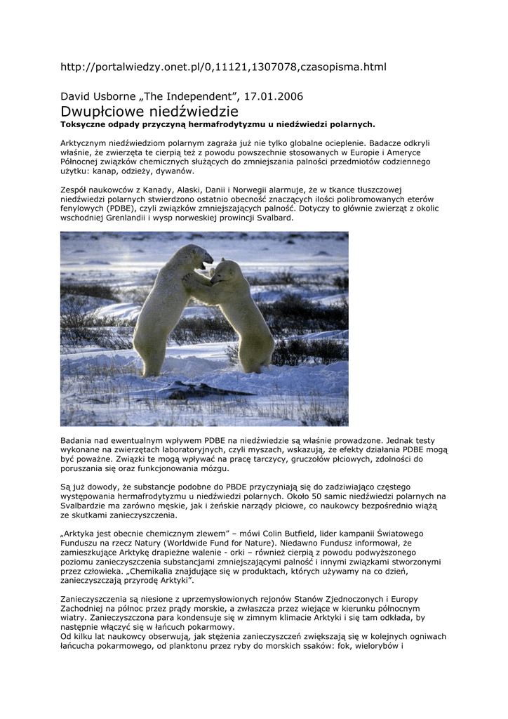 http://portalwiedzy.onet.pl/0,11121,1307078,czasopisma.html David Usborne „The Independent”, 17.01.2006 Dwupłciowe niedźwiedzie Toksyczne odpady przyczyną hermafrodytyzmu u niedźwiedzi polarnych. Arktycznym niedźwiedziom polarnym zagraża już nie tylko globalne ocieplenie. Badacze odkryli właśnie, że zwierzęta te cierpią też z powodu powszechnie stosowanych w Europie i Ameryce Północnej związków chemicznych służących do zmniejszania palności przedmiotów codziennego użytku: kanap, odzieży, dywanów. Zespół naukowców z Kanady, Alaski, Danii i Norwegii alarmuje, że w tkance tłuszczowej niedźwiedzi polarnych stwierdzono ostatnio obecność znaczących ilości polibromowanych eterów fenylowych (PDBE), czyli związków zmniejszających palność. Dotyczy to głównie zwierząt z okolic wschodniej Grenlandii i wysp norweskiej prowincji Svalbard. Badania nad ewentualnym wpływem PDBE na niedźwiedzie są właśnie prowadzone. Jednak testy wykonane na zwierzętach laboratoryjnych, czyli myszach, wskazują, że efekty działania PDBE mogą być poważne. Związki te mogą wpływać na pracę tarczycy, gruczołów płciowych, zdolności do poruszania się oraz funkcjonowania mózgu. Są już dowody, że substancje podobne do PBDE przyczyniają się do zadziwiająco częstego występowania hermafrodytyzmu u niedźwiedzi polarnych. Około 50 samic niedźwiedzi polarnych na Svalbardzie ma zarówno męskie, jak i żeńskie narządy płciowe, co naukowcy bezpośrednio wiążą ze skutkami zanieczyszczenia. „Arktyka jest obecnie chemicznym zlewem” – mówi Colin Butfield, lider kampanii Światowego Funduszu na rzecz Natury (Worldwide Fund for Nature). Niedawno Fundusz informował, że zamieszkujące Arktykę drapieżne walenie - orki – również cierpią z powodu podwyższonego poziomu zanieczyszczenia substancjami zmniejszającymi palność i innymi związkami stworzonymi przez człowieka. „Chemikalia znajdujące się w produktach, których używamy na co dzień, zanieczyszczają przyrodę Arktyki”. Zanieczyszczenia są niesione z uprzemysłowionych rejonów Stanów Zjednoczonych i Europy Zachodniej na północ przez prądy morskie, a zwłaszcza przez wiejące w kierunku północnym wiatry. Zanieczyszczona para kondensuje się w zimnym klimacie Arktyki i się tam odkłada, by następnie włączyć się w łańcuch pokarmowy. Od kilku lat naukowcy obserwują, jak stężenia zanieczyszczeń zwiększają się w kolejnych ogniwach łańcucha pokarmowego, od planktonu przez ryby do morskich ssaków: fok, wielorybów i niedźwiedzi polarnych. Nowe badania, opublikowane niedawno w „Environmental Science and Technology”, pokazują na przykład, że jeden ze związków miał 71 razy wyższe stężenie w organizmach niedźwiedzi polarnych niż w przypadku fok, którymi niedźwiedzie w normalnych warunkach się żywią. Działacze na rzecz ochrony środowiska są szczególnie zaniepokojeni tymi nowymi wynikami z powodu i tak już słabej kondycji arktycznych niedźwiedzi polarnych – niektóre z ich populacji mogą ulec wyniszczeniu przed końcem stulecia, w miarę jak podnosząca się temperatura ogranicza im tereny łowieckie. Na przykład w kanadyjskim rejonie Zatoki Hudsona liczba niedźwiedzi polarnych spadła z 1100 w roku 1995 do zaledwie 950 w 2004 roku. Niebezpieczeństwo, jakie obecnie stanowią PBDE, przypomina kryzys sprzed 30 lat związany z PCB – polichlorowanymi bifenylami, wysoce toksycznymi produktami ubocznymi wielu gałęzi przemysłu, które także migrowały do Arktyki. Wyrzucanie PCB zostało szybko zakazane. Od 2004 roku w USA zaprzestano wytwarzania dwóch najbardziej toksycznych środków zwanych penta i okta. Wciąż jednak istnieją ich zapasy. Według Dereka Muira z Departamentu Ochrony Środowiska Kanady, który kieruje nowymi badaniami, w Arktyce i organizmach niedźwiedzi polarnych pojawia się także nieco inna substancja zmniejszające palność, używana zwykle w materiałach budowlanych i wyposażeniu mieszkań „To związek, którego działanie należy obserwować, ponieważ jego stężenia wzrastają w wodnych sieciach pokarmowych i wydaje się on być szeroko rozpowszechnionym zanieczyszczeniem”. Zespół badawczy przetestował 139 niedźwiedzi schwytanych w 10 różnych miejscach Arktyki. Okazało się, że niedźwiedzie z norweskiego Svalbardu, obszaru chronionego, gdzie wszelkie polowania są zabronione, miały poziom chemikaliów wyższy 10 razy niż niedźwiedzie z Alaski i cztery razy wyższy niż te z Kanady.
