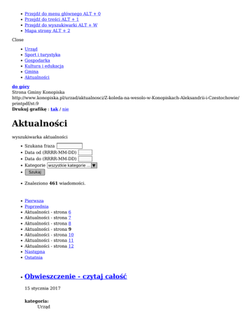 Przejdź do menu głównego ALT + 0 Przejdź do treści ALT + 1 Przejdź do wyszukiwarki ALT + W Mapa strony ALT + 2 Close Urząd Sport i turystyka Gospodarka Kultura i edukacja Gmina Aktualności do góry Strona Gminy Konopiska http://www.konopiska.pl/urzad/aktualnosci/Z-koleda-na-wesolo-w-Konopiskach-Aleksandrii-i-Czestochowie/ printpdf/st:9 Drukuj grafikę : tak / nie Aktualności wyszukiwarka aktualności Szukana fraza Data od (RRRR-MM-DD) Data do (RRRR-MM-DD) Kategorie wszystkie kategorie ... ▼ Szukaj Znaleziono 461 wiadomości. Pierwsza Poprzednia Aktualności - strona 6 Aktualności - strona 7 Aktualności - strona 8 Aktualności - strona 9 Aktualności - strona 10 Aktualności - strona 11 Aktualności - strona 12 Następna Ostatnia Obwieszczenie - czytaj całość 15 stycznia 2017 kategoria: Urząd OBWIESZCZENIE WÓJTA GMINY KONOPISKA Obwieszczenie Obwieszczenie - czytaj całość Komunikat Gminnego Ośrodka Pomocy Społecznej w Konopiskach - czytaj całość 15 stycznia 2017 kategoria: Pomoc społeczna Gminny Ośrodek Pomocy Społecznej w Konopiskach informuje, że od miesiąca stycznia 2017r. można składać wnioski o uzyskanie jednorazowego świadczenia w kwocie 4000 zł z tytułu urodzenia się żywego dziecka z ciężkim i nieodwracalnym upośledzeniem albo nieuleczalną chorobą zagrażającą życiu. Komunikat Gminnego Ośrodka Pomocy Społecznej w K Komunikat Gminnego Ośrodka Pomocy Społecznej w Konopiskach - czytaj całość SPOTKANIE AUTORSKIE - czytaj całość 14 stycznia 2017 kategoria: Kultura i Edukacja Jak można realizować swoje pasje, zamiłowania i marzenia opowiedziała autorka powieści Powiedz Ameryce. Roma Szwyngel to mieszkanka Hutek, nauczyciel historii w Rększowicach, Łaźcu i Gimnazjum w Konopiskach, obecnie na emeryturze. Spotkanie odbyło się 4 stycznia 2017 roku w Zespole Szkół im. Henryka Sienkiewicza w Konopiskach. SPOTKANIE AUTORSKIE SPOTKANIE AUTORSKIE - czytaj całość ZIMOWE UTRZYMANIE DRÓG W SEZONIE 2016/2017 NA TERENIE GMINY KONOPISKA - czytaj całość 14 stycznia 2017 kategoria: Urząd Gmina Konopiska zawarła umowę powierzając wykonanie prac zimowego utrzymania dróg gminnych Wykonawcy - Przedsiębiorstwo Handlowo – Usługowe Larix Sp. z o. o. z siedzibą w 42-700 Lubliniec, ul. Klonowa 11, w zakresie utrzymania dróg gminnych na terenie gminy Konopiska ZIMOWE UTRZYMANIE DRÓG W SEZONIE 2016/2017 NA TER ZIMOWE UTRZYMANIE DRÓG W SEZONIE 2016/2017 NA TERENIE GMINY KONOPISKA - czytaj całość Nieodpłatna pomoc prawna w 2017 roku - czytaj całość 14 stycznia 2017 kategoria: Urząd Informuję, że od 1 stycznia 2017 r. nieodpłatna pomoc prawna dla osób najuboższych, młodych ( do 26 lat), seniorów, kombatantów i weteranów, posiadaczy Karty Dużej Rodziny oraz ofiar klęsk żywiołowych będzie udzielana dwa dni w tygodniu a nie trzy jak w bieżącym roku. Porady prawne będą udzielane w Konopiskach w budynku przy ulicy Lipowej 3 (świetlica po byłej aptece). Nieodpłatna pomoc prawna w 2017 roku Nieodpłatna pomoc prawna w 2017 roku - czytaj całość Obwieszczenie - czytaj całość 12 stycznia 2017 kategoria: Urząd OBWIESZCZENIE WÓJTA GMINY KONOPISK Obwieszczenie Obwieszczenie - czytaj całość V Szachowe Mistrzostwa Gminy Konopiska 2016 – Finał czytaj całość 12 stycznia 2017 kategoria: Sport i Turystyka 8 stycznia 2017r. nastąpiło rozstrzygnięcie i rozdanie nagród w V Szachowych Mistrzostwach Gminy Konopiska. W 2016 roku w Gminnym Centrum Kultury i Rekreacji zawodnicy rozegrali jedenaście turniejów szachowych, których głównym celem było wyłonienie mistrza gminy w kategoriach wiekowych: senior, junior i junior młodszy. Rywalizacja była równie zacięta jak w poprzednich latach. V Szachowe Mistrzostwa Gminy Konopiska 2016 – Fi V Szachowe Mistrzostwa Gminy Konopiska 2016 – Finał - czytaj całość SPOTKANIE ŚWIĄTECZNO-NOWOROCZNE W HUTKACH czytaj całość 11 stycznia 2017 kategoria: Kultura i Edukacja 30 grudnia 2016r. o godz.16.00 w ZSP w Hutkach odbyło się spotkanie świąteczno-noworoczne. Na Sali gimnastycznej przyciemnione światła, cichną rozmowy, słychać kolędy. W tak uroczystym nastroju rozpoczęło się spotkanie zorganizowane przez Koło Gospodyń Wiejskich w Hutkach i radę Sołecką Sołectwa Hutki. SPOTKANIE ŚWIĄTECZNO-NOWOROCZNE W HUTKACH SPOTKANIE ŚWIĄTECZNO-NOWOROCZNE W HUTKACH - czytaj całość Międzykulturowe Spotkanie Świąteczne - czytaj całość 10 stycznia 2017 kategoria: Kultura i Edukacja W grudniu 2016 roku w sali OSP Wąsosz- Łaziec odbyło się ,,Międzykulturowe Spotkanie Świąteczne", które było jednym z działań projektu ,,Gotujemy po angielsku" realizowanego w ramach Programu Polsko - Amerykańskiej Fundacji Wolności ENGLISH TEACHING, którego krajowym operatorem jest Nidzicka Fundacja Rozwoju NIDA. Międzykulturowe Spotkanie Świąteczne Międzykulturowe Spotkanie Świąteczne - czytaj całość Komunikat - czytaj całość 09 stycznia 2017 kategoria: Pomoc społeczna Gminny Ośrodek Pomocy Społecznej w Konopiskach informuje, że od miesiąca stycznia 2017r. można składać wnioski o uzyskanie jednorazowego świadczenia w kwocie 4000 zł z tytułu urodzenia się żywego dziecka z ciężkim i nieodwracalnym upośledzeniem albo nieuleczalną chorobą zagrażającą życiu. Komunikat Komunikat - czytaj całość Pierwsza Poprzednia Aktualności - strona 6 Aktualności - strona 7 Aktualności - strona 8 Aktualności - strona 9 Aktualności - strona 10 Aktualności - strona 11 Aktualności - strona 12 Następna Ostatnia