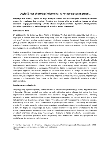 Otyłość jest chorobą śmiertelną. A Polacy są coraz grubsi… Statystyki nie kłamią. Otyłość to plaga naszych czasów. Już blisko 60 proc. dorosłych Polaków zmaga się z nadwagą lub otyłością. Problem ten dotyka także co trzeciego chłopca w wieku szkolnym i co piątą dziewczynkę – wynika z badań Instytutu Żywności i Żywienia1. Winnych temu jest wiele czynników. Czy nad nadwagą lub otyłością można zapanować? Zatrważające dane 24 października to Światowy Dzień Walki z Otyłością. Według ostatnich szacunków już 64 proc. mężczyzn w naszym kraju ma nadmierną masę ciała. W przypadku kobiet odsetek ten sięga już 49 proc.2 Niestety, według opublikowanych niedawno prognoz Światowej Organizacji Zdrowia (WHO) epidemia otyłości będzie w najbliższych dekadach wzrastać w całej Europie, w tym także w Polsce (co dotyczy zwłaszcza mężczyzn). Według jej badań, rocznie z powodu chorób związanych z nadwagą umiera ponad 2,5 miliona osób. Otyłość jest wynikiem długotrwałego zaburzenia równowagi między ilością dostarczanej energii a jej wydatkowaniem. Lekarze oraz specjaliści żywieniowi ostrzegają przed lekceważeniem nadwagi, zwłaszcza u dzieci i młodzieży. Podkreślają, że otyłość to nie tylko defekt estetyczny, lecz groźna choroba i główna przyczyna wielu innych chorób, takich jak: cukrzyca typu 2, choroby układu krążenia, nowotwory złośliwe czy kamica żółciowa. – Nadwaga u dzieci wynika często z nawyków żywieniowych wyniesionych z domu. Jeżeli rodzice nie przestrzegają zasad zdrowego żywienia, również dzieci nie zadbają o tę sferę życia. Otyłe dziecko będzie w przyszłości nieszczęśliwym i chorym dorosłym – wyjaśnia Konrad Gaca, ekspert do spraw leczenia otyłości. – Dlatego tak ważna staje się właściwa edukacja żywieniowa, pogłębianie wiedzy o zdrowym stylu życia, odpowiednim łączeniu składników, czyli mądrym odżywianiu. Ważną rolę odgrywa również aktywność fizyczna, regeneracja i motywacja – kontynuuje Gaca, który od lat dużą część swojej działalności poświęca edukacji społeczeństwa. Zasady zdrowego żywienia Decydujące są regularne posiłki, a także dbałość o odpowiednią kompozycję białek, węglowodanów i tłuszczów. Pierwszy posiłek ma wpływ na cały późniejszy dzień, dlatego tak ważne jest jego odpowiednie zbilansowanie. Śniadanie musi zawierać porcję białka, węglowodanów, najlepiej złożonych, o niskim indeksie glikemicznym. Najlepszym pomysłem na ostatni posiłek jest z kolei kolacja białkowa. Sięgnijmy po chude mięso, ryby, jajka, ser biały lub specjalne proteinowe koktajle. Powinniśmy unikać soli i cukru. Dzięki temu przyspieszymy metabolizm i odsuniemy widmo wielu chorób. Pijmy dużo wody. Jej systematyczne spożycie pozwala przyśpieszyć przemianę materii nawet o 30%. Nie bójmy się wszystkiego, co tłuste. Tłuszcze nienasycone są bardzo wartościowe. To one wzmacniają odporność, wpływają na utrzymanie prawidłowego poziomu cholesterolu. Znajdziemy je w rybach morskich, oliwie, oleju rzepakowym i lnianym, a także orzechach. I najważniejsze – regularnie spożywanie posiłków, które przyspieszy nasz metabolizm. Zaleca się spożywanie 4-5 posiłków, co 3-4 godziny, o stałych porach. 1 Instytut Żywności i Żywienia, http://www.izz.waw.pl/pl/strona-gowna/3-aktualnoci/aktualnoci/589naukowcy-opracowali-skuteczna-metode-walki-z-otyloscia. 2 Tamże. Pierwszym krokiem jest motywacja i chęć zmiany Silna motywacja jest niezbędna do tego, by rozpocząć proces redukcji wagi. Nie ukrywajmy – to zadanie, w którym pierwszy krok trzeba postawić w głowie. I ten pierwszy krok zazwyczaj okazuje się najtrudniejszy. – W zależności od indywidualnych uwarunkowań: relacji wagi startowej pacjenta do jego celu końcowego, stanu zdrowia, płci, wieku, przebytych wcześniej chorób, terapia odchudzająca może trwać od kilku do kilkunastu miesięcy. Wówczas podtrzymanie silnej motywacji do pracy nad osiągnięciem celu jest kluczową kwestią – mówi Konrad Gaca, który od ponad 10 lat pomaga ludziom zmagającym się z otyłością. Jest wiele sposobów na podtrzymanie motywacji: książki, filmy motywacyjne, wizualizacja celu czy udział w grupach wsparcia na portalach społecznościowych. Pierwszym etapem w budowaniu silnej woli w procesie redukcji wagi jest więc odnalezienie wewnętrznej potrzeby zmiany. To jak narodzenie się na nowo. Uczymy się nawyków, zasad żywienia oraz metod treningu. Przede wszystkim jednak zupełnie nowego podejścia do życia. Młodzi najbardziej zagrożeni Najbardziej zagrożeni są młodzi, którzy nie wynieśli z domu zasad zdrowego odżywiania, nie lubią aktywności, mają słabość do słodyczy i produktów typu fast food. Świadomość o istotnej roli zdrowego odżywiania zdobywają dopiero, gdy pojawia się u nich nadwaga lub rówieśnicy wytkną im nadmiar kilogramów. Konrad Gaca w swojej działalności edukacyjnej wiele komunikatów kieruje do dzieci i młodzieży, a także ich rodziców. – To ważne, by uświadomić rodzicom, że ich dziecko z niebywałą dokładnością skopiuje ich nawyki żywieniowe i stosunek do aktywności. To będzie zawsze jego pierwszy odruch – tłumaczy Gaca. Specjalista żywieniowy prowadzi swój kanał na YouTube, na którym umieszcza filmy motywacyjne dla tych, którzy mają trudności z odchudzaniem. Jeden z filmów – „Motywacja. Serce wojownika” opowiada historię chłopca, który wygrał z otyłością. Warto go zobaczyć – 24 października, w Światowy Dzień Walki z Otyłością, będzie miał swoją premierę na profilu na Facebooku Konrada Gacy: www.fb.com/konradgaca. – Otyłość to choroba wyniszczająca ciało i prowadząca do problemów psychospołecznych, w tym do apatii, depresji, izolowania się od społeczeństwa. Leczenie otyłości wymaga opieki specjalistycznej i przede wszystkim ogromnej