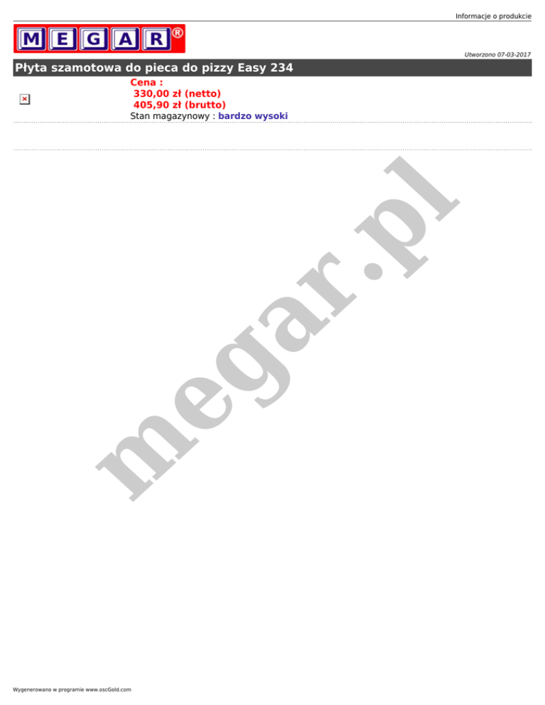 Informacje o produkcie Utworzono 07-03-2017 Płyta szamotowa do pieca do pizzy Easy 234 Cena : 330,00 zł (netto) 405,90 zł (brutto) m eg ar .p l Stan magazynowy : bardzo wysoki Wygenerowano w programie www.oscGold.com