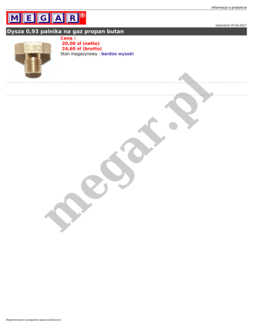 Informacje o produkcie Utworzono 07-03-2017 Dysza 0,93 palnika na gaz propan butan Cena : 20,00 zł (netto) 24,60 zł (brutto) m eg ar .p l Stan magazynowy : bardzo wysoki Wygenerowano w programie www.oscGold.com