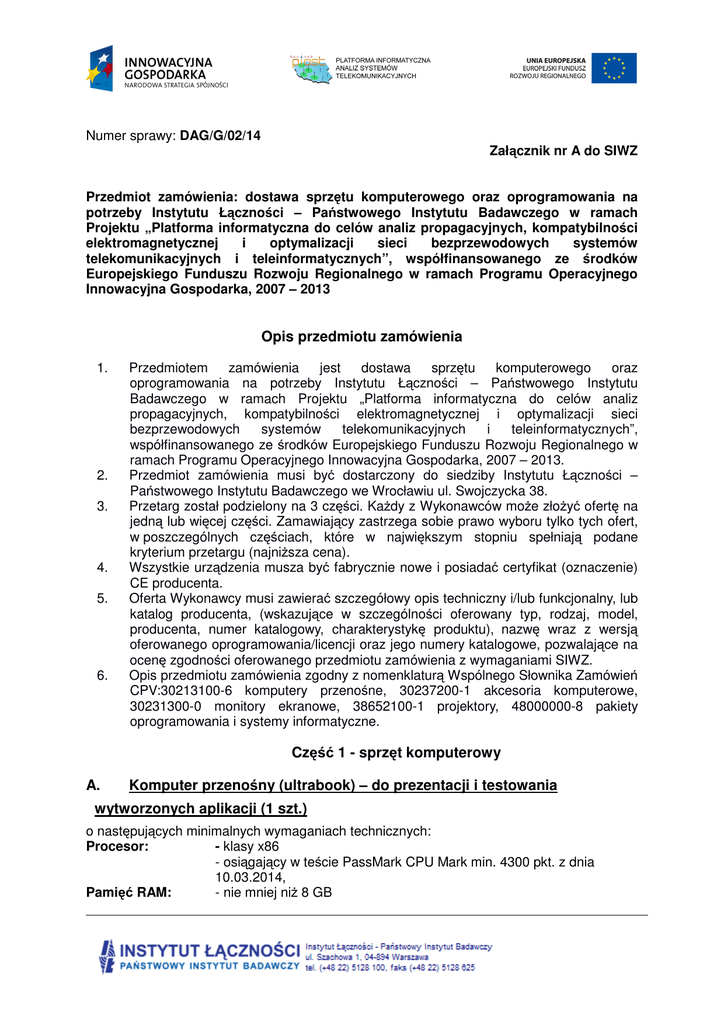 Numer sprawy: DAG/G/02/14 Załącznik nr A do SIWZ Przedmiot zamówienia: dostawa sprzętu komputerowego oraz oprogramowania na potrzeby Instytutu Łączności – Państwowego Instytutu Badawczego w ramach Projektu „Platforma informatyczna do celów analiz propagacyjnych, kompatybilności elektromagnetycznej i optymalizacji sieci bezprzewodowych systemów telekomunikacyjnych i teleinformatycznych”, współfinansowanego ze środków Europejskiego Funduszu Rozwoju Regionalnego w ramach Programu Operacyjnego Innowacyjna Gospodarka, 2007 – 2013 Opis przedmiotu zamówienia 1. 2. 3. 4. 5. 6. Przedmiotem zamówienia jest dostawa sprzętu komputerowego oraz oprogramowania na potrzeby Instytutu Łączności – Państwowego Instytutu Badawczego w ramach Projektu „Platforma informatyczna do celów analiz propagacyjnych, kompatybilności elektromagnetycznej i optymalizacji sieci bezprzewodowych systemów telekomunikacyjnych i teleinformatycznych”, współfinansowanego ze środków Europejskiego Funduszu Rozwoju Regionalnego w ramach Programu Operacyjnego Innowacyjna Gospodarka, 2007 – 2013. Przedmiot zamówienia musi być dostarczony do siedziby Instytutu Łączności – Państwowego Instytutu Badawczego we Wrocławiu ul. Swojczycka 38. Przetarg został podzielony na 3 części. Każdy z Wykonawców może złożyć ofertę na jedną lub więcej części. Zamawiający zastrzega sobie prawo wyboru tylko tych ofert, w poszczególnych częściach, które w największym stopniu spełniają podane kryterium przetargu (najniższa cena). Wszystkie urządzenia musza być fabrycznie nowe i posiadać certyfikat (oznaczenie) CE producenta. Oferta Wykonawcy musi zawierać szczegółowy opis techniczny i/lub funkcjonalny, lub katalog producenta, (wskazujące w szczególności oferowany typ, rodzaj, model, producenta, numer katalogowy, charakterystykę produktu), nazwę wraz z wersją oferowanego oprogramowania/licencji oraz jego numery katalogowe, pozwalające na ocenę zgodności oferowanego przedmiotu zamówienia z wymaganiami SIWZ. Opis przedmiotu zamówienia zgodny z nomenklaturą Wspólnego Słownika Zamówień CPV:30213100-6 komputery przenośne, 30237200-1 akcesoria komputerowe, 30231300-0 monitory ekranowe, 38652100-1 projektory, 48000000-8 pakiety oprogramowania i systemy informatyczne. Część 1 - sprzęt komputerowy A. Komputer przenośny (ultrabook) – do prezentacji i testowania wytworzonych aplikacji (1 szt.) o następujących minimalnych wymaganiach technicznych: Procesor: - klasy x86 - osiągający w teście PassMark CPU Mark min. 4300 pkt. z dnia 10.03.2014, Pamięć RAM: - nie mniej niż 8 GB Dysk twardy: - nie mniej niż 256 GB - typ: SSD, Wyświetlacz LCD: - przekątna ekranu 13,3 – 14 cali Rozdzielczość: - nie mniej niż 1366x768 pikseli Porty wejścia/wyjścia: - min. 1x USB 2.0 - min. 1x USB 3.0 - 1x mini DisplayPort lub 1x HDMI lub 1x micro HDMI Obsługa sieci: - IEEE 802.11g/n - Gigabit LAN (dopuszcza się stosowanie przejściówek obsługiwanych przez zamawiany komputer) - Bluetooth Mysz: - optyczna - Bluetooth Klawiatura: - wbudowana - układ QWERTY Waga komputera: - nie większa niż 1,4 kg – w stanie gotowości do pracy na zasilaniu bateryjnym Grubość: - nie większa niż 18 mm System operacyjny: Windows 7 Professional PL (64-bit) (wersja komercyjna) lub równoważny. Przez oprogramowanie równoważne Zamawiający rozumie system operacyjny spełniający następujące kryteria: 1) zapewnia wsparcie dla niżej wymienionego wykorzystywanego przez zamawiającego oprogramowania: - Microsoft Office 2007/2010 PL, - MS Internet Explorer 9, Mozilla Firefox 5, Google Chrome 11, - Kaspersky Endpoint Security 8 for Windows, - Microsoft Visual Studio 2010, - MapInfo 10.5 Professional, 2) zapewnia wsparcie dla posiadanych przez Zamawiającego aplikacji rozwijanych w środowisku .NET Framework 2.0, 3.0, 3.5, 4.0, 3) zapewnia pełną współpracę z serwerami usług sieciowych działającymi w sieci Zamawiającego: - serwerem Active Directory MS Windows 2008, - serwerem plików MS Windows 2008, - serwerem usług terminalowych MS Windows 2003/2008, 4) zapewnia pełne wsparcie dla podzespołów zainstalowanych w zamawianym sprzęcie komputerowym (przy ew. wykorzystaniu sterowników od odpowiednich producentów podzespołów), 5) umożliwia wykorzystanie na potrzeby aplikacji min. 16 GB przestrzeni adresowej pamięci RAM, 6) pozwala na uruchomienie aplikacji 32 i 64 bitowych, 7) wersja do zastosowań komercyjnych. Oprogramowanie: Microsoft Office 2013 Professional PL (wersja komercyjna) lub równoważne Przez oprogramowanie równoważne do Zamawiający rozumie system operacyjny spełniający następujące kryteria: 1) zawierające edytor tekstu, arkusz kalkulacyjny program do tworzenia prezentacji, program pocztowy, 2) poszczególne komponenty oprogramowania muszą zapewniać pełną kompatybilność przy wymianie dokumentów z oprogramowaniem MS Office 2010/2013 (posiadanych przez Zamawiającego), w tym obsługę makr zagnieżdżonych w dokumentach, 3) arkusz kalkulacyjny ma zapewniać obsługę (posiadanych) arkuszy stworzonych w MS Office 2007 zawierających tabele przestawne pobierające dane z zewnętrznej bazy danych MS SQL Server 2005 /2008 z użyciem uwierzytelnienia opartego o Active Directory wykorzystywanym przez Zamawiającego, 2 4) klient pocztowy będący częścią pakietu ma zapewniać pełną integrację z posiadanym przez Zamawiającego MS Exchange 2007, 5) zawierające relacyjną bazę danych, 6) interfejs użytkownika w języku polskim, 7) wersja do zastosowań komercyjnych. Gwarancja: - nie mniej niż 24 miesiące - czas reakcji serwisu nie później niż w następnym dniu roboczym od zgłoszenia awarii Wyposażenie dodatkowe: - ładowarka sieciowa kompatybilna z oferowanym komputerem - torba dedykowana do urządzenia na zakupiony sprzęt Wykonawca musi dostarczyć wszystkie niezbędne kable do uruchomienia zestawu oraz wszystkie niezbędne sterowniki i opro