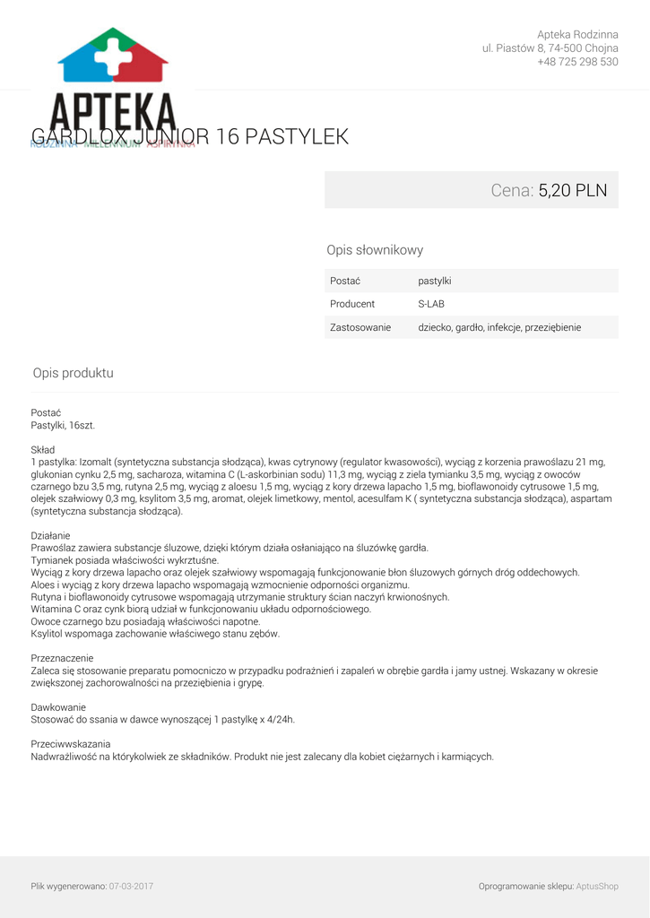 Apteka Rodzinna ul. Piastów 8, 74-500 Chojna +48 725 298 530 GARDLOX JUNIOR 16 PASTYLEK Cena: 5,20 PLN Opis słownikowy Postać pastylki Producent S-LAB Zastosowanie dziecko, gardło, infekcje, przeziębienie Opis produktu Postać Pastylki, 16szt. Skład 1 pastylka: Izomalt (syntetyczna substancja słodząca), kwas cytrynowy (regulator kwasowości), wyciąg z korzenia prawoślazu 21 mg, glukonian cynku 2,5 mg, sacharoza, witamina C (L-askorbinian sodu) 11,3 mg, wyciąg z ziela tymianku 3,5 mg, wyciąg z owoców czarnego bzu 3,5 mg, rutyna 2,5 mg, wyciąg z aloesu 1,5 mg, wyciąg z kory drzewa lapacho 1,5 mg, bioflawonoidy cytrusowe 1,5 mg, olejek szałwiowy 0,3 mg, ksylitom 3,5 mg, aromat, olejek limetkowy, mentol, acesulfam K ( syntetyczna substancja słodząca), aspartam (syntetyczna substancja słodząca). Działanie Prawoślaz zawiera substancje śluzowe, dzięki którym działa osłaniająco na śluzówkę gardła. Tymianek posiada właściwości wykrztuśne. Wyciąg z kory drzewa lapacho oraz olejek szałwiowy wspomagają funkcjonowanie błon śluzowych górnych dróg oddechowych. Aloes i wyciąg z kory drzewa lapacho wspomagają wzmocnienie odporności organizmu. Rutyna i bioflawonoidy cytrusowe wspomagają utrzymanie struktury ścian naczyń krwionośnych. Witamina C oraz cynk biorą udział w funkcjonowaniu układu odpornościowego. Owoce czarnego bzu posiadają właściwości napotne. Ksylitol wspomaga zachowanie właściwego stanu zębów. Przeznaczenie Zaleca się stosowanie preparatu pomocniczo w przypadku podrażnień i zapaleń w obrębie gardła i jamy ustnej. Wskazany w okresie zwiększonej zachorowalności na przeziębienia i grypę. Dawkowanie Stosować do ssania w dawce wynoszącej 1 pastylkę x 4/24h. Przeciwwskazania Nadwrażliwość na którykolwiek ze składników. Produkt nie jest zalecany dla kobiet ciężarnych i karmiących. Plik wygenerowano: 07-03-2017 Powered by TCPDF (www.tcpdf.org) Oprogramowanie sklepu: AptusShop