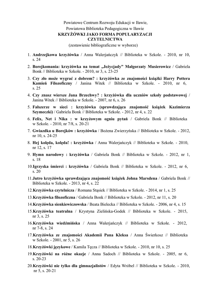 Powiatowe Centrum Rozwoju Edukacji w Iławie, Powiatowa Biblioteka Pedagogiczna w Iławie KRZYŻÓWKI JAKO FORMA POPULARYZACJI CZYTELNICTWA (zestawienie bibliograficzne w wyborze) 1. Andrzejkowa krzyżówka / Anna Walerjańczyk // Biblioteka w Szkole. - 2010, nr 10, s. 24 2. Borejkomania: krzyżówka na temat „Jeżycjady” Małgorzaty Musierowicz / Gabriela Bonk // Biblioteka w Szkole. - 2010, nr 3, s. 23-25 3. Czy zło może wygrać z dobrem? : krzyżówka ze znajomości książki Harry Pottera Kamień Filozoficzny / Janina Witek // Biblioteka w Szkole. - 2010, nr 6, s. 25 4. Czy znasz wiersze Jana Brzechwy? : krzyżówka dla uczniów szkoły podstawowej / Janina Witek // Biblioteka w Szkole. - 2007, nr 6, s. 26 5. Fałszerze w sieci : krzyżówka (sprawdzająca znajomość książek Kazimierza Szymeczki) / Gabriela Bonk // Biblioteka w Szkole. - 2012, nr 4, s. 22 6. Felix, Net i Nika : w krzyżowym ogniu pytań / Gabriela Bonk // Biblioteka w Szkole. - 2010, nr 7/8, s. 20-21 7. Gwiazdka u Borejków : krzyżówka / Bożena Zwierzyńska // Biblioteka w Szkole. - 2012, nr 10, s. 24-25 8. Hej kolęda, kolęda! : krzyżówka / Anna Walerjańczyk // Biblioteka w Szkole. - 2010, nr 12, s. 17 9. Hymn narodowy : krzyżówka / Gabriela Bonk // Biblioteka w Szkole. - 2012, nr 1, s. 18 10.Igrzyska śmierci : krzyżówka / Gabriela Bonk // Biblioteka w Szkole. - 2012, nr 6, s. 20 11.Jutro krzyżówka sprawdzająca znajomość książek Johna Marsdena / Gabriela Bonk // Biblioteka w Szkole. - 2013, nr 4, s. 22 12.Krzyżówka czytelnicza / Romana Stąsiek // Biblioteka w Szkole. - 2014, nr 1, s. 25 13.Krzyżówka filozoficzna / Gabriela Bonk // Biblioteka w Szkole. - 2012, nr 11, s. 20 14.Krzyżówka sienkiewiczowska / Beata Bielecka // Biblioteka w Szkole. - 2006, nr 4, s. 15 15.Krzyżówka teatralna / Krystyna Zielińska-Godek // Biblioteka w Szkole. - 2015, nr 3, s. 25 16.Krzyżówka wiedźmińska / Anna Walerjańczyk // Biblioteka w Szkole. - 2012, nr 7-8, s. 24 17.Krzyżówka ze znajomości Akademii Pana Kleksa / Anna Świerkosz // Biblioteka w Szkole. - 2001, nr 5, s. 26 18.Krzyżówki językowe / Kamila Tęcza // Biblioteka w Szkole. - 2010, nr 10, s. 25 19.Krzyżówki na różne okazje / Anna Sadoch // Biblioteka w Szkole. - 2005, nr 6, s. 20-23 20.Krzyżówki nie tylko dla gimnazjalistów / Edyta Wróbel // Biblioteka w Szkole. - 2010, nr 5, s. 20-21 21.Kuzynki : krzyżówka / Anna Walerjańczyk // Biblioteka w Szkole. - 2013, nr 2, s. 9 22.Quiz i krzyżówka w pracy świetlicy / Katarzyna Nowosad // Wychowawca. - 2012, nr 10, s. 28-29 23.Maria Skłodowska-Curie : krzyżówka / Danuta Korpała-Meus // Biblioteka w Szkole. - 2011, nr 4, s. 20 24.McDusia : krzyżówka na podstawie powieści Małgorzaty Musierowicz / Bożena Zwierzyńska // Biblioteka w Szkole. - 2014, nr 7-8, s. 34-35 25.Najpopularniejszy polski kompozytor / Danuta Dębska // Wszystko dla Szkoły. - 2010, nr 10, s. 24 26.Niekończąca się ... krzyżówka / Gabriela Bonk. – Bibliogr. // Biblioteka w Szkole. - 2009, nr 12, s. 22-23 27.Odessa i tajemnica Skrybopolis : krzyżówka na podstawie książki Petera ven Olmena / Gabriela Bonk // Biblioteka w Szkole. - 2015, nr 2, s. 20-21 28.Odkrywanie sensu życia : krzyżówka / Janina Witek // Biblioteka w Szkole. - 2013, nr 1, s. 17 29.Ogniem i mieczem : krzyżówka / Bogumiła Pierzchanowska // Biblioteka w Szkole. – 2000, nr 12, s. 31 30.Prometeusz - dobroczyńca ludzkości : krzyżówka sprawdzająca znajomość mitu / Janina Witek // Biblioteka w Szkole. - 2010, nr 9, s. 21 31.Rusz głową! : krzyżówka dla miłośników "Opowieści z Narnii" / Anna Skwara // Biblioteka w Szkole. - 2007, nr 2, s. 23-25 32.Sienkiewiczowskie łamigłówki / Elżbieta Bielenia. – Bibliogr. // Poradnik Bibliotekarza. 2006, nr 5, s. 32-33 33.Sprężyna : krzyżówka na jubileusz Małgorzaty Musierowicz / Bożena Zwierzyńska // Biblioteka w Szkole. - 2014, nr 11, s. 22-23 34.To i owo o książce: krzyżówka tematyczna dla klas V-VI szkoły podstawowej / Janina Witek // Biblioteka w Szkole. - 2007, nr 3, s. 12 35.Trylogia Reginy Doman : krzyżówka / Gabriela Bonk // Biblioteka w Szkole. - 2012, nr 12, s. 22 36.Walentynki z "Jeżycjadą" : krzyżówka / Bożena Zwierzyńska // Biblioteka w Szkole. - 2011, nr 1, s. 22-23 37.Wnuczka do orzechów : krzyżówka z okazji jubileuszu Małgorzaty Musierowicz // Biblioteka w Szkole. - 2015, nr 3, s. 32-33 38.Znam przygody Puca, Bursztyna i ich gości / Janina Witek // Biblioteka w Szkole. – 2002, nr 11, s. 31 39.Zwiadowcy : konkurs czytelniczy na temat serii książek Johna Flangana / Gabriela Bonk // Biblioteka w Szkole. - 2011, nr 5, s. 14-15