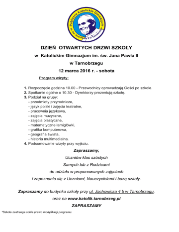 DZIEŃ OTWARTYCH DRZWI SZKOŁY w Katolickim Gimnazjum im. św. Jana Pawła II w Tarnobrzegu 12 marca 2016 r. - sobota Program wizyty: 1. Rozpoczęcie godzina 10.00 - Przewodnicy oprowadzają Gości po szkole. 2. Spotkanie ogólne o 10.30 - Dyrektorzy prezentują szkołę. 3. Podział na grupy: - przedmioty przyrodnicze, - język polski i zajęcia teatralne, - pracownia językowa, - zajęcia muzyczne, - zajęcia plastyczne, - matematyczne łamigłówki, - grafika komputerowa, - geografia świata, - historia multimedialna. 4. Podsumowanie wizyty przy wyjściu. Zapraszamy, Uczniów klas szóstych Samych lub z Rodzicami do udziału w proponowanych zajęciach i zapoznania się z Uczniami, Nauczycielami i bazą szkoły. Zapraszamy do budynku szkoły przy ul. Jachowicza 4 b w Tarnobrzegu, oraz na www.katolik.tarnobrzeg.pl ZAPRASZAMY *Szkoła zastrzega sobie prawo modyfikacji programu.
