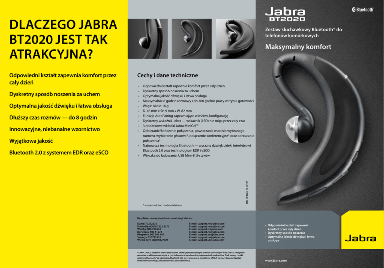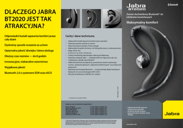 DLACZEGO JABRA BT2020 JEST TAK ATRAKCYJNA? Dyskretny sposób noszenia za uchem Optymalna jakość dźwięku i łatwa obsługa Dłuższy czas rozmów — do 8 godzin Innowacyjne, niebanalne wzornictwo Wyjątkowa jakość Bluetooth 2.0 z systemem EDR oraz eSCO Maksymalny komfort Cechy i dane techniczne • • • • • • • • • • • • Odpowiedni kształt zapewnia komfort przez cały dzień Dyskretny sposób noszenia za uchem Optymalna jakość dźwięku i łatwa obsługa Maksymalnie 8 godzin rozmowy i do 360 godzin pracy w trybie gotowości Waga: około 16 g D. 46 mm x Sz. 9 mm x W. 82 mm Funkcja AutoPairing zapewniające właściwą konfigurację Dyskretny wskaźnik Jabra — wskaźnik (LED) nie miga przez cały czas 3 dodatkowe wkładki Jabra MiniGel™ Odbieranie/kończenie połączenia, powtarzanie ostatnio wybranego numeru, wybieranie głosowe*, połączenie konferencyjne* oraz odrzucanie połączenia* Najnowsza technologia Bluetooth — wyraźny dźwięk dzięki interfejsowi Bluetooth 2.0 oraz technologiom EDR i eSCO Wtyczka do ładowania: USB Mini-B, 5-styków M04_BT2020_17_07/07 Odpowiedni kształt zapewnia komfort przez cały dzień Zestaw słuchawkowy Bluetooth® do telefonów komórkowych * w zależności od modelu telefonu Bezpłatne numery telefoniczne obsługi klienta: Dania: 70252272 Finlandia: 00800 722 52272 Włochy: 800 786543 Norwegia: 800 61272 Hiszpania: 900 984 542 Szwecja: 020792522 Wielka Bryt: 0800 0327026 E-mail: [email protected] E-mail: [email protected] E-mail: [email protected] E-mail: [email protected] E-mail: [email protected] E-mail: [email protected] E-mail: [email protected] © 2007, GN A/S. Wszelkie prawa zastrzeżone. Jabra® jest zastrzeżonym znakiem towarowym firmy GN A/S. Wszystkie pozostałe znaki towarowe użyte w tym dokumencie są własnością odpowiednich podmiotów. Znak słowny i znaki graficzne Bluetooth® są własnością Bluetooth SIG, Inc. i używane są przez firmę GN A/S na mocy licencji. (Wygląd i dane techniczne mogą ulec zmianie bez powiadomienia). • O dpowiedni kształt zapewnia komfort przez cały dzień • Dyskretny sposób noszenia • Optymalna jakość dźwięku i łatwa obsługa www.jabra.com Maksymalny komfort Skrócona instrukcja obsługi Rozmowa przez cały dzień Polujesz na ważnych klientów? Pracujesz w domu? Niezależnie od tego, gdzie jesteś, Jabra — Twój zestaw słuchawkowy zapewni Ci pełen komfort nawet w najbardziej zwariowanym dniu. Innowacyjne, niebanalne wzornictwo i doskonała ergonomia sprawiają, że zestaw słuchawkowy Jabra to doskonała inwestycja. Naładuj zestaw słuchawkowy. Ładuj swój zestaw słuchawkowy Jabra BT2020, dopóki nie zgaśnie świecący wskaźnik LED (ok. 2 godziny). 5 Włączanie i wyłączanie zestawu słuchawkowego Aby włączyć lub wyłączyć zestaw słuchawkowy, naciśnij przycisk odbierania/ kończenia połączenia i przytrzymaj, dopóki wskaźnik (LED) nie błyśnie kilka razy. 6 Elegancja i komfort Nowa Jabra BT2020 jest trwała, a zarazem stylowa, a jej ciężar rozkłada się na uchu równomiernie. Konstrukcja zestawu Jabra zapewnia pewne i dyskretne dopasowanie, dzięki czemu z pewnością utrzyma się on na swoim miejscu — nawet jeśli biegniesz na spotkanie. A jeśli rozmawiasz bardzo długo, zestaw słuchawkowy Jabra zapewnia Ci komfort i swobodę przez cały dzień. Powiązywanie zestawu słuchawkowego z telefonem 1. Po włączeniu zestawu słuchawkowego Jabra po raz pierwszy automatycznie włączony zostanie tryb powiązywania. 2. Aktywuj funkcję Bluetooth telefonu. 3. Naciśnij przycisk „Tak” na telefonie i potwierdź, wprowadzając kod PIN: 0000 (4 zera). 4. Telefon potwierdzi zakończenie powiązywania. 1 Bogate wyposażenie, świetna cena Jabra BT2020 nie tylko zapewnia komfort noszenia, ale również szeroką gamę funkcji. Zestaw Jabra wyróżnia nowoczesna technologia, niebanalne wzornictwo, a także doskonała jakość dźwięku i intuicyjna obsługa. Jednak nie możesz polegać tylko na naszym słowie. Załóż i sprawdź. Korzystanie z zestawu słuchawkowego jeszcze nigdy nie było tak przyjemne. Korzystanie z zestawu słuchawkowego Aby odebrać połączenie, naciśnij przycisk odbierania/kończenia połączenia zestawu słuchawkowego. Aby zakończyć połączenie, ponownie naciśnij przycisk odbierania/kończenia połączenia. 3 2 4 Sposób noszenia — wybór należy do Ciebie Zestaw słuchawkowy Jabra BT2020 jest przystosowany do noszenia na prawym uchu. Jeśli wolisz nosić go na lewym uchu, ostrożnie obróć zaczep MiniGel™ o 180 stopni. Aby zapewnić jak najlepsze dopasowanie do ucha, zestaw Jabra BT2020 zawiera dwa rodzaje wkładek MiniGel™. Aby zmienić wkładkę MiniGel™, wystarczy ją wyjąć, lekko przekręcając. 1 Przycisk odbierania/ kończenia połączenia Przycisk włączania/ wyłączania Aby włączyć, naciśnij lub przytrzymaj przycisk. 2 Przycisk głośności Lekko naciśnij, aby zwiększyć głośność, przytrzymaj, aby zmniejszyć głośność. 3 Gniazdo ładowania Łatwe ładowanie dzięki dostarczonemu zasilaczowi AC 4 Wskaźnik (LED) Sygnalizuje stan połączenia Bluetooth, niski poziom naładowania, tryb ładowania baterii 5 Wkładki Jabra MiniGelTM Obracają się, umożliwiając noszenie na prawym/lewym uchu. 6 Wysięgnik mikrofonu Optymalna jakość dźwięku