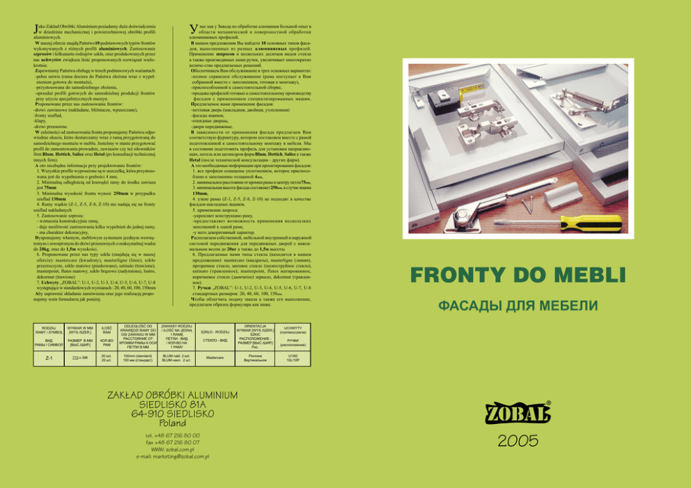 J ako Zak³ad Obróbki Aluminium posiadamy du¿e dowiadczenie w dziedzinie mechanicznej i powierzchniowej obróbki profili aluminiowych. W naszej ofercie znajd¹ Pañstwo 10 podstawowych typów frontów wykonywanych z ró¿nych profili aluminiowych. Zastosowanie szprosów i kilkunastu rodzajów szk³a, oraz produkowanych przez nas uchwytów zwiêksza iloæ proponowanych rozwi¹zañ wielokrotnie. Zapewniamy Pañstwu obs³ugê w trzech podstawowych wariantach: -pe³en serwis (rama dociera do Pañstwa z³o¿ona wraz z wype³nieniem gotowa do monta¿u), -przystosowana do samodzielnego z³o¿enia, -sprzeda¿ profili gotowych do samodzielnej produkcji frontów przy u¿yciu specjalistycznych maszyn. Proponowane przez nas zastosowanie frontów: -drzwi zawiasowe (nak³adane, bliniacze, wpuszczane), -fronty szuflad, -klapy, -drzwi przesuwne. W zale¿noci od zastosowania frontu proponujemy Pañstwu odpowiednie okucie, które dostarczamy wraz z ram¹ przygotowan¹ do samodzielnego monta¿u w meblu. Jestemy w stanie przygotowaæ profil do zamontowania prowadnic, zawiasów czy te¿ si³owników firm Blum, Hettich, Salice oraz Hetal (po konsultacji technicznej innych firm). A oto niezbêdne informacje przy projektowaniu frontów: 1. Wszystkie profile wyposa¿one s¹ w uszczelkê, która przystosowana jest do wype³nienia o gruboci 4 mm, 2. Minimaln¹ odleg³oci¹ od krawêdzi ramy do rodka zawiasu jest 75mm 3. Minimalna wysokoæ frontu wynosi 250mm w przypadku szuflad 130mm 4. Ramy w¹skie (Z-1, Z-5, Z-8, Z-10) nie nadaj¹ siê na fronty szuflad nak³adanych 5. Zastosowanie szprosu: - wzmacnia konstrukcyjnie ramê, - daje mo¿liwoæ zastosowania kilku wype³nieñ do jednej ramy, - ma charakter dekoracyjny, Dysponujemy w³asnym, meblowym systemem jezdnym wewnêtrznym i zewnêtrznym do drzwi przesuwnych o maksymalnej wadze do 20kg, oraz do 1,5m wysokoci. 6. Proponowane przez nas typy szk³a (znajduj¹ siê w naszej ofercie): mastercare (kwadraty), masterligne (linie), szk³o przezroczyste, szk³o matowe (piaskowane), satinato (trawione), masterpoint, flutes matowy, szk³o br¹zowe (zadymione), lustro, dekormat (trawione) 7. Uchwyty ZOBAL: U-1, U-2, U-3, U-4, U-5, U-6, U-7, U-8 wystêpuj¹ce w standardowych wymiarach : 20, 40, 60, 100, 150mm Aby usprawniæ sk³adanie zamówienia oraz jego realizacjê proponujemy wzór formularza jak poni¿ej. RODZAJ RAMY / SYMBOL WYMIAR W MM [WYS./SZER.] ILOÆ RAM ÂÈÄ ÐÀÌÛ / ÑÈÌÂÎË ÐÀÇÌÅÐ Â ÌÌ [ÂÛÑ./ØÈÐ.] ÊÎË-ÂÎ ÐÀÌ Z-1 713 x 396 20 szt. 20 øò. Ó íàñ êàê ó Çàâîäà ïî îáðàáîòêå àëþìèíèÿ áîëüøîé îïûò â îáëàñòè ìåõàíè÷åñêîé è ïîâåðõíîñòíîé îáðàáîòêè àëþìèíèåâûõ ïðîôèëåé.  íàøåì ïðåäëîæåíèè Âû íàéäåòå 10 îñíîâíûõ òèïîâ ôàñàäîâ, âûïîëíåííûõ èç ðàçíûõ àëþìèíèåâûõ ïðîôèëåé. Ïðèìåíåíèå øïðîñîâ è íåñêîëüêèõ äåñÿòêîâ âèäîâ ñòåêëà à òàêæå ïðîèçâîäèìûõ íàìè ðó÷åê, óâåëè÷èâàåò ìíîãîêðàòíî êîëè÷å-ñòâî ïðåäëàãàåìûõ ðåøåíèé. Îáåñïå÷èâàåì Âàì îáñëóæèâàíèå â òðåõ îñíîâíûõ âàðèàíòàõ: -ïîëíîå ñåðâèñíîå îáñëóæèâàíèå (ðàìà ïîñòóïàåò ê Âàì ñîáðàííîé âìåñòå ñ çàïîëíåíèåì, ãîòîâàÿ ê ìîíòàæó), -ïðèñïîñîáëåííîé ê ñàìîñòîÿòåëüíîé ñáîðêå, -ïðîäàæà ïðîôèëåé ãîòîâûõ ê ñàìîñòîÿòåëüíîìó ïðîèçâîäñòâó ôàñàäîâ ñ ïðèìåíåíèåì ñïåöèàëèçèðîâàííûõ ìàøèí. Ïðåäëàãàåìîå íàìè ïðèìåíåíèå ôàñàäîâ: -ïåòëåâàÿ äâåðü (íàêëàäíàÿ, äâîéíàÿ, óòîïëåííàÿ) -ôàñàäû ÿùèêîâ, -îòêèäíûå äâåðöû, -äâåðè ïåðåäâèæíûå.  çàâèñèìîñòè îò ïðèìåíåíèÿ ôàñàäà ïðåäëàãàåì Âàì ñîîòâåòñòâóþ ôóðíèòóðó, êîòîðîþ ïîñòàâëÿåì âìåñòå ñ ðàìîé ïîäãîòîâëåííîé ê ñàìîñòîÿòåëüíîìó ìîíòàæó â ìåáåëè. Ìû â ñîñòîÿíèè ïîäãîòîâèòü ïðîôèëü äëÿ óñòàíîâêè íàïðàâëÿþùèõ, ïåòåëü èëè öèëèíäðîâ ôèðì Blum, Hettich, Salice à òàêæå Hetal (ïîñëå òåõíè÷åñêîé êîíñóëüòàöèè - äðóãèõ ôèðì). À ýòî íåîáõîäèìûå èíôîðìàöèè ïðè ïðîåêòèðîâàíèè ôàñàäîâ: 1. âñå ïðîôèëè îñíàùåíû óïëîòíåíèåì, êîòîðîå ïðèñïîñîáëåíî ê çàïîëíåíèþ òîëùèíîé 4ìì, 2. ìèíèìàëüíîå ðàññòîÿíèå îò êðîìêè ðàìû ê öåíòðó ïåòëè75ìì, 3. ìèíèìàëüíàÿ âûñîòà ôàñàäà ñîñòàâëÿåò 250ìì, â ñëó÷àå ÿùèêà 130mm, 4. óçêèå ðàìû (Z-1, Z-5, Z-8, Z-10) íå ïîäõîäÿò â êà÷åñòâå ôàñàäîâ íàêëàäíûõ ÿùèêîâ, 5. ïðèìåíåíèå øïðîñà: -óêðåïëÿåò êîíñòðóêöèþ ðàìó, -ïðåäîñòàâëÿåò âîçìîæíîñòü ïðèìåíåíèÿ íåñêîëüçêèõ çàïîëíåíèé ê îäíîé ðàìå, -ó íåãî äåêîðàòèâíûé õàðàêòåð. Ðàñïîëàãàåì ñîáñòâåííîé, ìåáåëüíîé âíóòðåííåé è íàðóæíîé ñèñòåìîé ïåðåäâèæåíèÿ äëÿ ïåðåäâèæíûõ äâåðåé ñ ìàêñèìàëüíûì âåñîì äî 20êã à òàêæå äî 1,5ì âûñîòû. 6. Ïðåäëàãàåìûå íàìè òèïû ñòåêëà (íàõîäÿòñÿ â íàøåì ïðåäëîæåíèè): mastercare (êâàäðàòû), masterligne