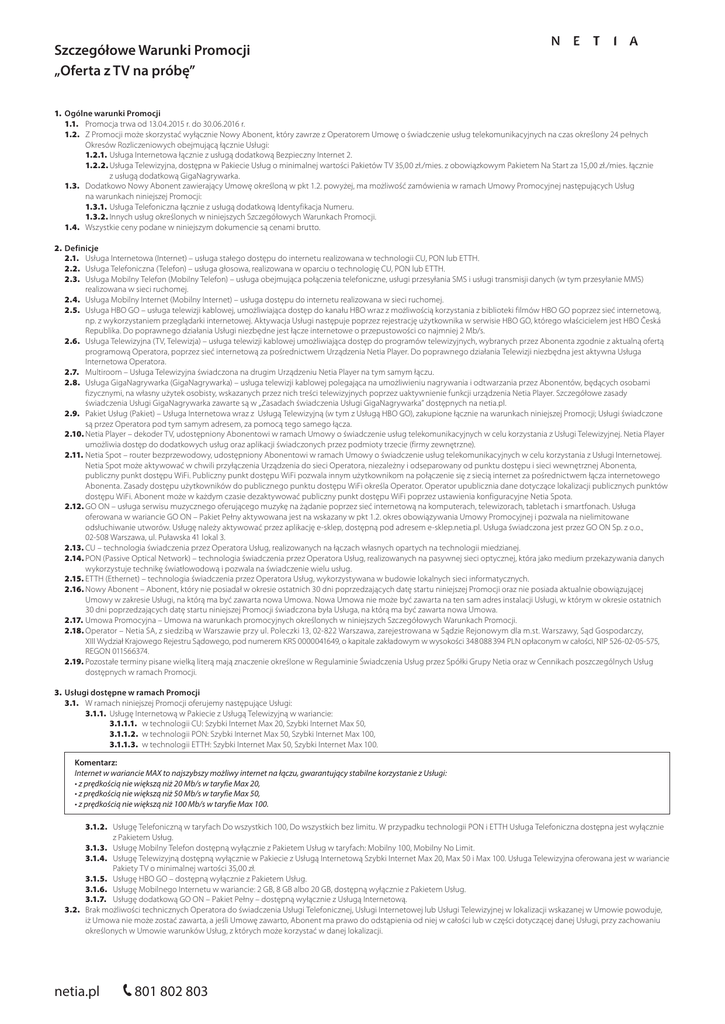 Szczegółowe Warunki Promocji „Oferta z TV na próbę” 1. Ogólne warunki Promocji 1.1. Promocja trwa od 13.04.2015 r. do 30.06.2016 r. 1.2. Z Promocji może skorzystać wyłącznie Nowy Abonent, który zawrze z Operatorem Umowę o świadczenie usług telekomunikacyjnych na czas określony 24 pełnych Okresów Rozliczeniowych obejmującą łącznie Usługi: 1.2.1. Usługa Internetowa łącznie z usługą dodatkową Bezpieczny Internet 2. 1.2.2. Usługa Telewizyjna, dostępna w Pakiecie Usług o minimalnej wartości Pakietów TV 35,00 zł./mies. z obowiązkowym Pakietem Na Start za 15,00 zł./mies. łącznie z usługą dodatkową GigaNagrywarka. 1.3. Dodatkowo Nowy Abonent zawierający Umowę określoną w pkt 1.2. powyżej, ma możliwość zamówienia w ramach Umowy Promocyjnej następujących Usług na warunkach niniejszej Promocji: 1.3.1. Usługa Telefoniczna łącznie z usługą dodatkową Identyfikacja Numeru. 1.3.2. Innych usług określonych w niniejszych Szczegółowych Warunkach Promocji. 1.4. Wszystkie ceny podane w niniejszym dokumencie są cenami brutto. 2. Definicje 2.1. Usługa Internetowa (Internet) – usługa stałego dostępu do internetu realizowana w technologii CU, PON lub ETTH. 2.2. Usługa Telefoniczna (Telefon) – usługa głosowa, realizowana w oparciu o technologię CU, PON lub ETTH. 2.3. Usługa Mobilny Telefon (Mobilny Telefon) – usługa obejmująca połączenia telefoniczne, usługi przesyłania SMS i usługi transmisji danych (w tym przesyłanie MMS) realizowana w sieci ruchomej. 2.4. Usługa Mobilny Internet (Mobilny Internet) – usługa dostępu do internetu realizowana w sieci ruchomej. 2.5. Usługa HBO GO – usługa telewizji kablowej, umożliwiająca dostęp do kanału HBO wraz z możliwością korzystania z biblioteki filmów HBO GO poprzez sieć internetową, np. z wykorzystaniem przeglądarki internetowej. Aktywacja Usługi następuje poprzez rejestrację użytkownika w serwisie HBO GO, którego właścicielem jest HBO Česká Republika. Do poprawnego działania Usługi niezbędne jest łącze internetowe o przepustowości co najmniej 2 Mb/s. 2.6. Usługa Telewizyjna (TV, Telewizja) – usługa telewizji kablowej umożliwiająca dostęp do programów telewizyjnych, wybranych przez Abonenta zgodnie z aktualną ofertą programową Operatora, poprzez sieć internetową za pośrednictwem Urządzenia Netia Player. Do poprawnego działania Telewizji niezbędna jest aktywna Usługa Internetowa Operatora. 2.7. Multiroom – Usługa Telewizyjna świadczona na drugim Urządzeniu Netia Player na tym samym łączu. 2.8. Usługa GigaNagrywarka (GigaNagrywarka) – usługa telewizji kablowej polegająca na umożliwieniu nagrywania i odtwarzania przez Abonentów, będących osobami fizycznymi, na własny użytek osobisty, wskazanych przez nich treści telewizyjnych poprzez uaktywnienie funkcji urządzenia Netia Player. Szczegółowe zasady świadczenia Usługi GigaNagrywarka zawarte są w „Zasadach świadczenia Usługi GigaNagrywarka” dostępnych na netia.pl. 2.9. Pakiet Usług (Pakiet) – Usługa Internetowa wraz z Usługą Telewizyjną (w tym z Usługą HBO GO), zakupione łącznie na warunkach niniejszej Promocji; Usługi świadczone są przez Operatora pod tym samym adresem, za pomocą tego samego łącza. 2.10. Netia Player – dekoder TV, udostępniony Abonentowi w ramach Umowy o świadczenie usług telekomunikacyjnych w celu korzystania z Usługi Telewizyjnej. Netia Player umożliwia dostęp do dodatkowych usług oraz aplikacji świadczonych przez podmioty trzecie (firmy zewnętrzne). 2.11. Netia Spot – router bezprzewodowy, udostępniony Abonentowi w ramach Umowy o świadczenie usług telekomunikacyjnych w celu korzystania z Usługi Internetowej. Netia Spot może aktywować w chwili przyłączenia Urządzenia do sieci Operatora, niezależny i odseparowany od punktu dostępu i sieci wewnętrznej Abonenta, publiczny punkt dostępu WiFi. Publiczny punkt dostępu WiFi pozwala innym użytkownikom na połączenie się z siecią internet za pośrednictwem łącza internetowego Abonenta. Zasady dostępu użytkowników do publicznego punktu dostępu WiFi określa Operator. Operator upublicznia dane dotyczące lokalizacji publicznych punktów dostępu WiFi. Abonent może w każdym czasie dezaktywować publiczny punkt dostępu WiFi poprzez ustawienia konfiguracyjne Netia Spota. 2.12. GO ON – usługa serwisu muzycznego oferującego muzykę na żądanie poprzez sieć internetową na komputerach, telewizorach, tabletach i smartfonach. Usługa oferowana w wariancie GO ON – Pakiet Pełny aktywowana jest na wskazany w pkt 1.2. okres obowiązywania Umowy Promocyjnej i pozwala na nielimitowane odsłuchiwanie utworów. Usługę należy aktywować przez aplikację e-sklep, dostępną pod adresem e-sklep.netia.pl. Usługa świadczona jest przez GO ON Sp. z o.o., 02-508 Warszawa, ul. Puławska 41 lokal 3. 2.13. CU – technologia świadczenia przez Operatora Usług, realizowanych na łączach własnych opartych na technologii miedzianej. 2.14. PON (Passive Optical Network) – technologia świadczenia przez Operatora Usług, realizowanych na pasywnej sieci optycznej, która jako medium przekazywania danych wykorzystuje technikę światłowodową i pozwala na świadczenie wielu usług. 2.15. ETTH (Ethernet) – technologia świadczenia przez Operatora Usług, wykorzystywana w budowie lokalnych sieci informatycznych. 2.16. Nowy Abonent – Abonent, który nie posiadał w okresie ostatnich 30 dni poprzedzających datę startu niniejszej Promocji oraz nie posiada aktualnie obowiązującej Umowy w zakresie Usługi, na którą ma być zawarta nowa Umowa. Nowa Umowa nie może być zawarta na ten sam adres instalacji Usługi, w którym w okresie ostatnich 30 dni poprzedzających datę startu niniejszej Promocji świadczona była Usługa, na którą ma być zawarta nowa Umowa. 2.17. Umowa Promocyjna – Umowa na warunkach promocyjnych określonych w niniejszych Szczeg