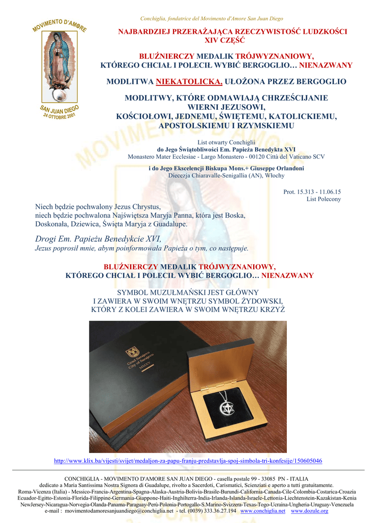 Conchiglia, fondatrice del Movimento d'Amore San Juan Diego NAJBARDZIEJ PRZERAŻAJĄCA RZECZYWISTOŚĆ LUDZKOŚCI XIV CZĘŚĆ BLUŹNIERCZY MEDALIK TRÓJWYZNANIOWY, KTÓREGO CHCIAŁ I POLECIŁ WYBIĆ BERGOGLIO… NIENAZWANY MODLITWA NIEKATOLICKA, UŁOŻONA PRZEZ BERGOGLIO MODLITWY, KTÓRE ODMAWIAJĄ CHRZEŚCIJANIE WIERNI JEZUSOWI, KOŚCIOŁOWI, JEDNEMU, ŚWIĘTEMU, KATOLICKIEMU, APOSTOLSKIEMU I RZYMSKIEMU List otwarty Conchiglii do Jego Świątobliwości Em. Papieża Benedykta XVI Monastero Mater Ecclesiae - Largo Monastero - 00120 Città del Vaticano SCV i do Jego Ekscelencji Biskupa Mons.+ Giuseppe Orlandoni Diecezja Chiaravalle-Senigallia (AN), Włochy Niech będzie pochwalony Jezus Chrystus, niech będzie pochwalona Najświętsza Maryja Panna, która jest Boska, Doskonała, Dziewica, Święta Maryja z Guadalupe. Prot. 15.313 - 11.06.15 List Polecony Drogi Em. Papieżu Benedykcie XVI, Jezus poprosił mnie, abym poinformowała Papieża o tym, co następuje. BLUŹNIERCZY MEDALIK TRÓJWYZNANIOWY, KTÓREGO CHCIAŁ I POLECIŁ WYBIĆ BERGOGLIO… NIENAZWANY SYMBOL MUZUŁMAŃSKI JEST GŁÓWNY I ZAWIERA W SWOIM WNĘTRZU SYMBOL ŻYDOWSKI, KTÓRY Z KOLEI ZAWIERA W SWOIM WNĘTRZU KRZYŻ http://www.klix.ba/vijesti/svijet/medaljon-za-papu-franju-predstavlja-spoj-simbola-tri-konfesije/150605046 CONCHIGLIA - MOVIMENTO D'AMORE SAN JUAN DIEGO - casella postale 99 - 33085 PN - ITALIA dedicato a Maria Santissima Nostra Signora di Guadalupe, rivolto a Sacerdoti, Carismatici, Scienziati e aperto a tutti gratuitamente. Roma-Vicenza (Italia) - Messico-Francia-Argentina-Spagna-Alaska-Austria-Bolivia-Brasile-Burundi-California-Canada-Cile-Colombia-Costarica-Croazia Ecuador-Egitto-Estonia-Florida-Filippine-Germania-Giappone-Haiti-Inghilterra-India-Irlanda-Islanda-Israele-Lettonia-Liechtenstein-Kazakistan-Kenia NewJersey-Nicaragua-Norvegia-Olanda-Panama-Paraguay-Perù-Polonia-Portogallo-S.Marino-Svizzera-Texas-Togo-Ucraina-Ungheria-Uruguay-Venezuela e-mail : [email protected] - tel. (0039) 333.36.27.194 www.conchiglia.net www.dozule.org MODLITWA TRÓJWYZNANIOWA, NIEKATOLICKA, UŁOŻONA PRZEZ BERGOGLIO Boże Wszechmogący i przedwieczny, Ojcze dobry i miłosierny; Stworzycielu nieba i ziemi, wszystkich rzeczy widzialnych i niewidzialnych; Boże Abrahama, Boże Izaaka, Boże Jakuba, Królu i Panie przeszłości, teraźniejszości i przyszłości; jedyny sędzio wszystkich ludzi, który nagradzasz wieczną chwałą Twoich wiernych! My, potomkowie Abrahama według wiary w Ciebie, jedynego Boga, żydzi, chrześcijnie i muzułmanie pokornie stajemy przed Tobą i z ufnością modlimy się do Ciebie za ten Kraj, Bośnię i Hercegowinę, ażeby mogli mieszkać w nim, w pokoju i zgodzie, mężczyźni i kobiety wierzący z różnych religii, narodów i kultur. Prosimy Cię, o, Ojcze, aby tak się stało we wszystkich Krajach świata! W każdym z nas umocnij wiarę i nadzieję, wzajemny szacunek i szczerą miłość do wszystkich naszych braci i sióstr. Spraw, abyśmy z odwagą angażowali się w budowanie sprawiedliwości społecznej, w stawanie się ludźmi dobrej woli, pełnymi wzajemnego zrozumienia i przebaczenia, cierpliwymi budowniczymi dialogu i pokoju. Niech wszystkie nasze myśli, słowa i czyny będą w zgodzie z Twoją wolą. Niech wszystko będzie na Twoją cześć i na Twoją chwałę oraz dla naszego zbawienia. Wieczna cześć i chwała Tobie, Boże nasz! Amen. Zródło: www.aleteia.org/it/video/papa-francesco-recita-la-preghiera-allunico-e-vero-dio-vivente-e-misericordioso-5844566011805696 http://ilpiccolo.gelocal.it/trieste/cronaca/2015/06/06/news/papa-francesco-a-sarajevo-per-un-messaggio-di-pace-1.11566246?refresh_ce IL PICCOLO www.avvenire.it/Chiesa/Pagine/papa-sarajevo.aspx AVVENIRE www.catholicvoicesitalia.it/il-papa-a-sarajevo-e-la-cultura-dellincontro/ CATHOLIC VOICES ITALIA www.papaboys.org/la-preghiera-di-papa-francesco-al-dio-unico-vero-ed-eterno/ PAPABOYS www.news.va/it/news/il-papa-ai-leader-religiosi-il-dialogo-e-fattore-d VATICAN NEWS www.radiovaticana.va/proxy/radiogiornale/ore14/2015/giugno/15_06_07.htm RADIO VATICANA ________________________________ Pamiętajcie… że Jestem Bogiem Miłosiernym… lecz również Sprawiedliwym i jako Bóg Sprawiedliwy… nie mogę dać tej samej zapłaty tym… którzy Mnie nie kochają i nie idą za Mną. 22 marca 2002 - 14.00 - Jezus do Conchiglii 2 CONCHIGLIA - MOVIMENTO D'AMORE SAN JUAN DIEGO - casella postale 99 - 33085 PN - ITALIA dedicato a Maria Santissima Nostra Signora di Guadalupe, rivolto a Sacerdoti, Carismatici, Scienziati e aperto a tutti gratuitamente. Roma-Vicenza (Italia) - Messico-Francia-Argentina-Spagna-Alaska-Austria-Bolivia-Brasile-Burundi-California-Canada-Cile-Colombia-Costarica-Croazia Ecuador-Egitto-Estonia-Florida-Filippine-Germania-Giappone-Haiti-Inghilterra-India-Irlanda-Islanda-Israele-Lettonia-Liechtenstein-Kazakistan-Kenia NewJersey-Nicaragua-Norvegia-Olanda-Panama-Paraguay-Perù-Polonia-Portogallo-S.Marino-Svizzera-Texas-Togo-Ucraina-Ungheria-Uruguay-Venezuela e-mail : [email protected] - tel. (0039) 333.36.27.194 www.conchiglia.net www.dozule.org MODLITWY, KTÓRE ODMAWIAJĄ CHRZEŚCIJANIE WIERNI JEZUSOWI, KOŚCIOŁOWI, JEDNEMU, ŚWIĘTEMU, KATOLICKIEMU, APOSTOLSKIEMU I RZYMSKIEMU Ja, Conchiglia della Santissima Trinità, i członkowie ruchu Movimento d'Amore San Juan Diego we Włoszech i na Świecie modlimy się do Jedynego i Prawdziwego Boga, ponieważ tylko Jezus gładzi grzech ze Świata i tylko Jezus Zbawia. CHWAŁA NA WYSOKOŚCI BOGU, a na ziemi pokój ludziom dobrej woli. Chwalimy Cię, błogosławimy Cię, wielbimy Cię, wysławiamy Cię, dzięki Ci składamy, bo Wielka jest Chwała Twoja, Panie Boże, Królu Nieba, Boże Ojcze Wszechmogący. Panie, Synu Jednorodzony, Jezu Chryste, Panie Boże, Baranku Boży, Synu Ojca, który gładzisz grzechy świata, zmiłuj się nad nami. Który gładzisz grzechy świata, przyjm błaganie nasze. Który siedzisz po prawicy Ojca, zmiłuj się nad nami. Albowiem tylko Tyś jest 