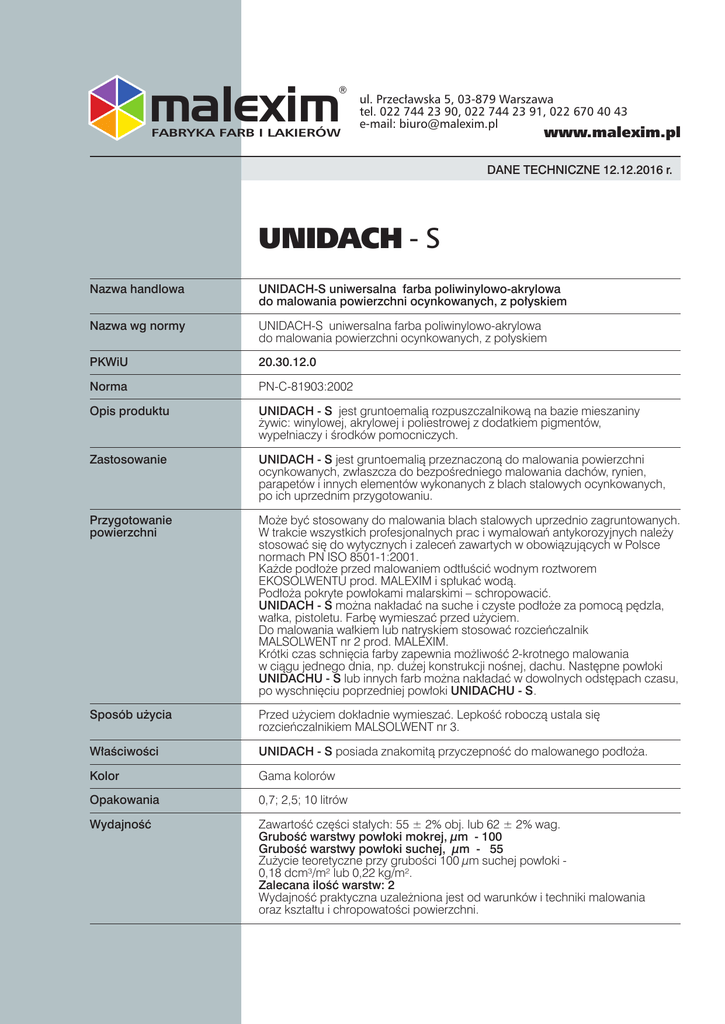 malexim ® FABRYKA FARB I LAKIERÓW ul. Przecławska 5, 03-879 Warszawa tel. 022 744 23 90, 022 744 23 91, 022 670 40 43 e-mail: [email protected] www.malexim.pl DANE TECHNICZNE 12.12.2016 r. UNIDACH - S Nazwa handlowa UNIDACH-S uniwersalna farba poliwinylowo-akrylowa do malowania powierzchni ocynkowanych, z połyskiem Nazwa wg normy UNIDACH-S uniwersalna farba poliwinylowo-akrylowa do malowania powierzchni ocynkowanych, z połyskiem PKWiU 20.30.12.0 Norma PN-C-81903:2002 Opis produktu UNIDACH - S jest gruntoemalią rozpuszczalnikową na bazie mieszaniny żywic: winylowej, akrylowej i poliestrowej z dodatkiem pigmentów, wypełniaczy i środków pomocniczych. Zastosowanie UNIDACH - S jest gruntoemalią przeznaczoną do malowania powierzchni ocynkowanych, zwłaszcza do bezpośredniego malowania dachów, rynien, parapetów i innych elementów wykonanych z blach stalowych ocynkowanych, po ich uprzednim przygotowaniu. Przygotowanie powierzchni Może być stosowany do malowania blach stalowych uprzednio zagruntowanych. W trakcie wszystkich profesjonalnych prac i wymalowań antykorozyjnych należy stosować się do wytycznych i zaleceń zawartych w obowiązujących w Polsce normach PN ISO 8501-1:2001. Każde podłoże przed malowaniem odtłuścić wodnym roztworem EKOSOLWENTU prod. MALEXIM i spłukać wodą. Podłoża pokryte powłokami malarskimi – schropowacić. UNIDACH - S można nakładać na suche i czyste podłoże za pomocą pędzla, wałka, pistoletu. Farbę wymieszać przed użyciem. Do malowania wałkiem lub natryskiem stosować rozcieńczalnik MALSOLWENT nr 2 prod. MALEXIM. Krótki czas schnięcia farby zapewnia możliwość 2-krotnego malowania w ciągu jednego dnia, np. dużej konstrukcji nośnej, dachu. Następne powłoki UNIDACHU - S lub innych farb można nakładać w dowolnych odstępach czasu, po wyschnięciu poprzedniej powłoki UNIDACHU - S. Sposób użycia Przed użyciem dokładnie wymieszać. Lepkość roboczą ustala się rozcieńczalnikiem MALSOLWENT nr 3. Właściwości UNIDACH - S posiada znakomitą przyczepność do malowanego podłoża. Kolor Gama kolorów Opakowania 0,7; 2,5; 10 litrów Wydajność Zawartość części stałych: 55 ± 2% obj. lub 62 ± 2% wag. Grubość warstwy powłoki mokrej, µm - 100 Grubość warstwy powłoki suchej, µm - 55 Zużycie teoretyczne przy grubości 100 µm suchej powłoki 0,18 dcm³/m² lub 0,22 kg/m². Zalecana ilość warstw: 2 Wydajność praktyczna uzależniona jest od warunków i techniki malowania oraz kształtu i chropowatości powierzchni. malexim ® FABRYKA FARB I LAKIERÓW UNIDACH - S str. 2 Czas wysychania Czasy wysychania w temp. 23±20C przy DTF 50 µm: Pyłosuchość - 0,5 godz. Suchość w dotyku - 2 godz. Ponowne malowanie w temp. 23±20C po 4 godz. Czasy schnięcia i ponownego malowania zależą od grubości warstwy, temperatury, wilgotności względnej powietrza i wentylacji. Rozcieńczalnik MALSOLWENT nr 3 prod. Malexim Sposób nanoszenia Pędzel Wałek Natrysk pneumatyczny Natrysk hydrodynamiczny Parametry techniczne Lepkość umowna wg kubka Forda Φ 4 min. 110 s Gęstość 1,20 ±0,5 g/cm3 Max. zawartość LZO Dz.U.2016r. Poz.1353, kategoria A/i/FR: 500 g/l. Produkt zawiera max.:456 ÷474 g/l LZO (zależnie od koloru farby) Atesty i Certyfikaty Atest PZH Wskazówki BHP i ppoż. Działa szkodliwie przez drogi oddechowe, skórę i po spożyciu. Ze względu na zawartość składników lotnych i palnych w wyrobie należy przestrzegać zasad i przepisów BHP i ppoż. zawartych w Karcie Charakterystyki Mieszaniny Chemicznej, ze szczególnym uwzględnieniem wentylacji pomieszczeń. Transport i przechowywanie Farba należy przechowywać i transportować w szczelnie zamkniętych opakowaniach z dala od ognia i źródeł ciepła w temp. 5-250C. Okres przydatności do użycia 36 miesięcy od daty produkcji.