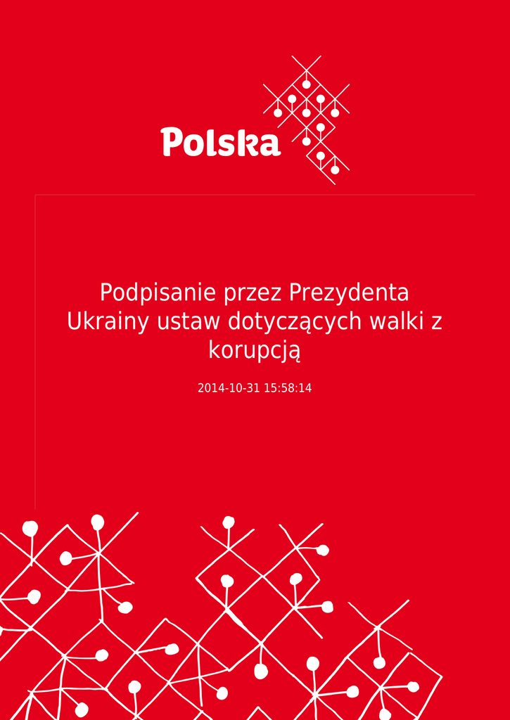 Podpisanie przez Prezydenta Ukrainy ustaw dotyczących walki z korupcją 2014-10-31 15:58:14 2 W dniu 23 października Prezydent Ukrainy podpisał ustawy dotyczące walki z korupcją na Ukrainie W dniu 23 października Prezydent Ukrainy podpisał następne ustawy dotyczące walki z korupcją na Ukrainie: Ustawa „O Narodowej Agencji Antykorupcyjnej Ukrainy” Ustawa „O przeciwdziałaniu korupcji” Ustawa „O zasadach polityki przeciwdziałania korupcji na Ukrainie (Strategia antykorupcyjna) na okres 20142017 r.” Ustawa „O wprowadzeniu zmian do niektórych aktów prawnych dotyczących określenia beneficjentów końcowych- osób prawnych i urzędników państwowych”. Szereg podpisanych przez Prezydenta ustaw antykorupcyjnych nie zawiera Ustawy „O przeciwdziałaniu i walce z legalizacją dochodów otrzymanych w wyniku przestępstwa, finansowaniu terroryzmu oraz finansowaniu rozprowadzania broni masowego rażenia”. Treść w/w Ustaw w załączniku. Źródło: „PwC” 3