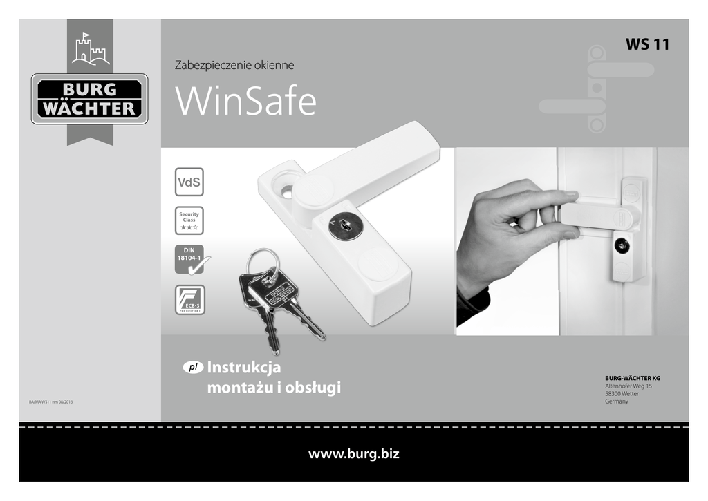 WS 11 Zabezpieczenie okienne WinSafe Security Class DIN 18104-1 I nstrukcja montażu i obsługi BA/MA WS11 nm 08/2016 www.burg.biz BURG-WÄCHTER KG Altenhofer Weg 15 58300 Wetter Germany Wstęp B. Zakres zastosowania Serdecznie państwu gratulujemy zakupu wysokiej jakości produktu BURG-WÄCHTER! Prosimy o staranne zapoznanie się z niniejszą instrukcją oraz o jej zachowanie. C. Zawartość opakowania Zabezpieczenie WS 11 montuje się po stronie otwieranej (klamki okiennej) okna lub drzwi balkonowych i nadaje się do wszelkich powszechnie stosowanych drewnianych lub aluminiowych okien / drzwi balkonowych, otwieranych do środka. 6 2 Prosimy o zwrócenie szczególnej uwagi: Podczas zabezpieczania okien i drzwi zawsze należy zapewnić wejście główne, które będzie można otwierać i zamykać z zewnątrz. W przypadku nieprzestrzegania warunków wyszczególnionych w niniejszej instrukcji dochodzi do wyraźnego obniżenia działania ochrony przed włamaniem. Treść niniejszej instrukcji A B C D E F 5 skazówki ogólne W Zakres zastosowania Zawartość opakowania Narzędzia Montaż Obsługa 3 A. Wskazówki ogólne Zabezpieczenie okienne WS11 jest zgodne z postanowieniami dyrektywy VdS 2536 oraz zostało skontrolowane według normy DIN 18104-1. Zgodnie z normą DIN 18104-1 na każdy 1 m wysokość okna powinno przypadać przynajmniej jedno montowane zabezpieczenie dodatkowe. Po stronie otwieranej (klamki okiennej) powinno być przynajmniej jedno zamykane zabezpieczenie dodatkowe. 4 1 2 3 4 5 6 1 Zabezpieczenie okienne z 2 kluczami Podkładki do zabezpieczenia okiennego 2 sztuki 1mm, 2 sztuki 2mm, 1 sztuka 4mm 3 sztuki kapturki ochronne do śrub 1 sztuka okucie blaszane skrzydła 1 sztuka obustronna podkładka naklejana Śruby z łbem stożkowym 1 sztuka Ø 8,0x60 / 2 sztuki Ø 8,0x80 / 1 sztuka Ø 2,9x13 Głębokość otworów wierconych i długość śrub należy przystosować do warunków miejscowych. Unikaj przewiercenia okna / drzwi balkonowych, ewentualnie zastosuj ogranicznik głębokości. Podczas wiercenia należy uważać, by nie uszkodzić elementów ruchomych, uszczelek ani szyby okiennej. Polecamy dokręcanie śrub mocujących ręką, w ten sposób nie dojdzie do ich przekręcenia. Za ewentualne zranienie czy też uszkodzenia, powstałe podczas montażu bądź w wyniku niewłaściwej manipulacji producent nie tponosi odpowiedzialności. Zalecamy zastosowanie kotwic montażowych BURG-WÄCHTER MA 99 DUO jako dodatkowego elementu zabezpieczającego. WinSafe WS 11 Polski | 2 D. Narzędzia • Śrubokręt krzyżowy / metr / ołówek / młotek • Wiertła Ø 2,5 / 6,5 • Piła / pilnik / imadło do skrócenia śrub (jeśli jest taka potrzeba) pod zabezpieczenie okienne wsuń podkładki tak, aby między dźwigną wychylną a skrzydłem okiennym powstał dystans ok. 3 mm. Przekręć dźwignię wychylną w bok i oznacz za pomocą ołówka miejsce otworu w okuciu blaszanym skrzydła. Zamontuj zabezpieczenie okienne przy pomocy wybranych podkładek i śrub znajdujących się w zestawie. Należy uważać, by nie przekręcić śrub. Znaki lekko uwydatnij na przykład przy pomocy czubka śruby / młotka i wiertłem Ø 2,5 wywierć otwór. E. Montaż Przed rozpoczęciem montażu prosimy o sprawdzenie działania okna / drzwi balkonowych. Powinny się otwierać i zamykać bez problemów. Zmierz, czy wymiary Twojego okna / drzwi balkonowych odpowiadają wymaganiom dotyczącym wymiarów, wyszczególnionym na stronie 5. Przy pomocy klucza będącego w zestawie otwórz zabezpieczenie okienne i wyjmij klucz. Przekręć dźwignię wychylną w bok i przytrzymaj zabezpieczenie okienne na ramie okna w położeniu docelowym. Przy pomocy podkładki o grubości 1mm wyznacz dystans od skrzydła okiennego i oznacz za pomocą ołówka 3 miejsca wiercenia otworów. W zaznaczonych miejscach zrób lekkie wgłębienia na przykład przy pomocy czubka śruby i młotka, a następnie za pomocą wiertła Ø6,5 wywierć 3 otwory. Należy unikać przewiercenia ramy okiennej. WinSafe WS 11 Umieść okucie blaszane skrzydła na środek pod dźwignię wychylną, wyrównując je z krawędzią skrzydła okiennego i przytrzymaj je. Podczas wiercenia należy uważać, by nie uszkodzić elementów ruchomych, uszczelek ani szyby okiennej. Należy unikać przewiercenia skrzydła okiennego. Naklej obustronną podkładkę naklejaną na tylną stronę blaszanego okucia skrzydła. Na stronie czołowej musi być widoczne zagłębienie na łeb śruby. Podkładkę naklejaną przebij śrubą z łbem stożkowym Ø 2,9x13. Polski | 3 Równo przyciśnij okucie blaszane do skrzydła okiennego i przykręć za pomocą śruby Ø 2,9x13. Należy uważać, by nie przekręcić śruby. Na łebki śrub nasadź kapturki. UWAGA: Kapturków nie da się zdjąć bez ich uszkodzenia! F. Obsługa 1 1 2 trzałka wskazuje na zamknięty zamek: S Zabezpieczenie okienne jest zamknięte. Strzałka wskazuje na zamknięty zamek: zabezpieczenie okienne jest zamknięte Odblokowanie i otwarcie zabezpieczenia okiennego jest możliwe wyłącznie przy pomocy klucza. Zabezpieczenie okienne otwiera się przekręcając kluczem w prawo. 2 trzałka wskazuje na otwarty zamek: S Zabezpieczenie okienne jest otwarte. W tym położeniu dźwignię wychylną można przekręcać także do położenia w którym „zaskakuje”. Błędy druku i składu oraz zmiany techniczne zastrzeżone. Zabezpieczenie okienne jest otwarte. WinSafe WS 11 Polski | 4