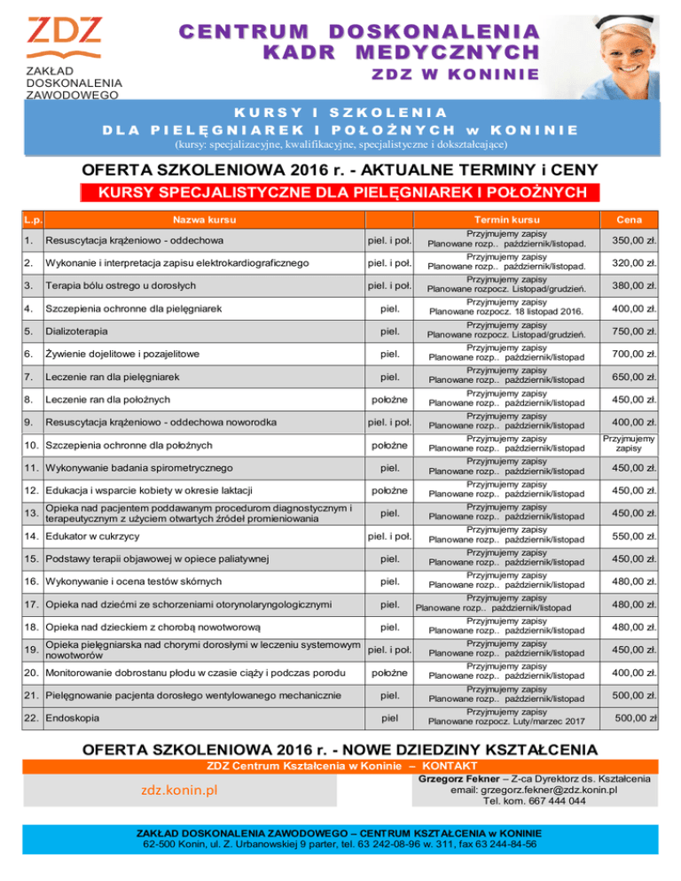 C E N T R U M D O SK O N A L EN I A K A D R M E D Y C ZN Y C H ZDZ W KONINIE ZAKŁAD DOSKONALENIA ZAWODOWEGO KURSY I SZKOLENI A DLA PI ELĘGNI AREK I POŁOŻNYCH w KONI NIE (kursy: specjalizacyjne, kwalifikacyjne, specjalistyczne i dokształcające) OFERTA SZKOLENIOWA 2016 r. - AKTUALNE TERMINY i CENY KURSY SPECJALISTYCZNE DLA PIELĘGNIAREK I POŁOŻNYCH L.p. Nazwa kursu Termin kursu Cena 1. Resuscytacja krążeniowo - oddechowa piel. i poł. Przyjmujemy zapisy Planowane rozp.. październik/listopad. 2. Wykonanie i interpretacja zapisu elektrokardiograficznego piel. i poł. Przyjmujemy zapisy Planowane rozp.. październik/listopad. 320,00 zł. 3. Terapia bólu ostrego u dorosłych piel. i poł. Przyjmujemy zapisy Planowane rozpocz. Listopad/grudzień. 380,00 zł. 400,00 zł. 350,00 zł. 4. Szczepienia ochronne dla pielęgniarek piel. Przyjmujemy zapisy Planowane rozpocz. 18 listopad 2016. 5. Dializoterapia piel. Przyjmujemy zapisy Planowane rozpocz. Listopad/grudzień. 750,00 zł. 6. Żywienie dojelitowe i pozajelitowe piel. Przyjmujemy zapisy Planowane rozp.. październik/listopad 700,00 zł. 7. Leczenie ran dla pielęgniarek piel. Przyjmujemy zapisy Planowane rozp.. październik/listopad 650,00 zł. 8. Leczenie ran dla położnych położne Przyjmujemy zapisy Planowane rozp.. październik/listopad 450,00 zł. 9. Resuscytacja krążeniowo - oddechowa noworodka piel. i poł. Przyjmujemy zapisy Planowane rozp.. październik/listopad 400,00 zł. położne Przyjmujemy zapisy Planowane rozp.. październik/listopad Przyjmujemy zapisy piel. Przyjmujemy zapisy Planowane rozp.. październik/listopad 450,00 zł. położne Przyjmujemy zapisy Planowane rozp.. październik/listopad 450,00 zł. piel. Przyjmujemy zapisy Planowane rozp.. październik/listopad 450,00 zł. piel. i poł. Przyjmujemy zapisy Planowane rozp.. październik/listopad 550,00 zł. 15. Podstawy terapii objawowej w opiece paliatywnej piel. Przyjmujemy zapisy Planowane rozp.. październik/listopad 450,00 zł. 16. Wykonywanie i ocena testów skórnych piel. Przyjmujemy zapisy Planowane rozp.. październik/listopad 480,00 zł. 17. Opieka nad dziećmi ze schorzeniami otorynolaryngologicznymi piel. 18. Opieka nad dzieckiem z chorobą nowotworową piel. 10. Szczepienia ochronne dla położnych 11. Wykonywanie badania spirometrycznego 12. Edukacja i wsparcie kobiety w okresie laktacji 13. Opieka nad pacjentem poddawanym procedurom diagnostycznym i terapeutycznym z użyciem otwartych źródeł promieniowania 14. Edukator w cukrzycy 19. Opieka pielęgniarska nad chorymi dorosłymi w leczeniu systemowym piel. i poł. nowotworów Przyjmujemy zapisy Planowane rozp.. październik/listopad 480,00 zł. Przyjmujemy zapisy Planowane rozp.. październik/listopad 480,00 zł. Przyjmujemy zapisy Planowane rozp.. październik/listopad 450,00 zł. 400,00 zł. 20. Monitorowanie dobrostanu płodu w czasie ciąży i podczas porodu położne Przyjmujemy zapisy Planowane rozp.. październik/listopad 21. Pielęgnowanie pacjenta dorosłego wentylowanego mechanicznie piel. Przyjmujemy zapisy Planowane rozp.. październik/listopad 500,00 zł. piel Przyjmujemy zapisy Planowane rozpocz. Luty/marzec 2017 500,00 zł 22. Endoskopia OFERTA SZKOLENIOWA 2016 r. - NOWE DZIEDZINY KSZTAŁCENIA ZDZ Centrum Kształcenia w Koninie – KONTAKT zdz.konin.pl Grzegorz Fekner – Z-ca Dyrektorz ds. Kształcenia email: [email protected] Tel. kom. 667 444 044 ZAKŁAD DOSKONALENIA ZAWODOWEGO – CENTRUM KSZTAŁCENIA w KONINIE 62-500 Konin, ul. Z. Urbanowskiej 9 parter, tel. 63 242-08-96 w. 311, fax 63 244-84-56 C E N T R U M D O SK O N A L EN I A K A D R M E D Y C ZN Y C H ZDZ W KONINIE ZAKŁAD DOSKONALENIA ZAWODOWEGO KURSY I SZKOLENI A DLA PI ELĘGNI AREK I POŁOŻNYCH w KONI NIE (kursy: specjalizacyjne, kwalifikacyjne, specjalistyczne i dokształcające) KURSY KWALIFIKACYJNE L.p. Dodatkowe wymagania kwalifikacyjne Nazwa kursu 1. Pielęgniarstwo anestezjologiczne i intensywnej opieki piel. RKO, EKG 2. Pielęgniarstwo kardiologiczne piel. RKO, EKG 3. Pielęgniarstwo nefrologiczne z dializoterapią piel. RKO 4. Pielęgniarstwo onkologiczne piel. ------- 5. Pielęgniarstwo w ochronie zdrowia pracujących piel. ------- 6. Pielęgniarstwo operacyjne poł. ------- 7. Pielęgniarstwo chirurgiczne piel. RKO, EKG 8. Pielęgniarstwo diabetologiczne piel. ------- 9. Pielęgniarstwo geriatryczne piel. LECZENIE RAN 10. Pielęgniarstwo internistyczne piel. RKO, EKG 11. Pielęgniarstwo neonatologiczne piel. ------- 12. Pielęgniarstwo neurologiczne piel. RKO 13. Pielęgniarstwo operacyjne piel. ------- 14. Pielęgniarstwo opieki długoterminowej piel. ------- 15. Pielęgniarstwo opieki paliatywnej piel. ------- 16. Pielęgniarstwo pediatryczne piel. RKO, EKG 17. Pielęgniarstwo psychiatryczne piel. ------- 18. Pielęgniarstwo ratunkowe piel. RKO, RKO noworodka 19. Pielęgniarstwo rodzinne piel. ------- 20. Pielęgniarstwo środowiska nauczania i wychowania piel. ------- 21. Pielęgniarstwo transplantacyjne piel. RKO, EKG, Przetaczanie krwi i preparatów krwiopochodnych 22. położnictwie i ginekologii poł. RKO, EKG 23. Pielęgniarstwo rodzinne poł. RKO, RKO noworodka 24. Pielęgniarstwo epidemiologiczne poł. i piel. ------- Pielęgniarstwo anestezjologiczne i intensywnej opieki w Termin kursu Cena* Przyjmujemy zapisy Planowane rozpocz. 09.2016 Przyjmujemy zapisy Planowane rozpocz-styczeń/luty2017 Przyjmujemy zapisy Planowane rozpocz-styczeń/luty2017 Przyjmujemy zapisy Planowane rozpocz-styczeń/luty2017 Przyjmujemy zapisy Planowane rozpocz-styczeń/luty2017 Przyjmujemy zapisy Planowane rozpocz-styczeń/luty2017 Przyjmujemy zapisy Planowane rozpocz-styczeń/luty2017 Przyjmujemy zapisy Planowane rozpocz-styczeń/luty2017 Przyjmujemy zapisy Planowane rozpocz-styczeń/luty2017 Przyjmujemy zapisy Planowane rozpocz-styczeń/luty2017 Przyjmujemy zapisy Planowane rozpocz-styczeń/luty2017 Przyjmujemy zapisy Planowane rozpocz-styczeń/luty2017 Przyjmujemy zapisy Planowane rozpocz-styczeń/luty2017 Przy
