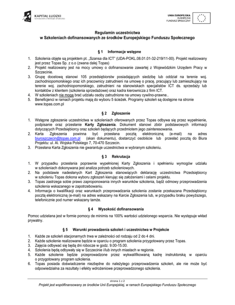 Regulamin uczestnictwa w Szkoleniach dofinansowanych ze środków Europejskiego Funduszu Społecznego §1 Informacje wstępne 1. Szkolenia objęte są projektem pt. „Szansa dla ICT” (UDA-POKL.08.01.01-32-219/11-00). Projekt realizowany jest przez Topas Sp. z o.o (zwana dalej Topas) 2. Projekt realizowany jest na mocy umowy o dofinansowanie zawartej z Wojewódzkim Urzędem Pracy w Szczecinie. 3. Grupę docelową stanowi 105 przedsiębiorstw posiadających siedzibę lub oddział na terenie woj. zachodniopomorskiego oraz ich pracownicy zatrudnieni na umowę o pracę, pracujący lub zamieszkujący na terenie woj. zachodniopomorskiego, zatrudnieni na stanowiskach specjalistów ICT ds. sprzedaży lub kontaktów z klientem (szkolenia sprzedażowe) oraz kadra kierownicza z firm ICT. 4. W szkoleniach nie mogą brać udziału osoby zatrudnione na umowy cywilno-prawne.. 5. Beneficjenci w ramach projektu mają do wyboru 5 ścieżek. Programy szkoleń są dostępne na stronie www.topas.com.pl §2 Zgłoszenie 1. Wstępne zgłoszenie uczestnictwa w szkoleniach oferowanych przez Topas odbywa się przez wypełnienie, podpisanie oraz przesłanie Karty Zgłoszenia. Dokument stanowi zbiór podstawowych informacji dotyczących Przedsiębiorcy oraz szkoleń będących przedmiotem jego zainteresowania. 2. Karta Zgłoszenia powinna być przesłana pocztą elektroniczną (e-mail) na adres [email protected] (skan dokumentu), dostarczyć osobiście lub przesłać pocztą do Biura Projektu: ul. Al. Wojska Polskiego 7, 70-470 Szczecin. 3. Przesłana Karta Zgłoszenia nie gwarantuje uczestnictwa w wybranym szkoleniu. §3 Rekrutacja 1. W przypadku przesłania poprawnie wypełnionej Karty Zgłoszenia i spełnieniu wymogów udziału w szkoleniach dokonywana jest analiza potrzeb szkoleniowych. 2. Na podstawie nadesłanych Kart Zgłoszenia stanowiących deklarację uczestnictwa Przedsiębiorcy w szkoleniu Topas dokona wyboru zgłoszeń kierując się założeniami i celami projektu. 3. Topas zastrzega sobie prawo zaproponowania innych warunków szkolenia, bądź odmowy przeprowadzenia szkolenia wskazanego w zapotrzebowaniu. 4. Informacja o kwalifikacji oraz warunkach przeprowadzania szkolenia zostanie przekazana Przedsiębiorcy pocztą elektroniczną (e-mail) na adres wskazany na Karcie Zgłoszenia lub, w przypadku braku powyższego, telefonicznie pod numer wskazany tamże. §4 Wysokość dofinansowania Pomoc udzielana jest w formie pomocy de minimis na 100% wartości udzielonego wsparcia. Nie występuje wkład prywatny. §5 Warunki prowadzenia szkoleń i uczestnictwa w Projekcie 1. 2. 3. 4. 5. Każde ze szkoleń stacjonarnych trwa w zależności od rodzaju od 2 do 4 dni. Każde szkolenie realizowane będzie w oparciu o program szkolenia przygotowany przez Topas. Zajęcia odbywać się będą dni robocze w godz. 9.00-15.00. Szkolenia będą odbywały się w Szczecinie i/lub innych miastach w regionie. Każde szkolenie będzie przeprowadzone przez wykwalifikowaną kadrę instruktorską w oparciu o przygotowany program szkolenia. 6. Topas posiada doświadczenie niezbędne do należytego przeprowadzenia szkoleń, ale nie może być odpowiedzialna za rezultaty i efekty wdrożeniowe przeprowadzonego szkolenia. strona 1 z 2 Projekt jest współfinansowany ze środków Unii Europejskiej, w ramach Europejskiego Funduszu Społecznego 7. Uczestnik szkolenia otrzymuje materiały szkoleniowe adekwatne do szkolenia, które stają się jego własnością po zakończeniu udziału w szkoleniu. 8. Topas zapewnia Uczestnikom szkolenia catering w postaci: ciepłych i zimnych napojów oraz obiadu. 9. Uczestnik zobowiązany jest do punktualnego przybycia na szkolenie każdego dnia szkolenia. 10. Uczestnik zobowiązany jest do udziału w zajęciach zgodnie z harmonogramem szkolenia i potwierdzanego codziennie osobistym podpisem na liście obecności. Topas nie odpowiada za obecność Uczestnika na Szkoleniu. 11. Uczestnik jest zobowiązany do wypełnienia kwestionariusza ankietowego przed i po Szkoleniu oraz do udziału w badaniu ewaluacyjnym w ciągu 2 (dwóch) miesięcy po zakończeniu szkolenia. 12. Warunkiem otrzymania zaświadczenia o ukończeniu szkolenia jest uczestnictwo w min. 80% zajęć. 13. Pracownik Przedsiębiorcy jest zobowiązany do udziału w minimum 2 z 5 dostępnych szkoleń, wybierając jeden z tematów w ramach ścieżki. 14. Przedsiębiorca jest zobowiązany do wydelegowania co najmniej jednego pracownika przedsiębiorstwa na szkolenie pt. „Zarządzanie zespołem i antydyskryminacja płci”. 15. Przedsiębiorca jest zobowiązany do wydelegowania co najmniej jednego pracownika przedsiębiorstwa do udziału w seminarium z zakresu zastosowania i wdrażania coachingu w firmach ICT. §6 Zmiana terminu Szkolenia 1. Przedsiębiorca może zaproponować zmianę terminu każdego Szkolenia, jak również danych uczestników bez ponoszenia żadnych kosztów najpóźniej na 15 dni przed rozpoczęciem Szkolenia. 2. Topas jest uprawniona do odwołania lub zmiany terminu Szkolenia bez ponoszenia z tego tytułu żadnych koszów, nie później niż na 3 dni przed dniem jego rozpoczęcia, w przypadku wystąpienia poważnych problemów natury organizacyjnej i/lub technicznej, powodujących, że przeprowadzenie Szkolenia okaże się niemożliwe lub znacząco utrudnione. Dotyczy to w szczególności sytuacji odwołania Szkolenia spowodowanej brakiem zgody organów kontrolnych na jego przeprowadzenie. 3. Informacja o odwołaniu Szkolenia wymaga formy pisemnej (fax) lub elektronicznej i powinna być skierowana do Osoby ds. kontaktów ze strony Przedsiębiorcy. 4. W przypadku rezygnacji ze Szkolenia z naruszeniem terminu, o którym mowa w ust 1, Przedsiębiorca jest zobowiązany na wezwanie Topas do pokrycia kosztów odwołania uczestnictwa w Szkoleniu. 5. W szczególnych sytuacjach losowych (np. choroba) osoby zakwalifikowane do udziału w Projekcie mają prawo rezygnacji z uczestnictwa w szkoleniu po złożeniu pisemnego oświadczenia o 