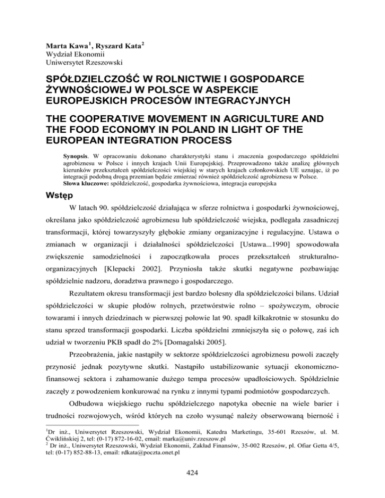 Marta Kawa 1 , Ryszard Kata 2 Wydział Ekonomii Uniwersytet Rzeszowski SPÓŁDZIELCZOŚĆ W ROLNICTWIE I GOSPODARCE ŻYWNOŚCIOWEJ W POLSCE W ASPEKCIE EUROPEJSKICH PROCESÓW INTEGRACYJNYCH THE COOPERATIVE MOVEMENT IN AGRICULTURE AND THE FOOD ECONOMY IN POLAND IN LIGHT OF THE EUROPEAN INTEGRATION PROCESS Synopsis. W opracowaniu dokonano charakterystyki stanu i znaczenia gospodarczego spółdzielni agrobiznesu w Polsce i innych krajach Unii Europejskiej. Przeprowadzono także analizę głównych kierunków przekształceń spółdzielczości wiejskiej w starych krajach członkowskich UE uznając, iż po integracji podobną drogą przemian będzie zmierzać również spółdzielczość agrobiznesu w Polsce. Słowa kluczowe: spółdzielczość, gospodarka żywnościowa, integracja europejska Wstęp W latach 90. spółdzielczość działająca w sferze rolnictwa i gospodarki żywnościowej, określana jako spółdzielczość agrobiznesu lub spółdzielczość wiejska, podlegała zasadniczej transformacji, której towarzyszyły głębokie zmiany organizacyjne i regulacyjne. Ustawa o zmianach w organizacji i działalności spółdzielczości [Ustawa...1990] spowodowała zwiększenie samodzielności i zapoczątkowała proces przekształceń strukturalno- organizacyjnych [Klepacki 2002]. Przyniosła także skutki negatywne pozbawiając spółdzielnie nadzoru, doradztwa prawnego i gospodarczego. Rezultatem okresu transformacji jest bardzo bolesny dla spółdzielczości bilans. Udział spółdzielczości w skupie płodów rolnych, przetwórstwie rolno – spożywczym, obrocie towarami i innych dziedzinach w pierwszej połowie lat 90. spadł kilkakrotnie w stosunku do stanu sprzed transformacji gospodarki. Liczba spółdzielni zmniejszyła się o połowę, zaś ich udział w tworzeniu PKB spadł do 2% [Domagalski 2005]. Przeobrażenia, jakie nastąpiły w sektorze spółdzielczości agrobiznesu powoli zaczęły przynosić jednak pozytywne skutki. Nastąpiło ustabilizowanie sytuacji ekonomicznofinansowej sektora i zahamowanie dużego tempa procesów upadłościowych. Spółdzielnie zaczęły z powodzeniem konkurować na rynku z innymi typami podmiotów gospodarczych. Odbudowa wiejskiego ruchu spółdzielczego napotyka obecnie na wiele barier i trudności rozwojowych, wśród których na czoło wysunąć należy obserwowaną bierność i 1 Dr inż., Uniwersytet Rzeszowski, Wydział Ekonomii, Katedra Marketingu, 35-601 Rzeszów, ul. M. Ćwiklińskiej 2, tel: (0-17) 872-16-02, email: [email protected] 2 Dr inż., Uniwersytet Rzeszowski, Wydział Ekonomii, Zakład Finansów, 35-002 Rzeszów, pl. Ofiar Getta 4/5, tel: (0-17) 852-88-13, email: [email protected] 424 niechęć mieszkańców wsi do zespołowych form gospodarowania oraz brak wzorów efektywnie działających spółdzielni w świadomości społecznej wsi [Lewczuk 2002]. Spółdzielczość w agrobiznesie ma do wykonania wiele funkcji i zadań, które nawet w warunkach gospodarki rynkowej nie są możliwe do zastąpienia przez inne podmioty gospodarcze, jednostki i struktury organizacyjne. Współczesny sektor żywnościowy i wielofunkcyjna wieś wymagają przede wszystkim dobrze zorganizowanej spółdzielczości bankowej, spółdzielni handlowych, spółdzielni zaopatrzenia i zbytu oraz wyspecjalizowanych spółdzielni przetwórstwa rolno – spożywczego, a nawet spółdzielni turystyczno – wypoczynkowych. Przystąpienie Polski do Unii Europejskiej, które miało miejsce w maju 2004 r. zmieniło warunki funkcjonowania rolnictwa i jego otoczenia, otwierając także nowe możliwości rozwoju dla spółdzielczości wiejskiej. Aby sprostać konkurencji na wspólnym europejskim rynku, a także wykorzystać możliwości wynikające z integracji, rodzima spółdzielczość musi być do tego dobrze przygotowana. Nie może powtórzyć błędów z okresu transformacji gospodarki, kiedy zaniechanie lub zbyt wolne wprowadzanie przekształceń dostosowujących spółdzielnie do nowych warunków rynkowych, skutkowało dotkliwymi stratami jakie poniosła spółdzielczość wiejska. Przedmiotem opracowania jest ukazanie stanu spółdzielczości agrobiznesu w Polsce i jej porównanie z innymi krajami Unii Europejskiej. Celem takiej analizy jest określenie znaczenia spółdzielczości w strukturach rolnictwa i gospodarce żywnościowej, a także próba określenia kierunków rozwoju polskich spółdzielni agrobiznesu w poszerzonej Europie. Stan spółdzielczości agrobiznesu po przystąpieniu Polski do Unii Europejskiej Spółdzielczość w agrobiznesie obejmuje różnego rodzaju spółdzielnie, dostosowane w swojej działalności do szczególnych cech sektora żywnościowego oraz środowiska wiejskiego i mające na celu zaspokojenie ekonomicznych potrzeb rolników i mieszkańców wsi. Na koniec 2004 roku, zarejestrowanych było w Polsce ponad 4.251 spółdzielni wiejskich różnego typu, co oznacza, że funkcjonowało ich prawie dwukrotnie mniej niż w roku 1988. Co prawda niewielki wzrost liczby spółdzielni zanotowano na początku lat 90. lecz było to spowodowane podziałami dużych spółdzielni na mniejsze podmioty. Od roku 1994 notowany jest sukcesywny spadek liczby spółdzielni działających na wsi i na rzecz wsi i rolnictwa. Nie przekreśla to jednak faktu, że spółdzielnie wciąż pełnią istotną rolę w obsłudze tej sfery gospodarki oraz w wielofunkcyjnym rozwoju obszarów wiejskich (tab. 1). Są one 425 często jedynymi znaczącymi podmiotami działającymi na terenie gminy, powiatu czy kilku powiatów, zajmującymi się skupem i przetwórstwem płodów rolnych, usługami na rzecz rolnictwa, czy też obsługą finansową i kredytowaniem gospodarstw rolniczych. Ich atutem jest znajomość problemów wsi i rolnictwa, doświadczenie w ich obsłudze oraz duża asymilacja ze środowiskiem lokalnym, w którym funkcjonują. Tabela 1. Liczba spółdzielni agrobiznesu w Polsce według branż w latach 1988 – 2004 Table 1. The number of agribusines