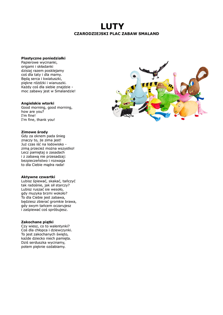 LUTY CZARODZIEJSKI PLAC ZABAW SMALAND Plastyczne poniedziałki Papierowe wycinanki, origami i składanki dzisiaj razem posklejamy coś dla taty i dla mamy. Będą serca i kwiatuszki, piękne różdżki i wianuszki. Każdy coś dla siebie znajdzie moc zabawy jest w Smalandzie! Angielskie wtorki Good morning, good morning, how are you? I'm fine! I'm fine, thank you! Zimowe środy Gdy za oknem pada śnieg znaczy to, że zima jest! Już czas iść na lodowisko zimą przecież można wszystko! Lecz pamiętaj o zasadach i z zabawą nie przesadzaj: bezpieczeństwo i rozwaga to dla Ciebie mądra rada! Aktywne czwartki Lubisz śpiewać, skakać, tańczyć tak radośnie, jak sił starczy? Lubisz ruszać sie wesoło, gdy muzyka brzmi wokoło? To dla Ciebie jest zabawa, będziesz zbierać gromkie brawa, gdy swym tańcem oczarujesz i zaśpiewać coś spróbujesz. Zakochane piątki Czy wiesz, co to walentynki? Coś dla chłopca i dziewczynki. To jest zakochanych święto, każde dziecko niech pamięta. Dziś serduszka wycinamy, potem pięknie ozdabiamy.