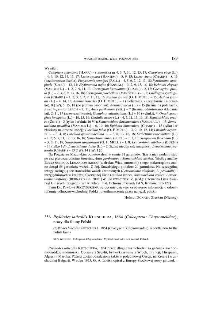 WIAD. ENTOMOL., 22 (3): POZNAŃ 2003 189 Wy n i k i : Calopteryx splendens (HARR.) – stanowiska nr 4, 6, 7, 10, 12, 15, 17; Calopteryx virgo (L.) – 4, 6, 10, 12, 14, 15, 17; Lestes sponsa (HANSEM.) – 8, 9, 13; Lestes virens (CHARP.) – 8, 13 (każdorazowo licznie); Platycnemis pennipes (PALL.) – 4, 5, 6, 7, 12, 13, 18; Pyrrhosoma nymphula (SULZ.) – 12, 14; Erythromma najas (HANSEM .) – 3, 7, 9, 13, 16, 18; Ischnura elegans (VANDER L.) – 1, 2, 7, 9, 11, 13; Coenagrion hastulatum (CHARP.) – 2, 13; Coenagrion puella (L.) – 2, 3, 8, 9, 13, 16, 18; Coenagrion pulchellum (VANDER L.) – 1, 2; Enallagma cyathigerum (CHARP.) – 1, 2, 3, 5, 7, 9, 11, 12, 16; Aeshna cyanea (O. F. MÜLL.) – 15; Aeshna grandis (L.) – 4, 14, 15; Aeshna isosceles (O. F. MÜLL.) – 1 (nielicznie), 7 (regularnie i nierzadko), 8 (1%), 5, 15, 18 (po jednym osobniku); Aeshna juncea (L.) – 15 (licznie na polanach); Anax imperator LEACH – 7, 11; Anax parthenope (SÉL.) – 7 (licznie, odnotowano składanie jaj), 2, 11, 15 (zazwyczaj licznie); Gomphus vulgatissimus (L.) – 10 (wylinki), 4; Onychogomphus forcipatus (L.) – 10, 15, 16; Cordulia aenea (L.) – 4, 7, 11, 15, 16, 18; Somatochlora arctica (ZETT.) – 3 (tylko 1 % dnia 16 VI); Somatochlora flavomaculata (VANDER L.) – 15; Somatochlora metallica (VANDER L.) – 6, 10, 16; Epitheca bimaculata (CHARP.) – 15 (tylko 1% złowiony na drodze leśnej); Libellula fulva (O. F. MÜLL.) – 3, 9, 10, 12, 14; Libellula depressa L. – 3, 4, 8; Libellula quadrimaculata L. – 3, 8, 13, 16, 18; Orthetrum cancellatum (L.) – 1, 2, 5, 7, 11, 12, 13, 16, 18; Sympetrum danae (SULZ.) – 1, 3, 13; Sympetrum flaveolum (L.) – 3, 8, 11, 18; Sympetrum sanguineum (O. F. MÜLL.) – 1, 8; Leucorrhinia albifrons (B URM.) – 16 (tylko 1%); Leucorrhinia dubia (L.) – 2 (liczne niedojrzałe imagines); Leucorrhinia pectoralis (CHARP.) – 13 (1%), 14 (1%, 1&). Na Pojezierzu Mazurskim odnotowałem w sumie 31 gatunków. Trzy z nich podano stąd po raz pierwszy: Aeshna isosceles, Anax parthenope i Somatochlora arctica. Według analizy BUCZYŃSKIEGO , LEWANDOWSKIEGO (w druku: Wiad. entomol.) z tego makroregionu znano dotąd 55 gatunków ważek. Z Poj. Suwalskiego podałem 20 gatunków. Na szczególną uwagę zasługują też stanowiska ważek chronionych (Leucorrhinia albifrons, L. pectoralis) i uwzględnionych w krajowej Czerwonej liście (Aeshna juncea, Somatochlora arctica, Leucorrhinia albifrons) (B ERNARD i in. 2002: [W:] GŁOWACIŃSKI Z. (red.): Czerwona Lista Zwierząt Ginących i Zagrożonych w Polsce. Inst. Ochrony Przyrody PAN, Kraków: 125-127). Panu Dr. Pawłowi B UCZYŃSKIEMU serdecznie dziękuję za obszerne informacje o odonatofaunie północno-wschodniej Polski i przetłumaczenie pracy na język polski. Helmut D ONATH, Zieckau (Niemcy) 356. Psylliodes laticollis K UTSCHERA, 1864 (Coleoptera: Chrysomelidae), nowy dla fauny Polski Psylliodes laticollis KUTSCHERA , 1864 (Coleoptera: Chrysomelidae), a beetle new to the Polish fauna KEY WORDS: Coleoptera, Chrysomelidae, Psylliodes laticollis, new record, Poland. Psylliodes laticollis K UTSCHERA, 1864 przez długi czas uchodził za gatunek zachodnio-śródziemnomorski. Opisany z Sycylii, był wykazywany z Włoch, Francji, Hiszpanii, Algierii i Maroka. Później został odnaleziony także w południowej Grecji, na Krecie i w zachodniej Bułgarii. W roku 1955, G. A. LOHSE opisał z Europy Środkowej nowy gatunek – 190 KRÓTKIE DONIESIENIA Psylliodes weberi LOHSE , 1955. Wkrótce został on wykazany z licznych stanowisk w Niemczech, zwłaszcza w ich zachodniej części, krajach Beneluxu i południowej Anglii. W roku 1995, M. DOEBERL zwrócił uwagę, że śródziemnomorski P. laticollis KUTSCH. i środkowoeuropejski P. weberi LOHSE są w zasadzie identyczne i dokonał ich formalnej synonimizacji. Już pod nazwą P. laticollis gatunek ten został podany z Frankfurtu nad Odrą i Słowacji, w obu przypadkach tuż przy granicy z Polską. Występowanie tego gatunku w Polsce wydało się więc bardzo prawdopodobne, co potwierdzone zostało odnalezieniem go w południowo-zachodniej części kraju: – Dolny Śląsk, rezerwat „Zimna Woda” ad Legnica, 16 V 1992, 2 exx., leg, L. BOROWIEC . Wydaje się, że P. laticollis jest w ekspansji z refugium śródziemnomorskiego. Świadczy o tym fakt, że stanowiska środkowoeuropejskie oparte są w większości o materiały z ostatnich 50 lat, a w miejscu występowania gatunek ten zwykle jest poławiany w licznych okazach. Z uwagi na jego rzucającą się w oczy wielkość i łatwość odróżnienia od pospolitego P. napi (FABR .) trudno przypuszczać, aby w przeszłości został on przeoczony. Poza tym, w starych zbiorach jest on bardzo rzadko reprezentowany. P. laticollis troficznie jest związany z rukwią wodną – Nasturtium officinale R. BR. i łowiony bywa na brzegach cieków wodnych i podmokłych łąkach. W rezerwacie „Zimna Woda” został wyczerpakowany z rukwii rosnącej wzdłuż potoku Zimna Woda. Gatunek nowy dla fauny Polski. Lech BOROWIEC , Inst. Zool. UWr, Wrocław 357. Nowe stanowiska Nycteribia (N.) kolenatii THEODOR et MOSCONA , 1954 (Diptera, Pupipara: Nycteribiidae) w Polsce New localities of Nycteribia (N.) kolenatii THEODOR et M OSCONA, 1954 (Diptera, Pupipara: Nycteribiidae) in Poland KEY WORDS: Diptera, Nycteribiidae, Nycteribia kolenatii, new localities, Poland. Nycteribia (N.) kolenatii THEODOR et MOSCONA, 1954 – Zwierzyniec FB30 (woj. lubelskie, pow. zamojski), park Technikum Leśnego, 20 VII 1987, 1% – na % Myotis daubentonii (KUHL ), leg. M. JURCZYSZYN, det. A. NOWOSAD. – Topólcza FB31 (woj. lubelskie, pow. zamojski), nad rzeką, 4 VII 1989, 2&& – na % Myotis daubentonii, leg. M. JURCZYSZYN, det. A. NOWOSAD. – Wojcieszów Górny WS64 (woj. dolnośląskie, pow. złotoryjski), Jaskinia Północna, 21 II 1988, 1& – na & Myotis daubentonii, leg. et det. A. NOWOSAD. – Jezioro Jaczno FF21 (woj. podlaskie, pow. suwalski), nad k