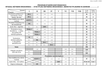 Zał. nr 1 do ZW 11/2012 PROGRAM STUDIÓW DOKTORANCKICH WYDZIAŁ INŻYNIERII ŚRODOWISKA – DYSCYPLINA INŻYNIERIA ŚRODOWISKA (INERDYSCYPLINARNE W ZAKRESIE ……………) Semestr Program Przedmioty podstawowe – matematyka, fizyka, chemia, lub inne Kurs dydaktyczny szkoły wyższej Przedmiot humanistyczny lub menadżerski Język obcy - angielski Wydziałowe kursy kierunkowe – w danej dyscyplinie lub interdyscyplinarne Seminarium interdyscyplinarne, w dyscyplinie, specjalistyczne Liczba godzin Punkty ECTS → → 30 6 30 6 → → 60 10 → → → 30 3 ← → SJO 90 6 30 6 30 6 30 6 15 1 15 1 15 1 15 390 1 53 I II III IV PP-1 PP-2 → → → → KDSW-1 → PH ← WKK-1 ← ← SS-1 → → → → → → → ← SS-2 → ← ← ← ← ← WKK-2 SI → ← ← ← SK WKK-3 → → → → → V VI VII Suma Praktyki zawodowe (90 h lub 30 h) ← ← → → → ← ← ← → → → → → → VIII 120 ÷ 360 Przedmioty nadobowiązkowe Kurs dydaktyczny szkoły wyższej Język obcy – do wyboru Zajęcia ewaluacyjne KDSW-2 ZE → ← → → ← → → SJO → 45 4 30 lub 60 2 lub 3 5 PROGRAM STUDIÓW DOKTORANCKICH WYDZIAŁ INŻYNIERII ŚRODOWISKA – DYSCYPLINA INŻYNIERIA ŚRODOWISKA (INERDYSCYPLINARNE W ZAKRESIE ……………) OBJĘTE PROGRAMEM STUDIÓW WYKAZANE W TABELI RODZAJE ZAJĘĆ DOKTORANCI WYBIERAJĄ SPOŚRÓD GRUP KURSÓW: PRZEDMIOTY PODSTAWOWE [PP] – kursy fakultatywne, realizowane przez wydziały – łącznie 60 godzin PP-1 1) 2) 3) 4) Odpylanie i odsiarczanie spalin kotłowych w energetyce Ograniczenie emisji CO2 do atmosfery Nowoczesne zintegrowane systemy HVAC i osiągnięcia I3CON lub z oferty proponowanej przez studium – zatwierdzony przez opiekuna naukowego i Kierownika Studiów Doktoranckich 30 h 30 h 30 h …………………………………………………………………………………………………………… …………………………………………………………………………………………………………… …………………………………………………………………………………………………………… …………………………………………………………………………………………………………… 30 h 30 h 30 h 30 h 30 h PP-2 1) 2) 3) 4) KURS DYDAKTYCZNY SZKOŁY WYŻSZEJ [KDSW] – blok tematycznych kursów fakultatywnych – łącznie 60 godzin: KDSW-1 Kurs dydaktyczny szkoły wyższej, część I – realizowany w Studium Nauk Humanistycznych 60 h PRZEDMIOT HUMANISTYCZNY LUB MENADŻERSKI [PH, PM] – kurs fakultatywny – 30 godzin: PH [PM] – realizowane przez Studium Nauk Humanistycznych lub wydziały 1) Cywilizacja a środowisko 2) Systemy zarzadzania środowiskowego 3) lub z oferty proponowanej przez studium – zatwierdzony przez opiekuna naukowego i Kierownika Studiów Doktoranckich 4) …………………………………………………………………………………………………………… 5) ……………………………………………………………………………………………………………. 6) …………………………………………………………………………………………………………… 7) …………………………………………………………………………………………………………… 30 h 30 h 30 h 30 h 30 h 30 h 30 h PROGRAM STUDIÓW DOKTORANCKICH WYDZIAŁ INŻYNIERII ŚRODOWISKA – DYSCYPLINA INŻYNIERIA ŚRODOWISKA (INERDYSCYPLINARNE W ZAKRESIE ……………) JĘZYK OBCY NOWOŻYTNY – JĘZYK ANGIELSKI [SJO] – kurs obowiązkowy – 90 godzin: SJO kurs na poziomie co najmniej B2 realizowany w Studium Języków Obcych, zakończony egzaminem 90h WYDZIAŁOWE KURSY KIERUNKOWE W DYSCYPLINIE STUDIÓW DOKTORANCKICH LUB INTERDYSCYPLINARNE W ZAKRESIE INTERDYSCYPLINARNYCH STUDIÓW DOKTORANCKICH [WKK] – kursy fakultatywne, realizowane przez wydziały – łącznie 90 godzin WKK-1 1) Biodegradable materials 2) Materiały biodegradowalne 3) Modern plastics 4)Procesy membranowe w ochronie środowiska lub z oferty proponowanej przez studium – zatwierdzony przez opiekuna naukowego i Kierownika Studiów Doktoranckich 30 h 30 h 30 h 30 h 1) Niekonwencjonalne źródła energii 2) Niezawodność i bezpieczeństwo systemów komunalnych 3) Ochrona przyrody 4) Podstawy meteorologii i klimatologii lub z oferty proponowanej przez studium – zatwierdzony przez opiekuna naukowego i Kierownika Studiów Doktoranckich 30 h 30 h 30 h 30 h 1) Odnawialne Źródła energii a ochrona środowiska 2) Plastics waste menagement 3) Podstawy biotechnologii środowiska 4) lub z oferty proponowanej przez studium – zatwierdzony przez opiekuna naukowego i Kierownika Studiów Doktoranckich 30 h 30 h 30 h WKK-2 WKK-3 30 h PROGRAM STUDIÓW DOKTORANCKICH WYDZIAŁ INŻYNIERII ŚRODOWISKA – DYSCYPLINA INŻYNIERIA ŚRODOWISKA (INERDYSCYPLINARNE W ZAKRESIE ……………) SEMINARIA INTERDYSCYPLINARNE [SI], SPECJALISTYCZNE [SS], KIERUNKOWE [SK] – fakultatywne po 15 godzin lub 2 razy po 15 godzin w semestrze, realizowane przez wydziały – łącznie 90 godzin: 1) 2) 3) 4) SI [SK, SS] Interdyscyplinarne problemy w inżynierii środowiska lub inne proponowane przez studium SK [SI, SS] ………………………………………………………………………………………………… SS-1 [SI, SK] …………………………………………………………………………………………….… SS-2 [SI, SK] …………………………………………………………………………………………….… 15h 15h 15h 15h PRAKTYKI ZAWODOWE – w formie zajęć dydaktycznych prowadzonych samodzielnie przez doktoranta lub na zasadzie uczestniczenia w ich prowadzeniu – studia stacjonarne: po 90 godzin w każdym roku akademickim, w którym doktorant otrzymuje stypendium doktoranckie, albo po 30 godzin w każdym roku akademickim, w którym doktorant nie