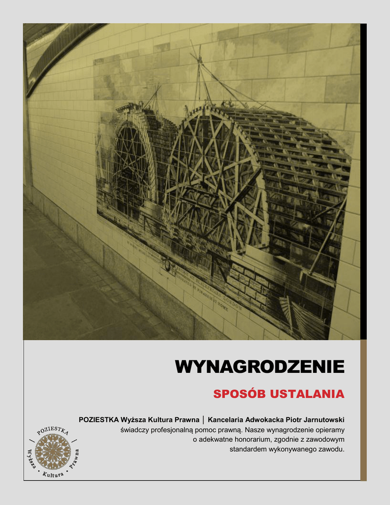 WYNAGRODZENIE SPOSÓB USTALANIA POZIESTKA Wyższa Kultura Prawna │ Kancelaria Adwokacka Piotr Jarnutowski świadczy profesjonalną pomoc prawną. Nasze wynagrodzenie opieramy o adekwatne honorarium, zgodnie z zawodowym standardem wykonywanego zawodu. WYNAGRODZENIE CZYNNIKI KSZTAŁTUJĄCE SPECYFIKA Kancelaria Adwokacka │ Poziestka Wyższa Kultura Prawna świadczy profesjonalną pomoc prawną. Najwyższym cenionym przez nas dobrem jest zadowolenie Klientów. Aby spełnić oczekiwania naszych Zleceniodawców, częstokroć musimy wykonać szereg czynności, wymagających od nas odpowiedzialności, wiedzy, kreatywnych pomysłów oraz systematycznych działań. Celem zagwarantowania ochrony praw naszych Klientów musimy poświęcić wiele godzin pracy. Niekiedy nawet dni. Szanujemy jednak czas oraz związane z nim koszty. Dlatego usługi prawne świadczone są w terminie uzgodnionym z Klientem niezwłocznie, w ramach możliwości Kancelarii. Przede wszystkim w sposób pozwalający uniknąć nieuzasadnionych kosztów. Wynagrodzenie stosowane przez Kancelarię za pracę uzależnione jest od szeregu czynników, jak: [WPISZ TYTUŁ PASKA] [Wpisz zawartość HONOpaska bocznego. Pasek boczny jest RARIUM niezależnym Najważniejsze jest dodatkiem do zadowolenie naszych dokumentu głównego. Klientów. Szanując Jest często czas i związane z nim wyrównany do lewej koszty honorarium lub prawej części opieramy o adekwatne strony albo wynagrodzenie. 1. specyfika oraz rodzaj zleconej sprawy, umieszczony na górze 2. stopnia skomplikowania i etapu sprawy, lub na dole strony. 3. wymaganego nakładu pracy, Użyj karty Narzędzia 4. czasu niezbędnego do wykonania zlecenia. do rysowania, aby ROZLICZENIE Naszym standardem działania jest otwarta i rzeczowa komunikacja z Klientem w zakresie wszelkich rozliczeń. Dlatego Zleceniodawca informowany jest na spotkaniu o wszelkich opłatach związanych ze sprawą, ale również i tych, które mogą ewentualnie powstać w związku z rozwojem sporu. Dzięki temu można na wstępnym etapie dokonać optymalizacji kosztów usług racjonalizując działania prawne lub stosując określoną procedurę (o ile jest możliwa w danym przypadku). Wynagrodzenie za wykonane świadczenie każdorazowo ustalane jest z Klientem w sposób przejrzysty i zrozumiały. Umożliwiony jest elastyczny sposób uiszczenia należnego Kancelarii wynagrodzenia za obsługę prawną. Z uwagi na specyfikę poszczególnych spraw lub intensywność obsługi prawnej proponujemy naszym Klientom wycenę KANCELARIA ADWOKACKA PIOTR JARNUTOWSKI │ ul. B. Prusa 13, 07-417 Ostrołęka |T. +48 29 642 99 91|T. +48 22 398 35 85| F. +48 22 398 46 80| |e-mail: [email protected]|www.kancelaria-ostroleka.pl| zmienić formatowanie 2 poszczególnych czynności, stawkę godzinową w ramach zlecenia lub ryczałt. Możliwy jest również system wynagradzania o stawki ryczałtowo-godzinowe. WYNAGRODZENIE RYCZAŁTOWE Wynagrodzenie ryczałtowe obejmuje jednorazową opłatę za wykonaną usługę prawną. Klient zawiera z Kancelarią umowę, w której określony jest zakres czynności. Wartość ustalana jest w zależności od nakładu pracy, bez wpływu na czas trwania usługi. Wynagrodzenie w tej formie kierowane jest do Klientów korzystających ze stałej obsługi prawnej Kancelarii (w ramach ustalonego limitu godzin), ale również do podmiotów indywidualnych za poszczególną usługę. Stała obsługa polega na świadczeniu określonej w umowie z Klientem kompleksowej usługi prawnej za stałym miesięcznym wynagrodzeniem. Dla osób indywidualnych opłata ryczałtowa stosowana jest za jednorazowe zlecenie. STAWKA GODZINOWA Stawka godzinowa – honorarium obliczane jest poprzez pomnożenie ilości godzin, z których skorzystał dany podmiot, przez wartość godzinnej pracy prawnika Kancelarii. Oferta ta skierowana jest do kontrahentów Kancelarii, którym pomoc prawna niezbędna jest w nieokreślonym wymiarze godzin. Klienci korzystający z tej formy obsługi otrzymują fakturę za każdy okres rozliczeniowy z uwzględnieniem ilości godzin wraz z wykazem wykonanych na ich rzecz czynności. SYSTEM MIESZANY Stawki ryczałtowo-godzinowe (system mieszany) – polega na korzystaniu przez podmioty posiadające stałą obsługę prawną (system ryczałtowy) z dodatkowych świadczeń, rozliczanych za pomocą stawki godzinowej. Sytuacja ta ma miejsce głównie po wyczerpaniu limitu ustalonych w umowie godzin, w ramach których Klienci mają zagwarantowane świadczenie na ich rzecz usług. W tej sytuacji wartość stawki godzinowej ulega odpowiedniemu zmniejszeniu. WYNAGRODZENIE ZA SUKCES Wynagrodzenie za sukces (Success fee) – honorarium należne w wypadku osiągnięcia określonego rezultatu w prowadzonej sprawie. Wynagrodzenie to głównie stosowane jest przez Kancelarię w sprawach odszkodowawczych i windykacyjnych obok wynagrodzenia ryczałtowego. Polega na określeniu procentowej należności od KANCELARIA ADWOKACKA PIOTR JARNUTOWSKI │ ul. B. Prusa 13, 07-417 Ostrołęka |T. +48 29 642 99 91|T. +48 22 398 35 85| F. +48 22 398 46 80| |e-mail: [email protected]|www.kancelaria-ostroleka.pl| SYSTEM WYNAGRADZANIA Proponujemy naszym Klientom wycenę poszczególnych czynności, stawkę godzinową w ramach zlecenia lub ryczał. Możliwy jest także system mieszany, oparty o stawki ryczałtowo – godzinowe. 3 zsądzonej lub ściągniętej kwoty albo na dodatkowym, ściśle ustalonym indywidualnie z Klientem dodatkowym wynagrodzeniu. OFERTA DLA PRZEDSIĘBIORCÓW Dla podmiotów prowadzących działalność gospodarczą przygotowane w Ofercie Kancelarii specjalne pakiety dla firm. zostały Pakiet tele-informatyczny – wykupione 3 godziny w tygodniu lub miesiącu za obsługę teleinformatyczną (mail/telefon). Pakiet standardowy – usługi świadczone w pakiecie zdalnym w wymiarze 6 godzin w miesiącu lub tygodniu oraz możliwość skorzystania z dodatkowych 2 godzin pomocy prawnej w miesiącu w siedzibie Klienta lub w i