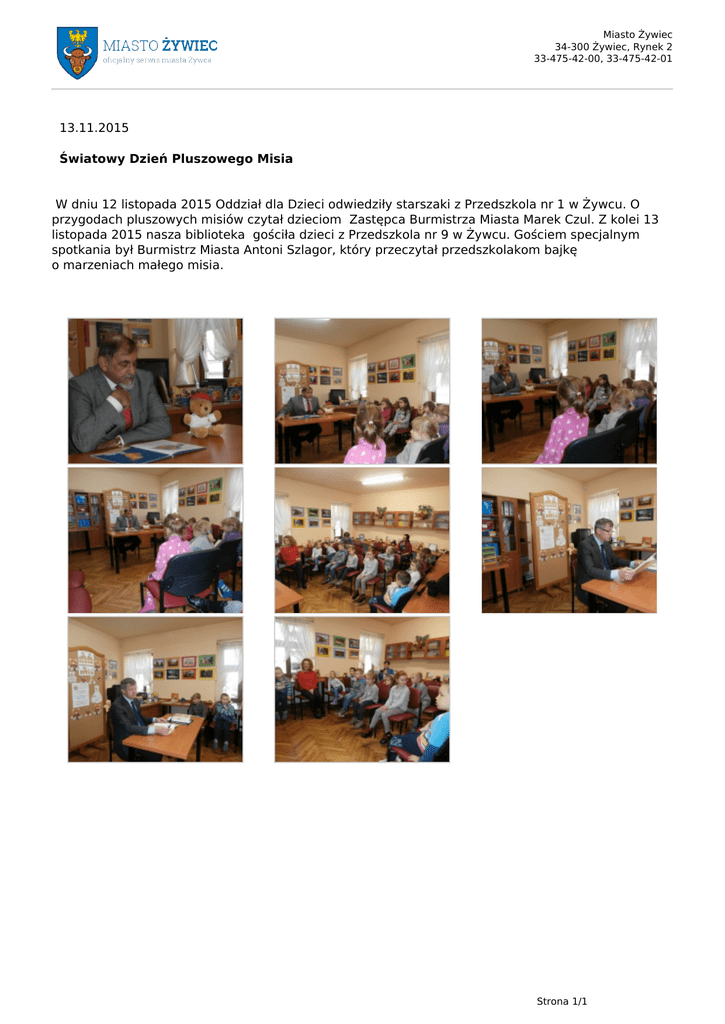 Miasto Żywiec 34-300 Żywiec, Rynek 2 33-475-42-00, 33-475-42-01 13.11.2015 Światowy Dzień Pluszowego Misia W dniu 12 listopada 2015 Oddział dla Dzieci odwiedziły starszaki z Przedszkola nr 1 w Żywcu. O przygodach pluszowych misiów czytał dzieciom Zastępca Burmistrza Miasta Marek Czul. Z kolei 13 listopada 2015 nasza biblioteka gościła dzieci z Przedszkola nr 9 w Żywcu. Gościem specjalnym spotkania był Burmistrz Miasta Antoni Szlagor, który przeczytał przedszkolakom bajkę o marzeniach małego misia. Strona 1/1 Powered by TCPDF (www.tcpdf.org)